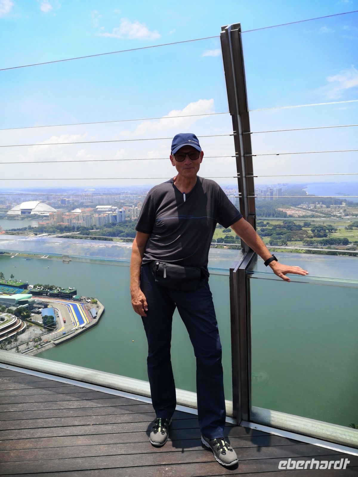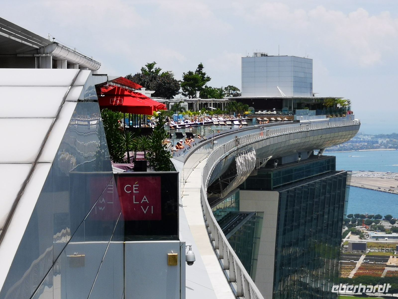 Sehr beeindruckend war für uns auch die Marina Bay mit dem Marina Bay Sand Hotel. Wir hatten Lust hoch zu fahren auf die Aussichtsterrasse, dass sich hoch oben auf dem quer liegenden Schiff befindet. Neben Bars befindet sich hier oben auch ein großzügiger Pool, der aber nur für Hotelgäste offensteht. Die Aussicht über die Insel Singapore, die imposanten Bauwerke, Buchten und Parks ist von hier oben fantastisch. Man kann von hier oben über die Grenze hinweg nach Malaysia schauen Und mit dem heute gelernten Wissen über die Entstehung und die Trockenlegung der ehemaligen Sumpflandschaft ist das sehr beeindruckend.