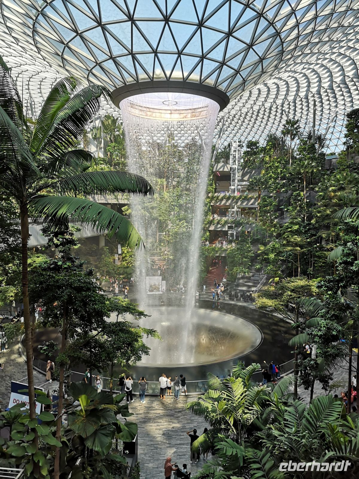 Geschichtlich wenden wir uns auch dem Gründer Singapore zu, dem immer nach sehr präsenten Sir Thomas Stamford Raffles. Er kam 1819 im Auftrag der Britischen Ostindischen-Kompanie an diesen Ort, kaufte das Land vom Sultan von Johor und gründete die erste britische Niederlassung. Von Beginn der ersten Ansiedelung bis heute, ist Singapore bemüht die attraktivste wirtschaftlicher Drehscheibe in der Süd-Ost Asiatischen Welt zu sein. Die wirtschaftliche Kraft für immer neue Landgewinnung und Erstellung der superlativen Architektur, bekommt Singapore durch intensiven Waren- und Finanzhandel für die gesamte Region und von Produktionsstätten kleinstbauender Tele der Elektronik- und Halbleiter Industrie. Auch der Tourismus ist eines der wirtschaftlichen Standbeine, deshalb tut man hier viel um Reisende für einen Stopover zu gewinnen. Der Changi Flughafen, den wir für unseren Weiterflug, am späten Nachmittag aufsuchen, ist der attraktivste und am besten organisierte Flughafen der Welt. Eine hervorragende Kommunikation gehört zum wirtschaftlichen Erfolg Singapore, somit war das Telefonieren und der Internetzugang hier schon immer kostenlos für jeden Besucher. Wir wollen uns noch eine jüngere Attraktion am Changi Airport anschauen, das Juwel. Ein Terminal das im Design eines riesigen Juwels gebaut ist und wo im Zentrum der runden Halle ein mächtiger Wasserfall in die Tiefe raucht. Umgeben ist der Wasserfall mit einem botanischen Garten, der das Ganze einem Dschungel gleichen lässt. Sehr eindrucksvoll, wie die gesamte Stadt. Wir sind alle mächtig beeindruckt, auch wenn man schon mal hier war, es gibt immer wieder etwas Neues zu entdecken.
