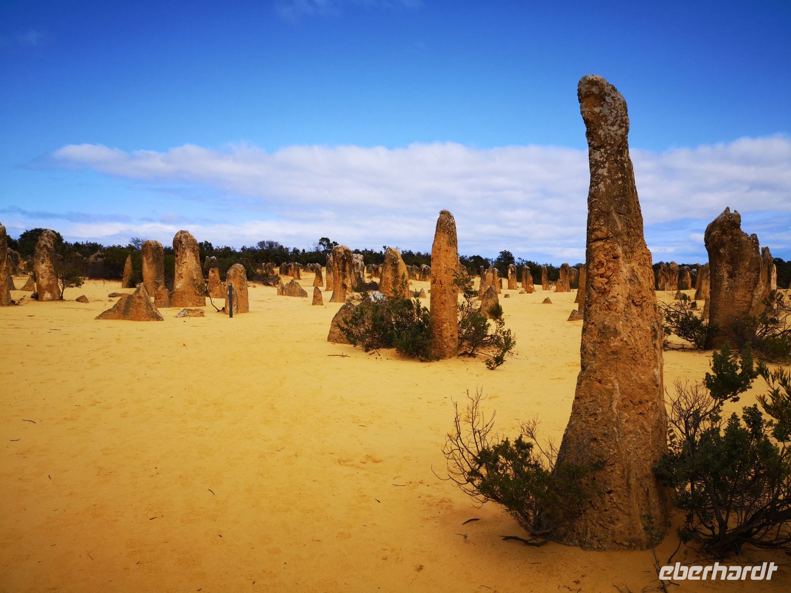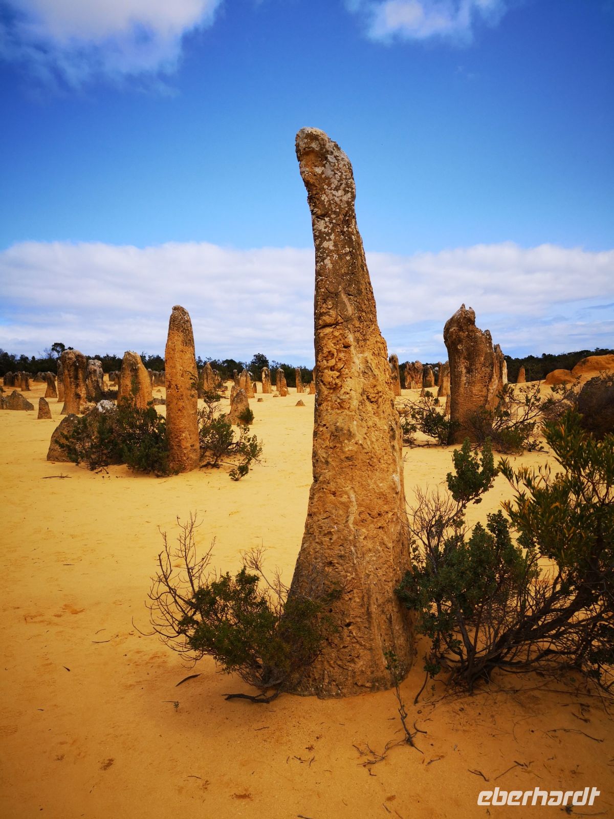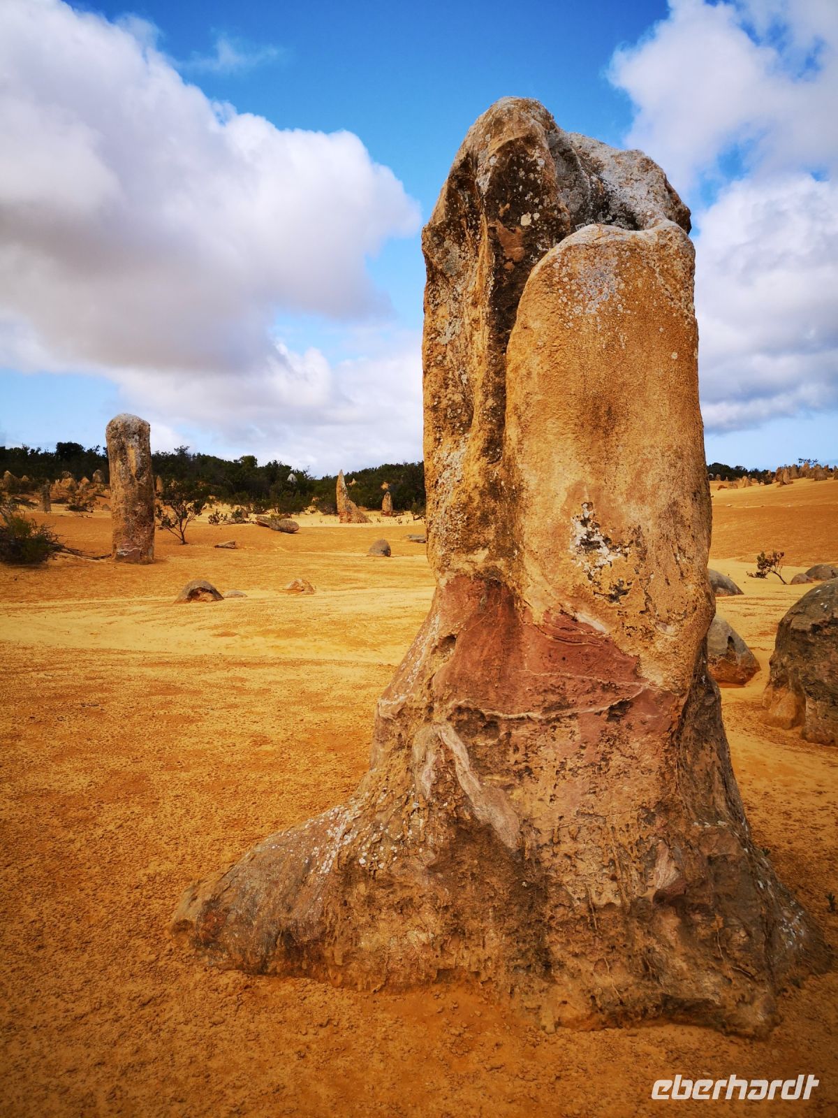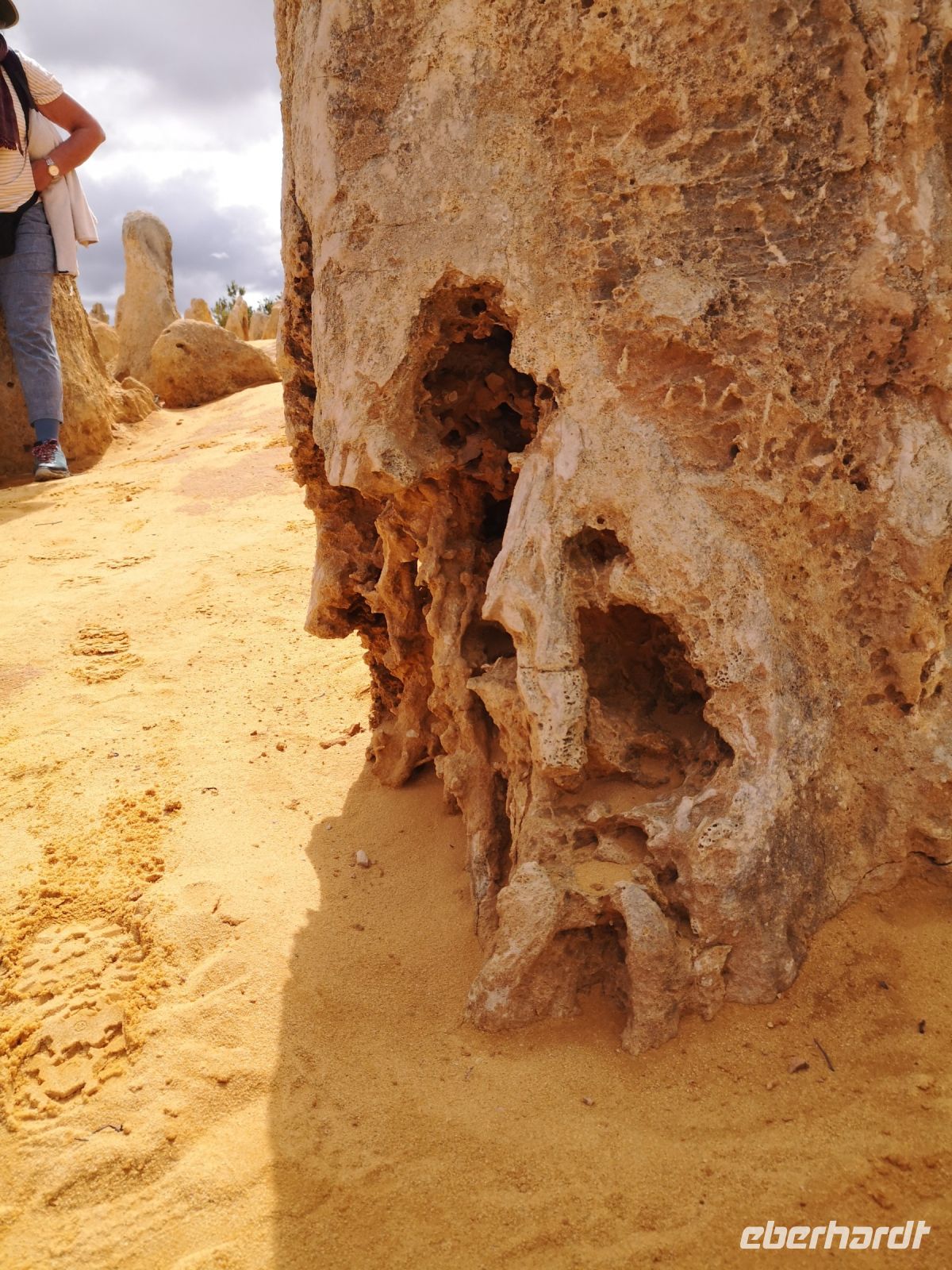 Nach gut 2,5 Stunden erreichen wir den Pinnacle Park, der verblüfft mit unzähligen Säulen aus massivem Gestein, teilweise bis zu 5 Meter hoch. Unser Pedro kennt sich hier aus, und zeigt uns wie die Gesteinssäulen entstanden sind. Durch einen hohen Bestandteil an Kalk und Sand in der Erde, hat sich dieses Gemisch, um die Wurzeln von Büschen und in Verbindung mit Wasser, zu einem Art Gips verbunden. Die Wurzeln dienten als Halterung für das Sand/Kalk Gemisch solange bis der Wind die Mischung trocknete und später den losen Sand im Umfeld der ausgehärteten Säulen wegblies. Übrig blieben diese mächtigen Pinnacle, die nun frei in der Landschaft stehen. Durch die unterschiedliche rot-gelb Färbung des verbackenen Sands, zeigt sich diese Landschaft mit einer Vielzahl an Ockertönen, verstärkt durch die Mittagssonne und deren harten Schattenschlag.