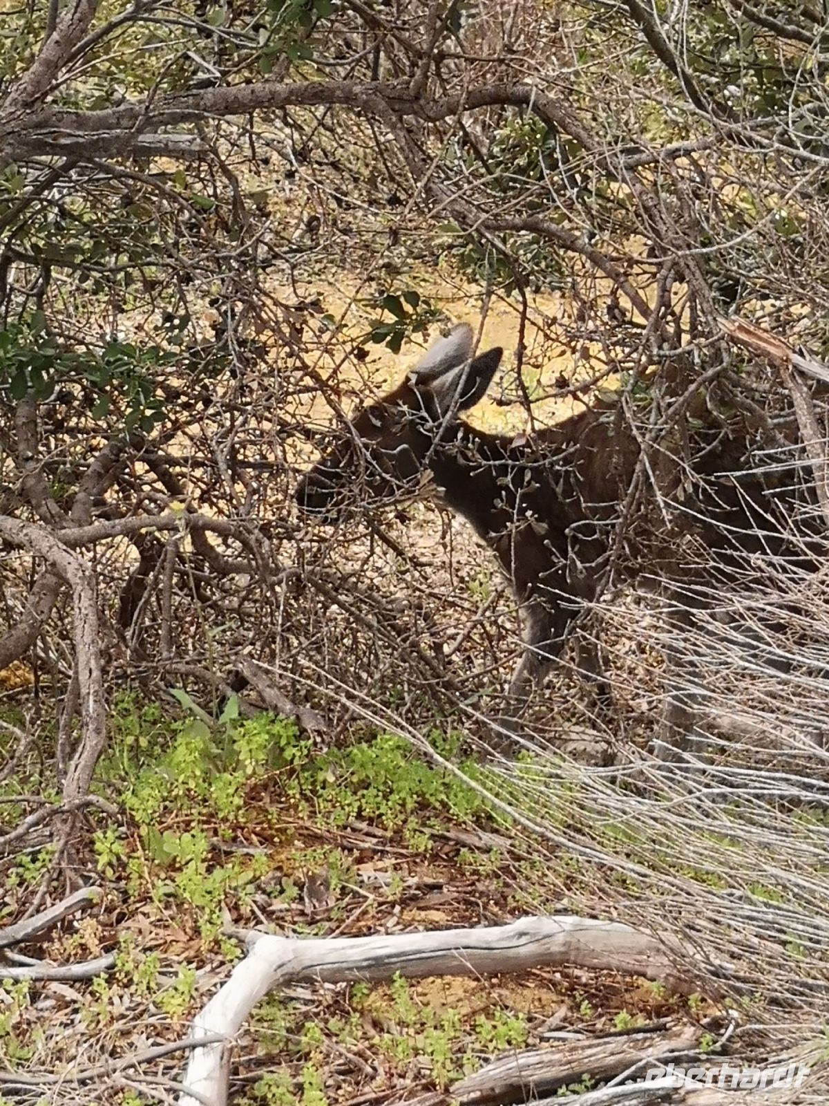 In dieser trockenen, kargen Landschaft entdecken wir ein scheues Känguru, versteckt in dichtem Gestrüpp.