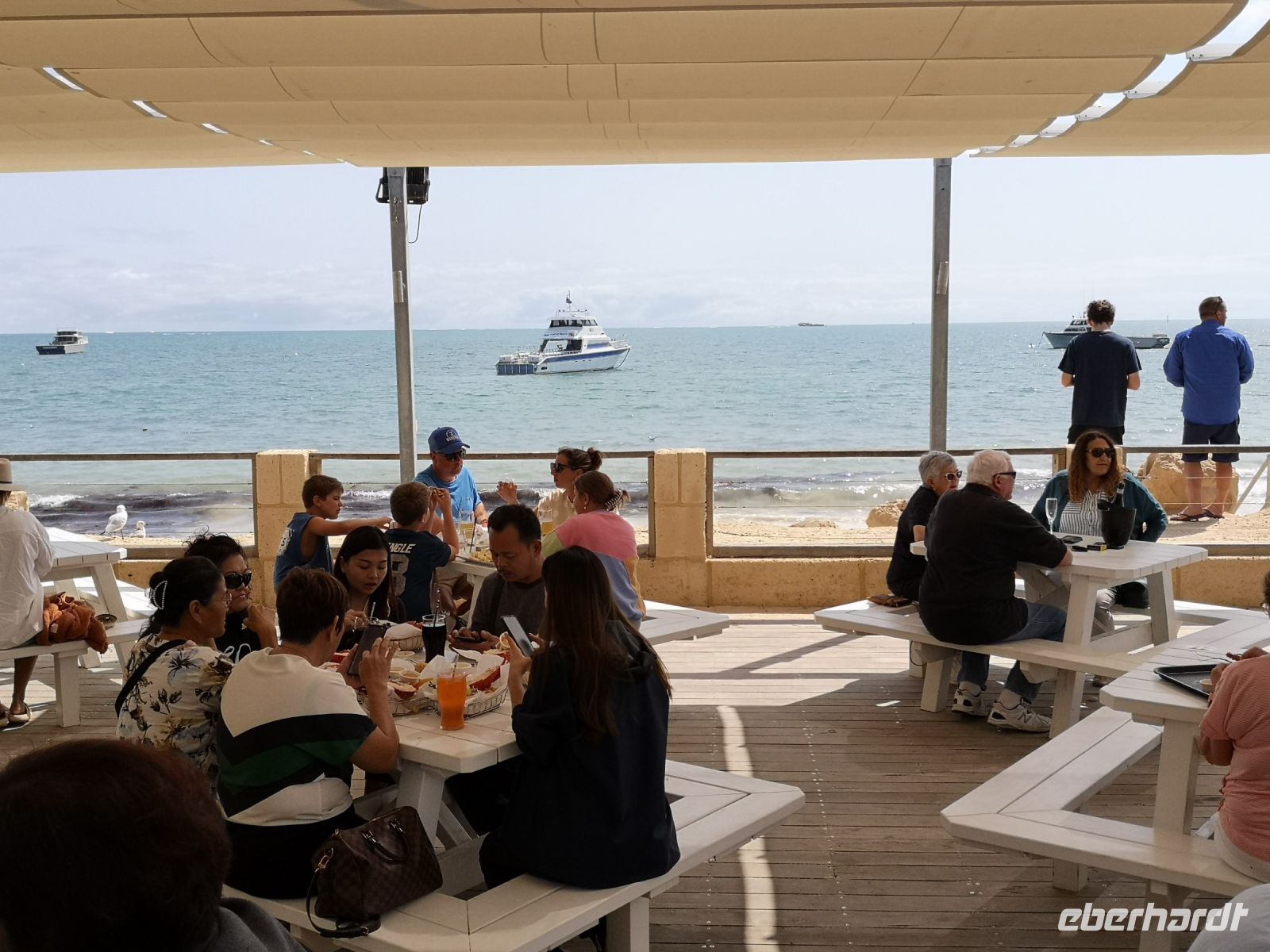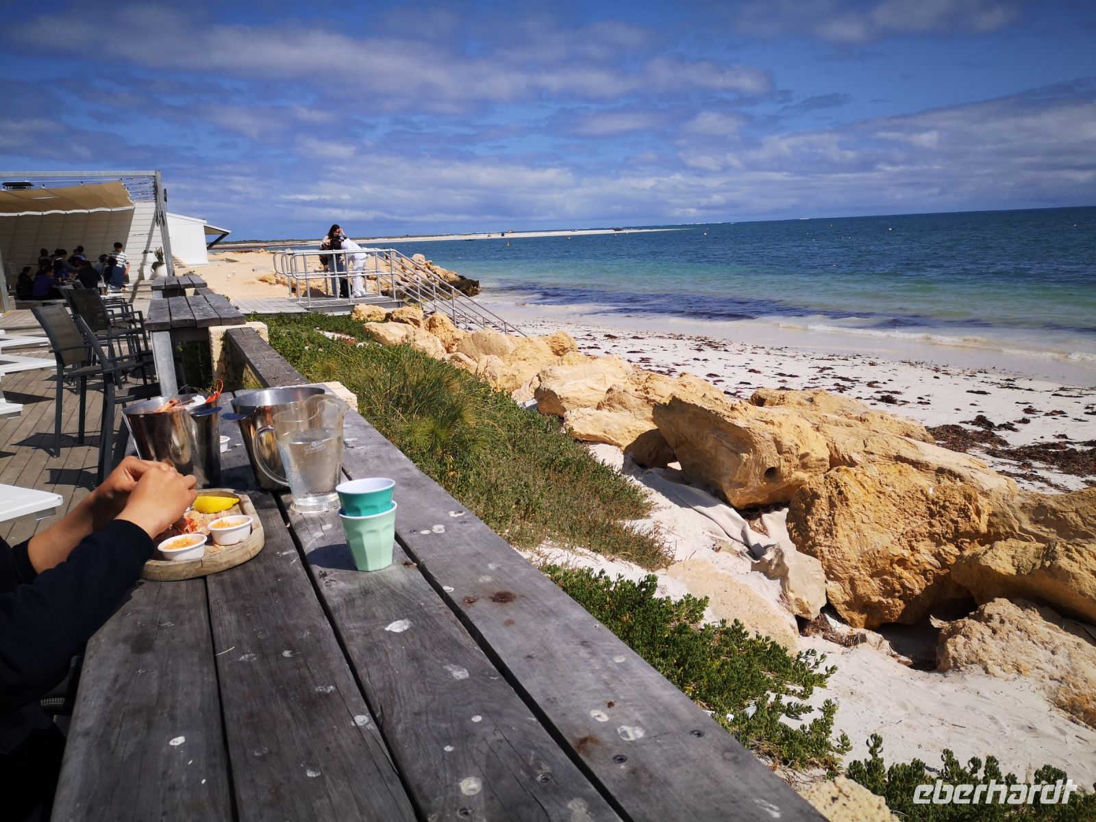 Wir befinden uns nicht weit entfernt von der Küste, wo sich der Ort Cervantes, ein kleines Fischerdorf, angesiedelt hat. Dort direkt an der Küste gelegen, in der Lobster Shack, gehen wir zum Mittagessen. Im Freien sitzend, unter Schattenspendern, mit Blick auf das offene Meer, gibt es Fisch und Lobster. Das ist ein schöner Kontrast zu dem trockenen Hinterland wo die Pinnacle wachsen.