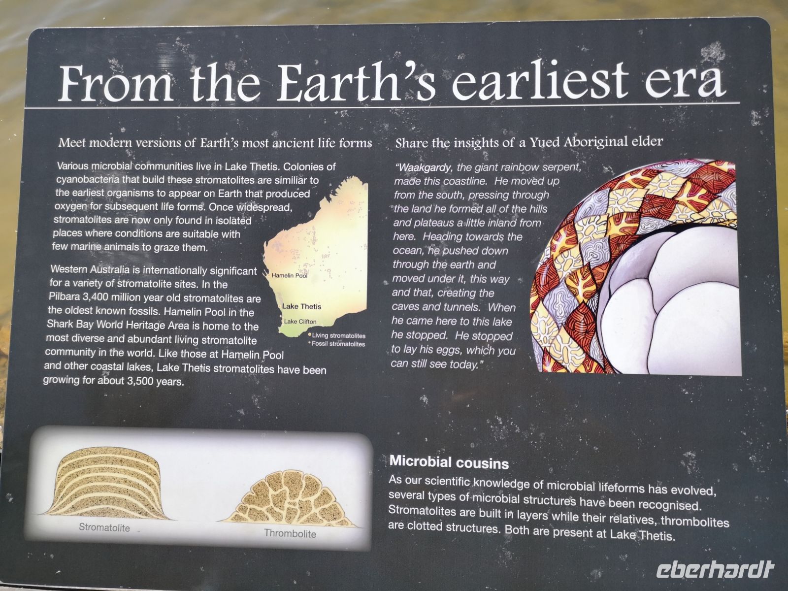 Pedro führt uns anschließend zum Lake Thetis, der bei Geologen dafür bekannt ist hier das Entstehen von Stromatolithen „beobachten“ zu können. Sie entstehen in Salzseen und während ihres Wachstums und dem damit verbundenen chemischen Prozess, bildet sich Sauerstoff. Sie sorgten damit, in der frühen Geschichte unserer Erde, für die Anreicherung der Erdatmosphäre mit Sauerstoff und dadurch für die Entstehung weitern Lebens. Jetzt mussten wir doch tatsächlich bis hierherreisen, um von diesem Phänomen zu erfahren, wie man sagt: „Reisen bildet“.