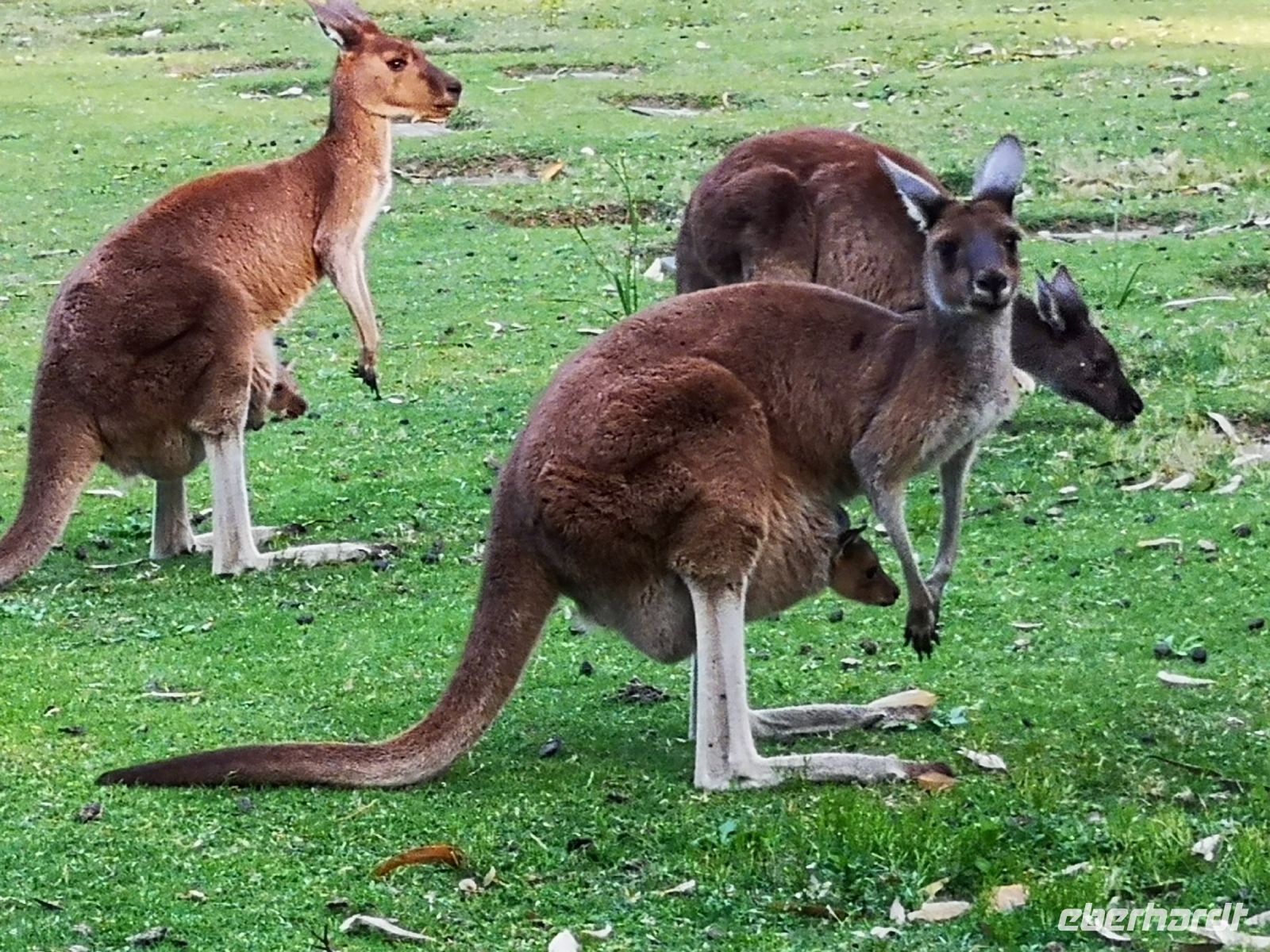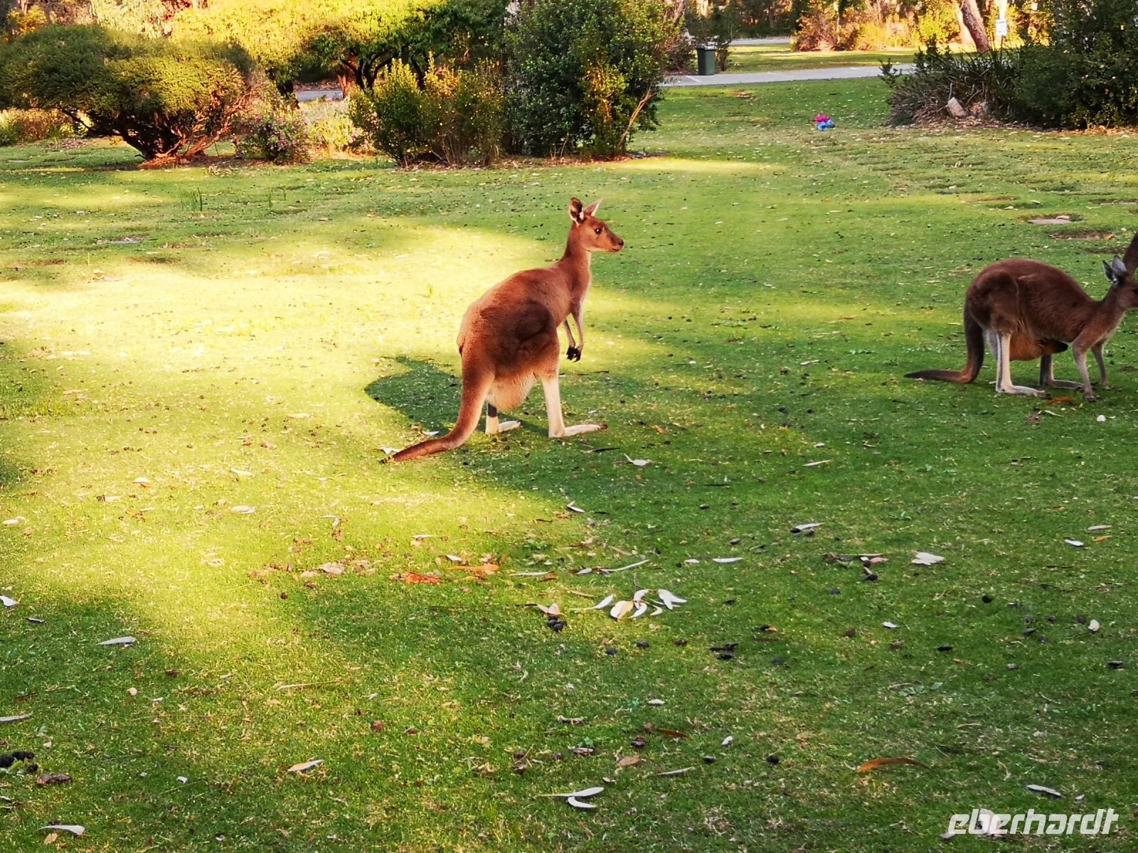 Auf dem Rückweg nach Perth hatte Pedro noch eine Überraschung für uns. Er wusste von einem Friedhof, einem weitläufigen Memorial Park, in einem abgelegenen Vorort von Perth von der eigenständigen Ansiedelung mehrerer Känguru Familien, die es sich auf dem Rasen der Parkanlage gut gehen lassen. Das es ihnen gut geht und sie sich hier wohl fühlen, zeigt die Tatsache, dass aus mehreren den Beuteln der Weibchen, der Nachwuchs neugierig in die Welt schaute.