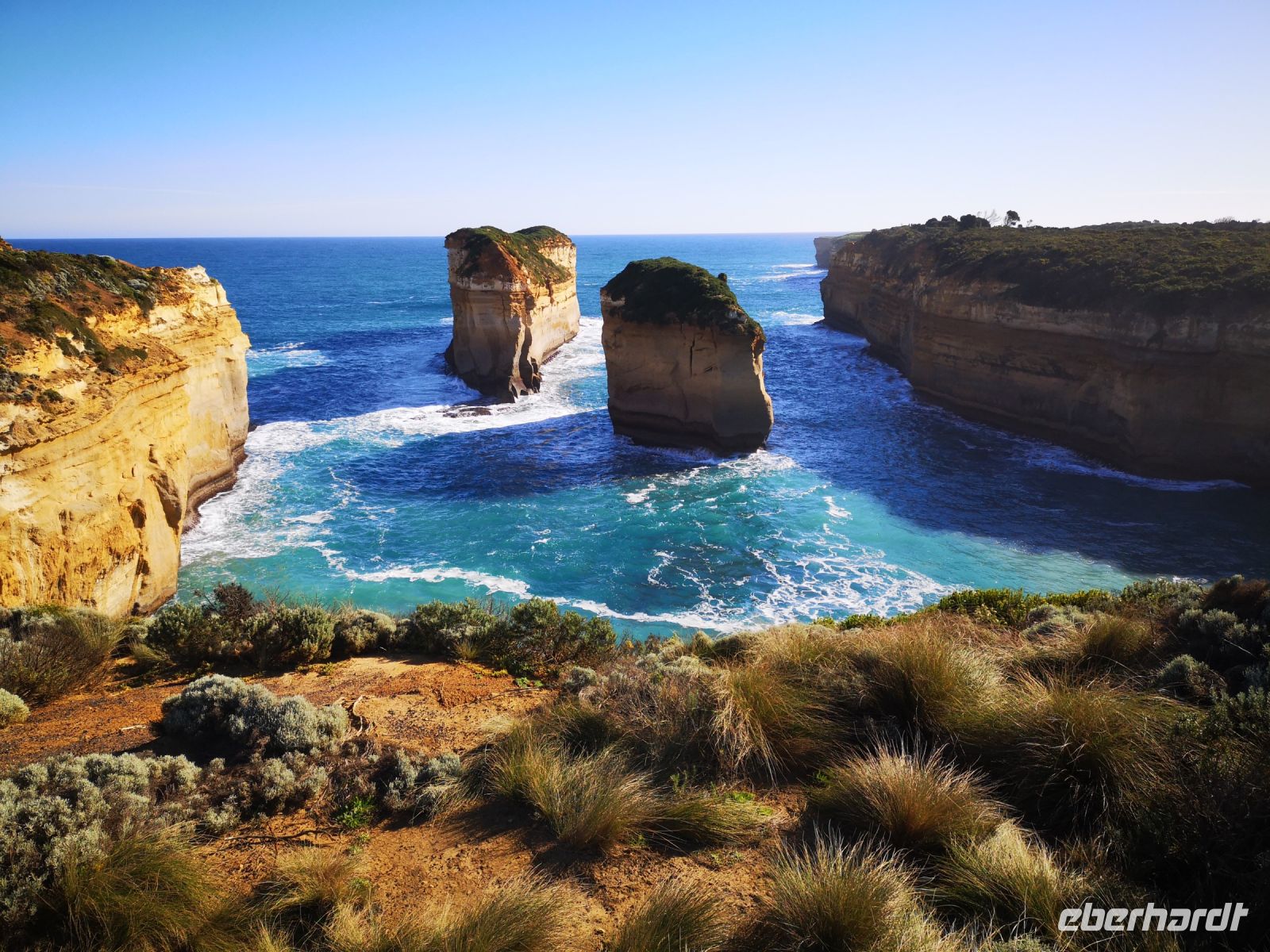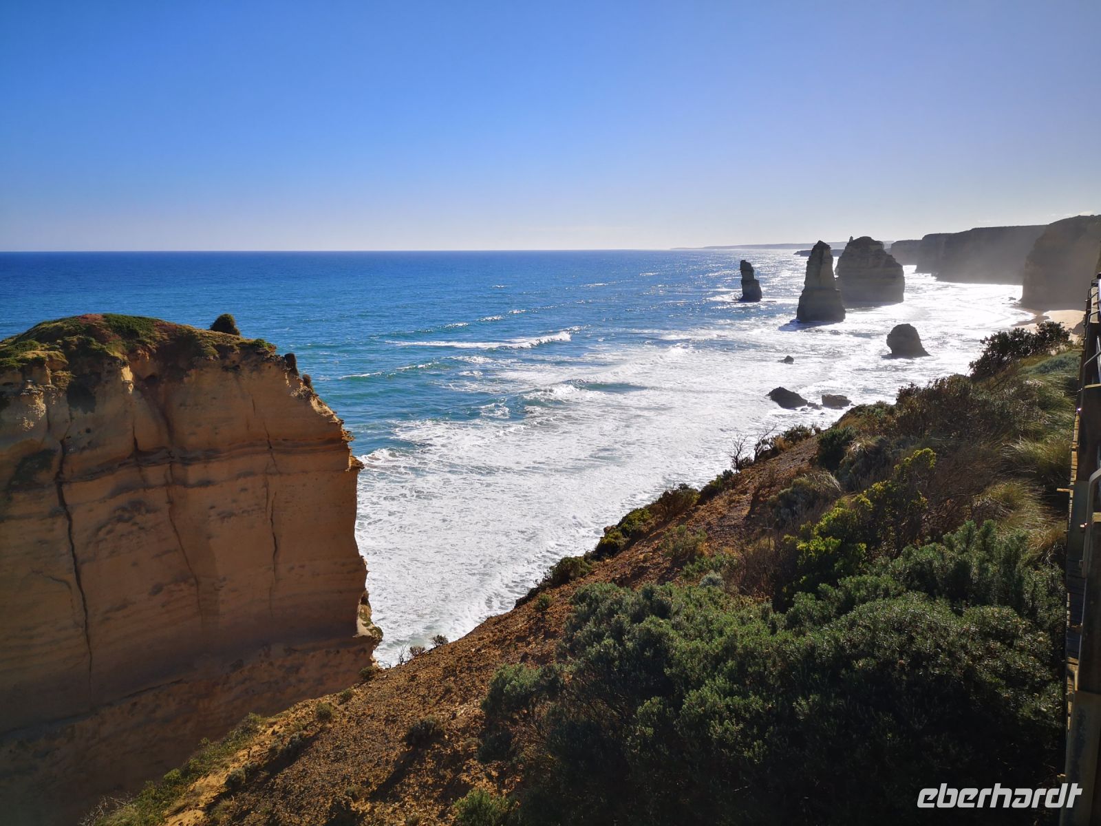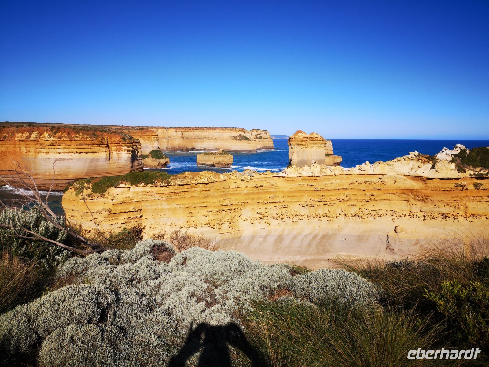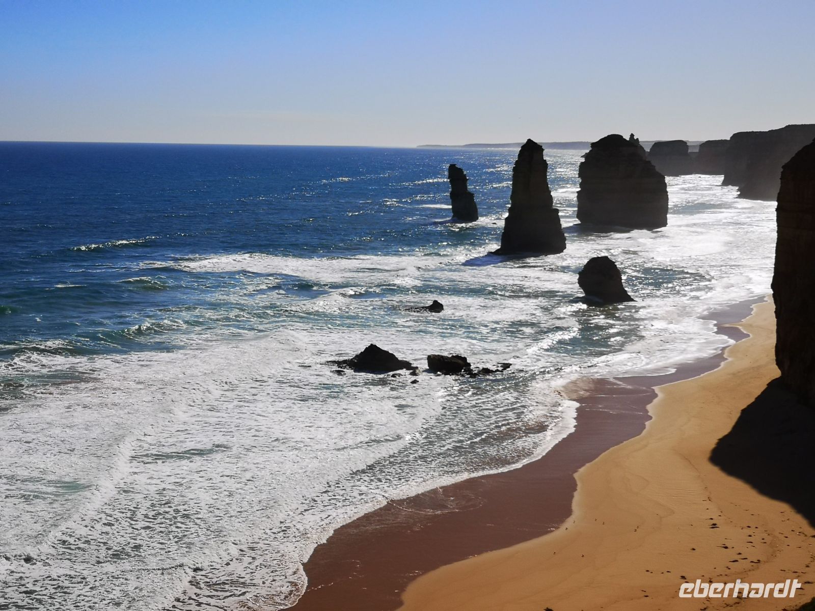 Das nächste Ziel sind die Zwölf Apostel. Die abgesetzt im Wasser stehenden Steinsäulen waren ursprünglich Bestandteil der steilen Klippen, aber durch mehrere 10.000 Jahre Erosion wurden sie freigesetzt und abgetrennt vom Festland.