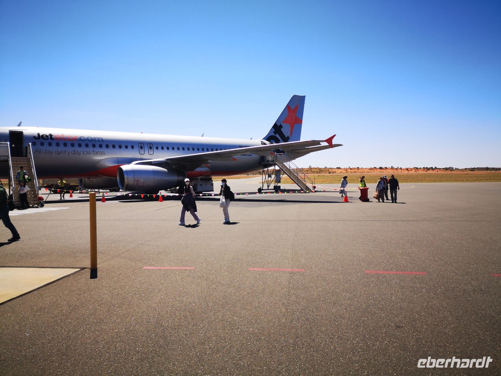 Nach einem spannenden Self-Check-In bei der Airline JetStar, besteigen wir die Boing 737 und landen knapp 3 Stunden später in Uluru auf der Outback Piste mitten im Nirgendswo. Gäbe es hier nicht den berühmten Ayes Rock, heute benannt mit dem ursprünglichen Namen Uluru, würden hier sicher keine Flugzeuge landen. Hier ist alles überschaubar. Wir landen direkt neben dem Flughafengebäude, gehen zu Fuß dort hinein, direkt über die Landebahn. Innen gibt es nur ein kurzes Gepäckband und Eva unsere lokale Reiseleiterin wartet auch schon direkt neben der Gepäckausgabe. Hier kann man sich nicht verfehlen.