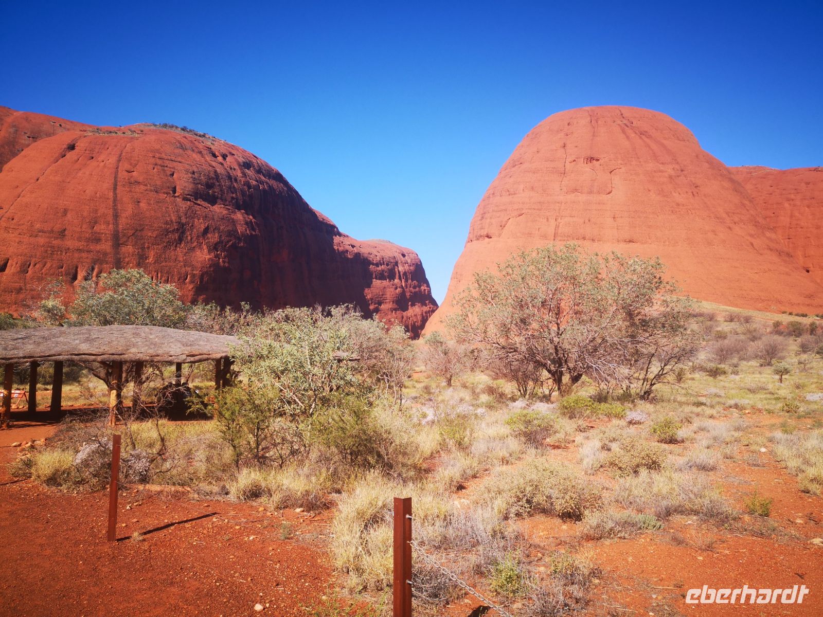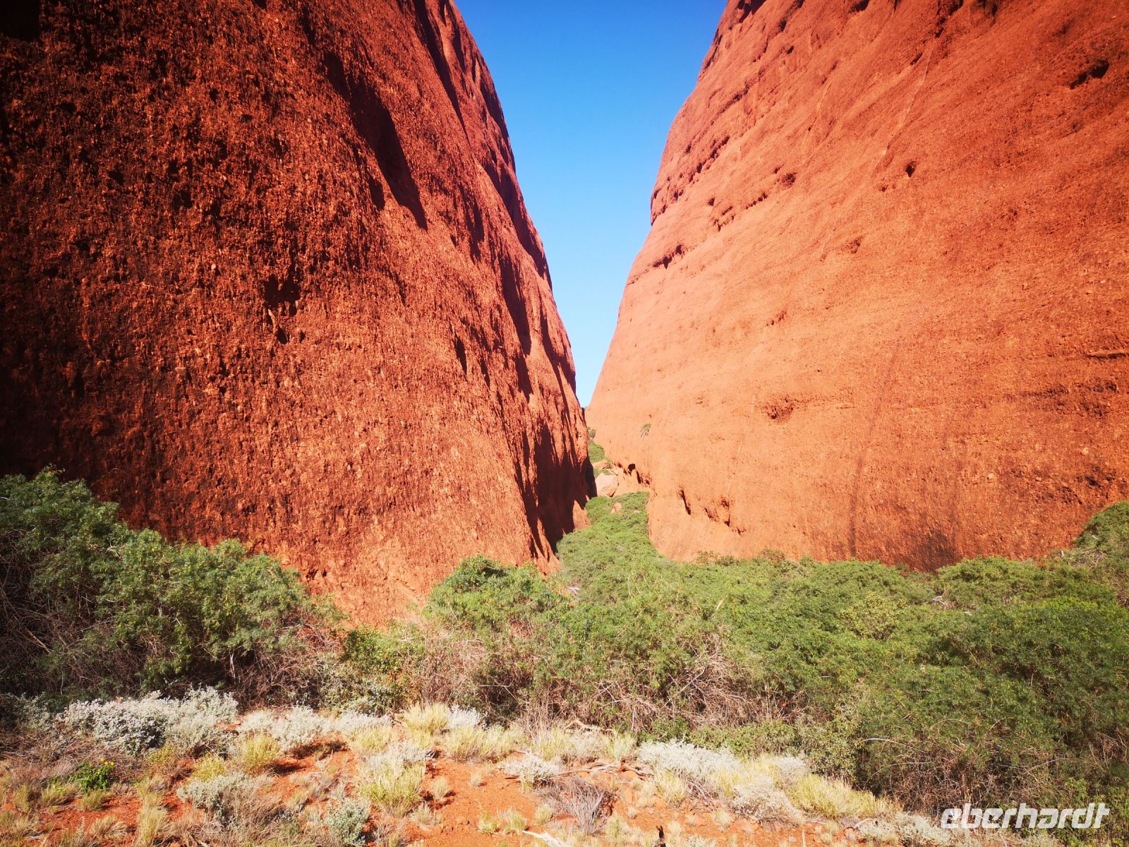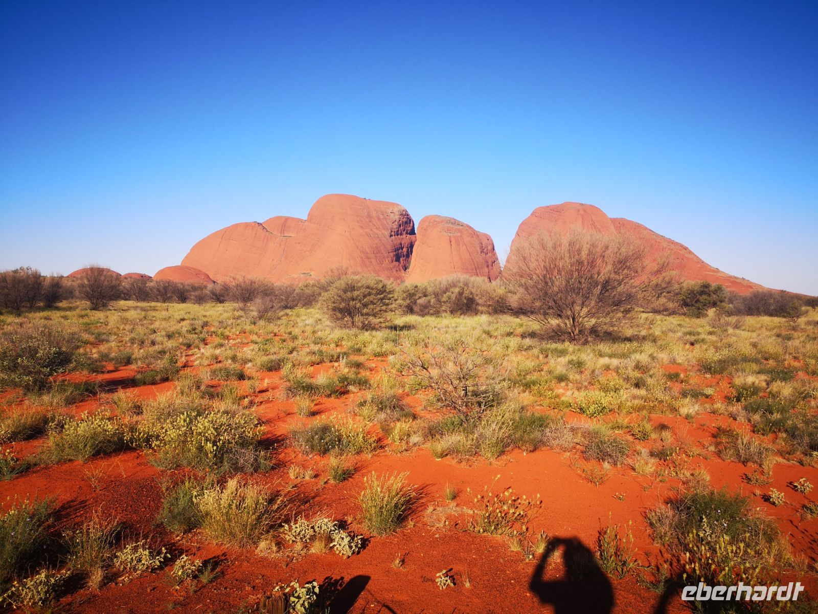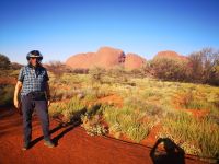 Etwas abseits des großen heiligen Berges befinden sich die Kata Tjutas. Große, ca 100 Meter hohe, runde Felsen mit ausgespülten Mulden, geben dem roten Felsen einmalige Form und Gestalt. Durch Schluchten kann man zwischen den Felsen hindurch gehen und unterstützt durch die extremen Schatten der beißenden Sonne, von verschiedenen Blickwinkeln, immer wieder neue Formationen und Bilder entdecken.