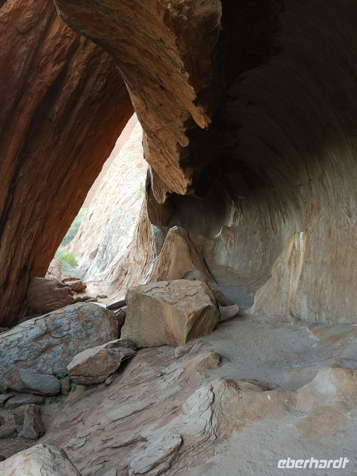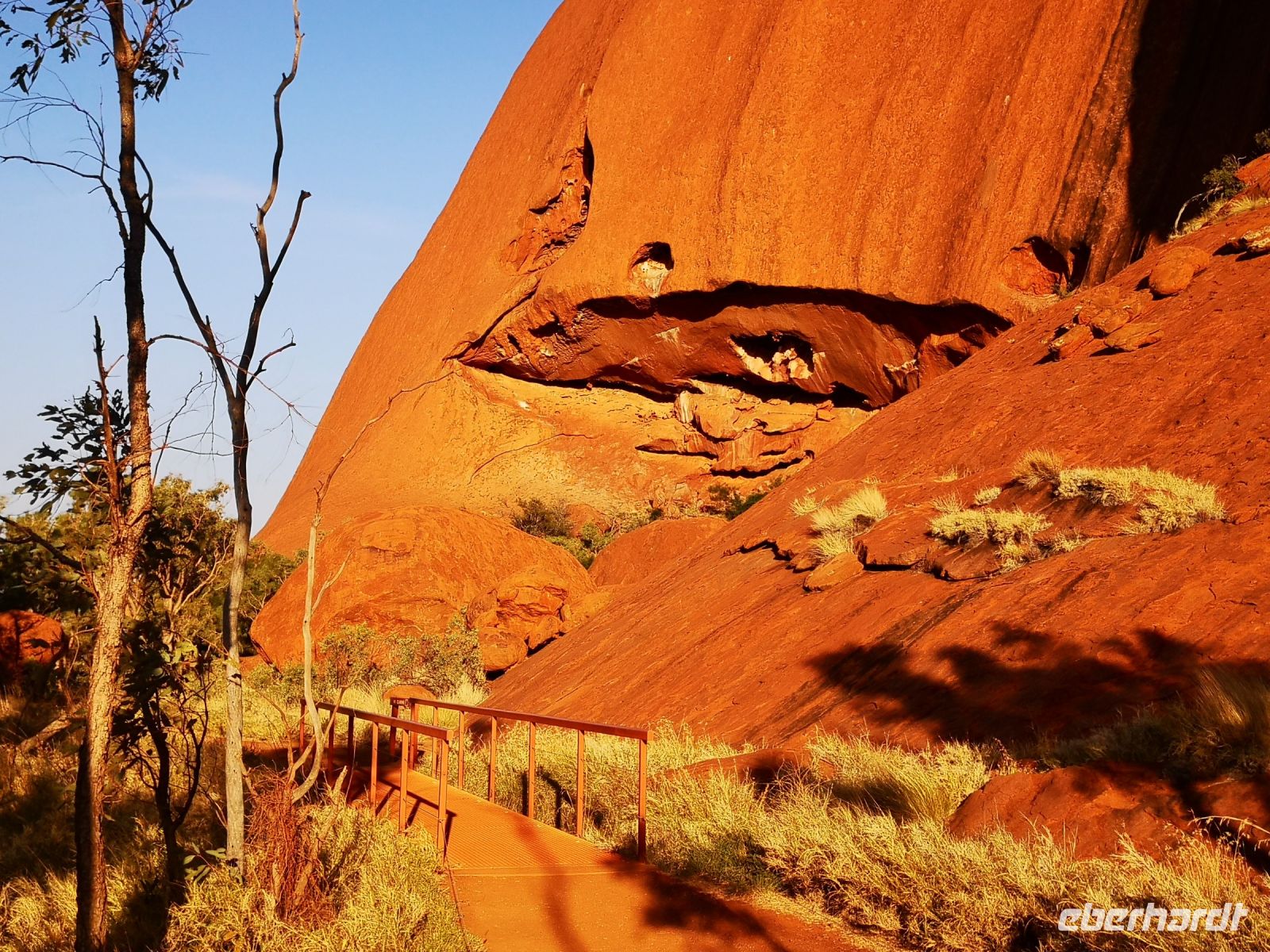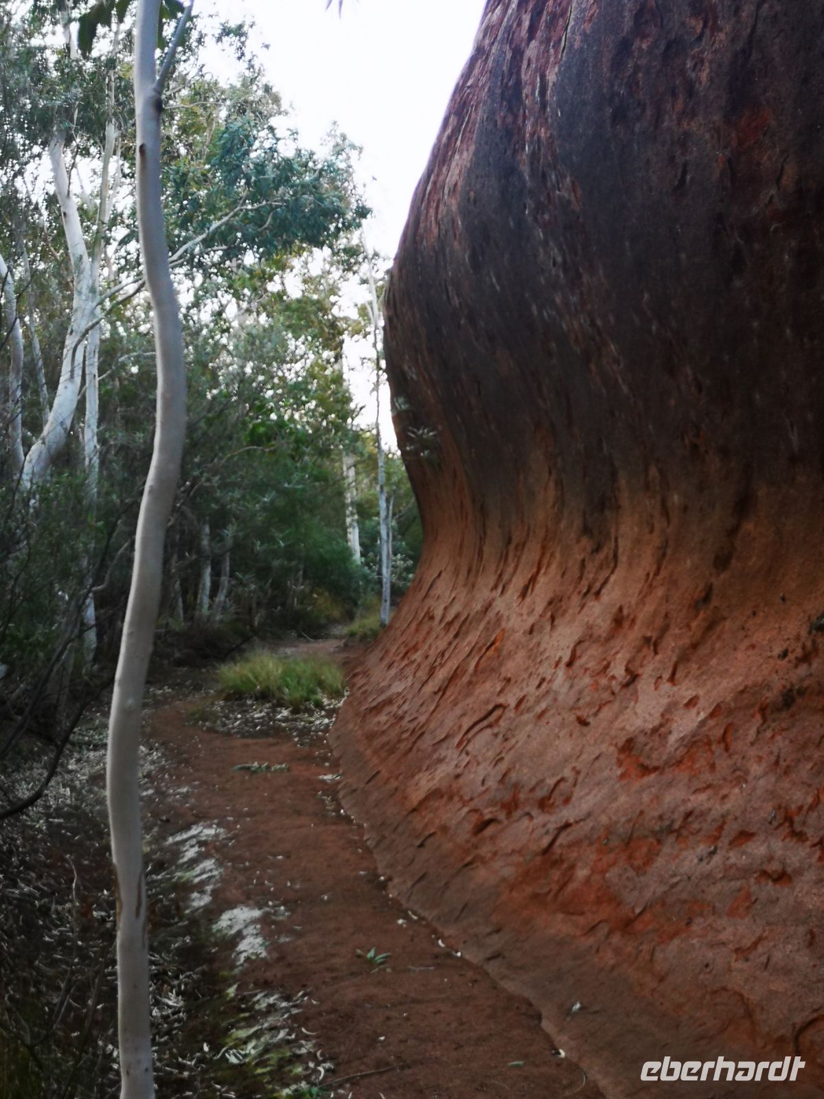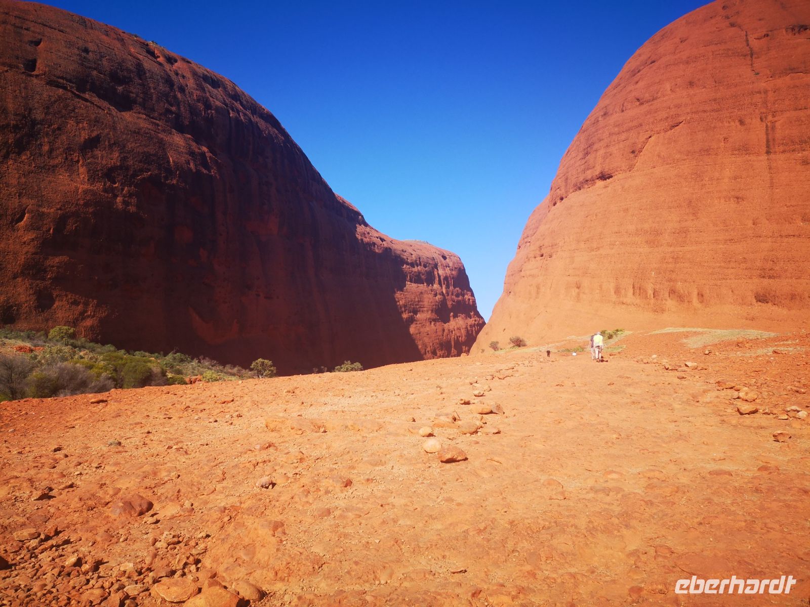 Etwas abseits des großen heiligen Berges befinden sich die Kata Tjutas. Große, ca 100 Meter hohe, runde Felsen mit ausgespülten Mulden, geben dem roten Felsen einmalige Form und Gestalt. Durch Schluchten kann man zwischen den Felsen hindurch gehen und unterstützt durch die extremen Schatten der beißenden Sonne, von verschiedenen Blickwinkeln, immer wieder neue Formationen und Bilder entdecken.
