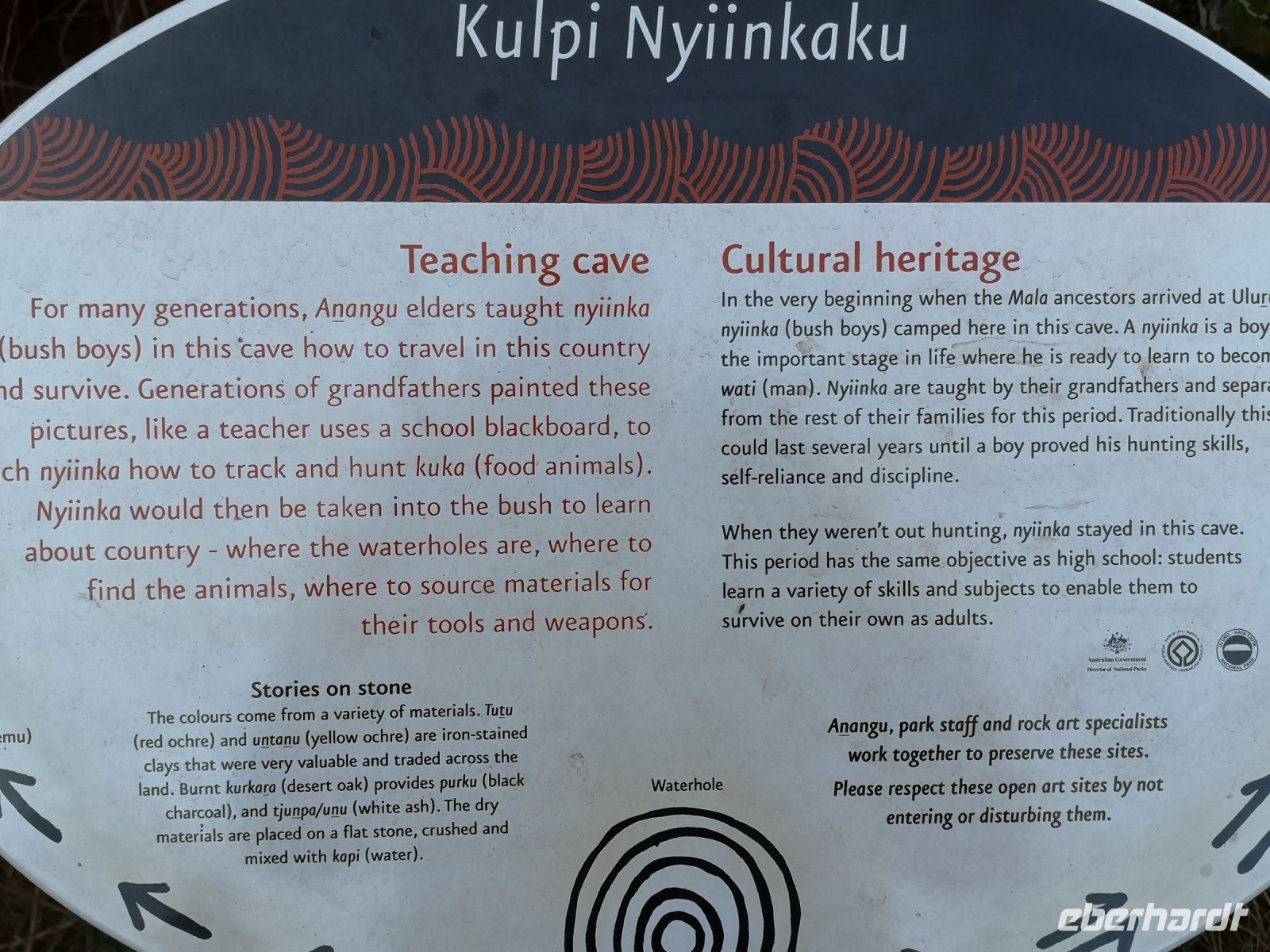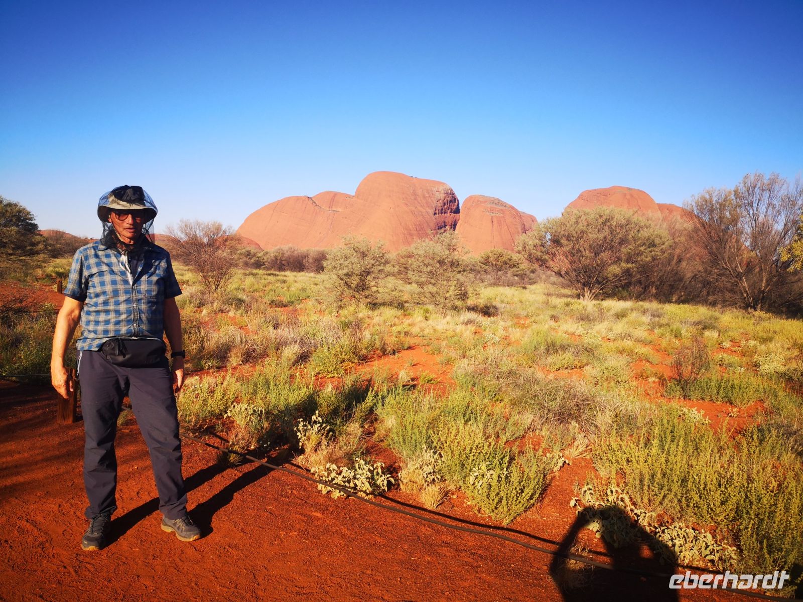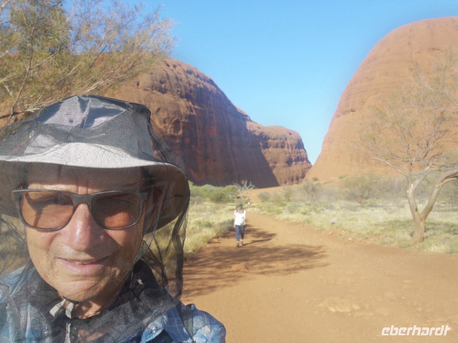 Eva ist Österreicherin, lebt seit vielen Jahren im Outback und fast 10 Jahre in Alice Springs, und weis wann und wie man an welchen Ort geht, um mit den Extremen wie Sonne, Wind, Hitze und Kälte und nicht zu unterschätzen die Trockenheit zurechtkommt. Bei Luftfeuchtigkeit von ca. 10% verliert der Körper sehr schnell viel Wasser ohne das man schwitzt. Das Mitführen von Wasser ist hier unabdingbar. Aus diesem Grund hat Jim unser Busfahrer einen großen Wassertank im Gepäckfach, wo jeder von uns seine Trinkflasche nachfüllen kann. Um länger in dieser Umgebung zu verweilen sind 3 Liter Wasser pro Tag das Minimum. Man spürt wie Nase und Lippen austrocknen.