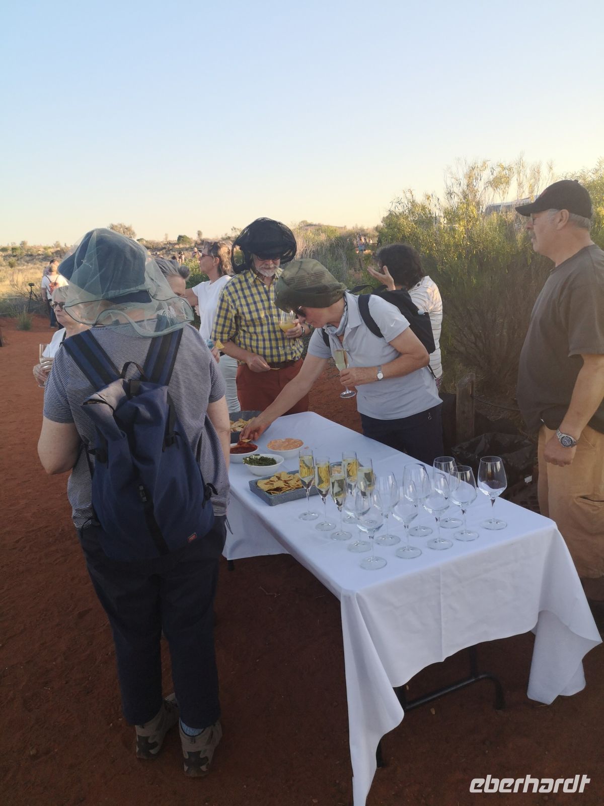 Gegen 18:00 Uhr finden wir uns am Sunset Point ein, von wo aus wir den Sonnenuntergang und dessen Wirkung auf den Uluru beobachten und natürlich fotografieren wollen. Um diesen besonderen Moment, wofür wir unteranderem hierhergereist sind, gebührend feiern zu können, wird für uns ein kleiner Snack und eine improvisieret Outdoor Sekt Bar bereitgestellt.