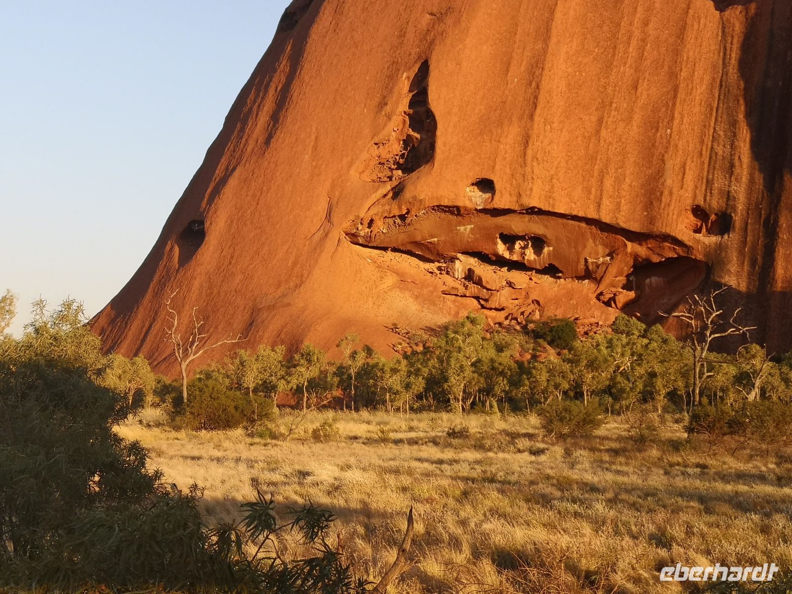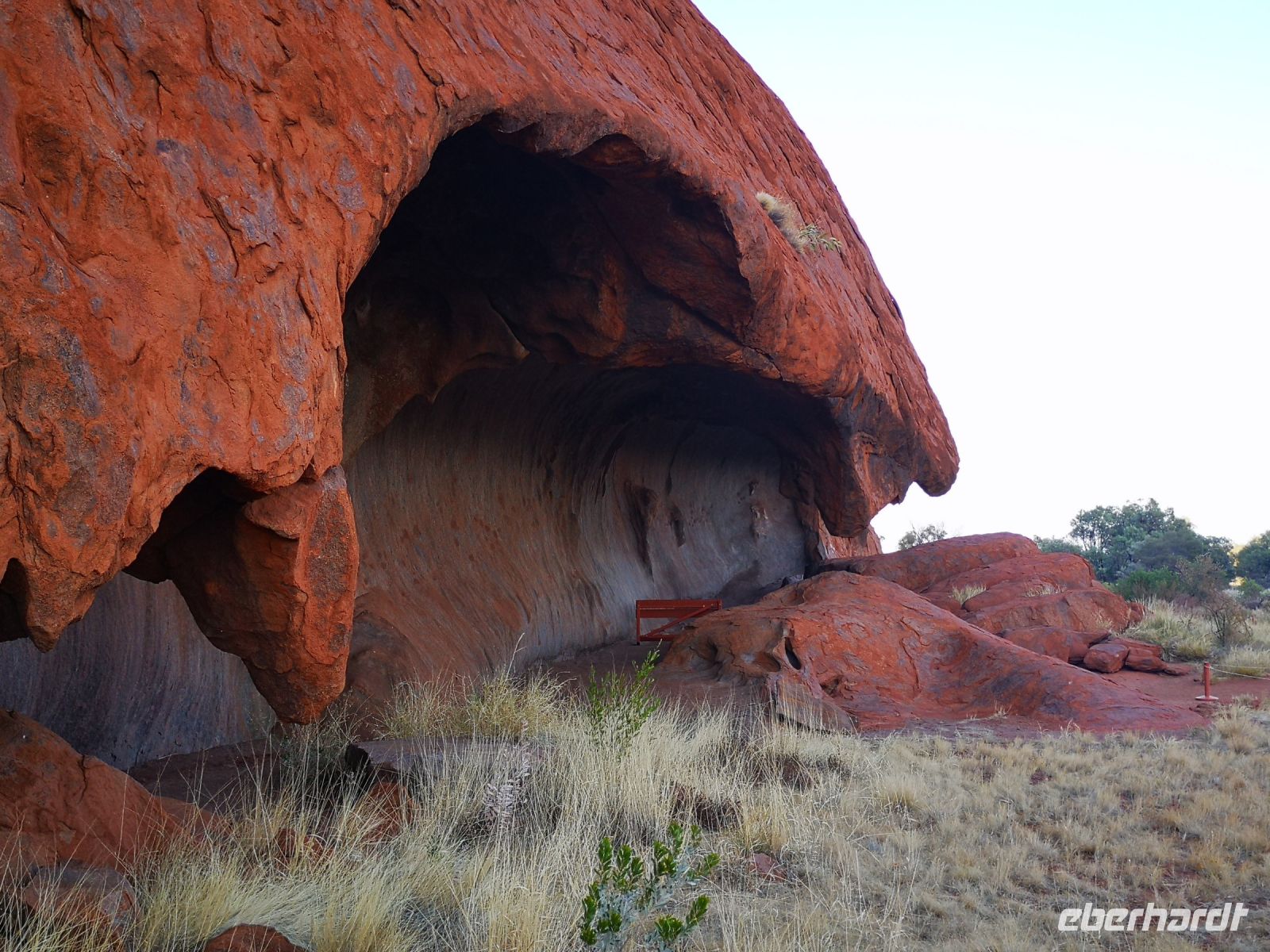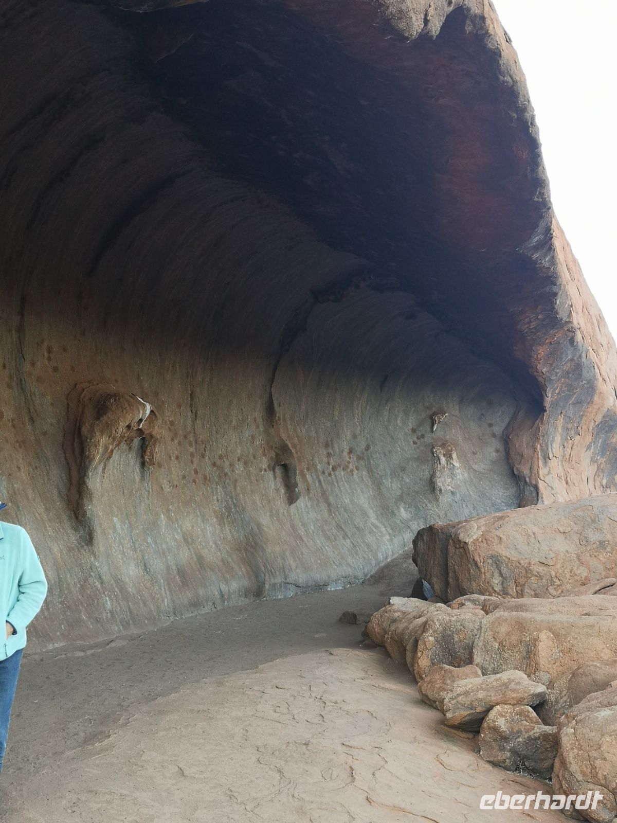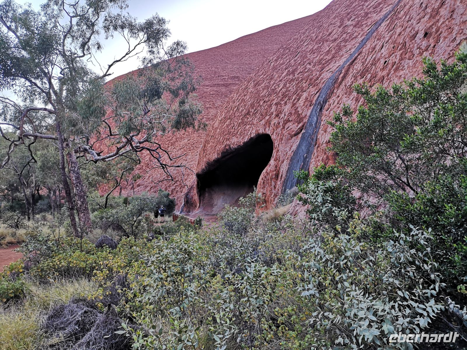Als aller erstes wollen wir an diesem Tag den Sonnenaufgang vor der Kulisse des Uluru bestaunen. Beobachten wie der massive Fels aus der Dämmerung in grauer Farbe auftaucht und sich zunehmend rot färbt. Danach bring uns Eva zu einem Pfad, der uns ganz dicht am Uluru entlangführt. Wir kommen zu Höhlen mit Felsmalereien, Orte an denen die Ureinwohner ihr Wissen und ihre Gesetze an die nächste Generation weitergaben.