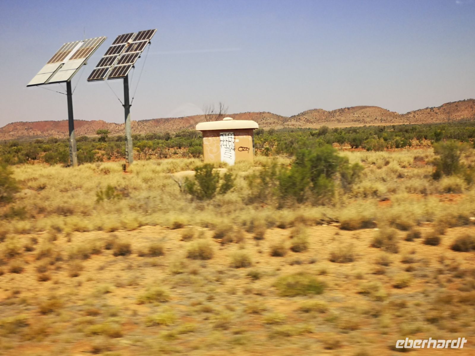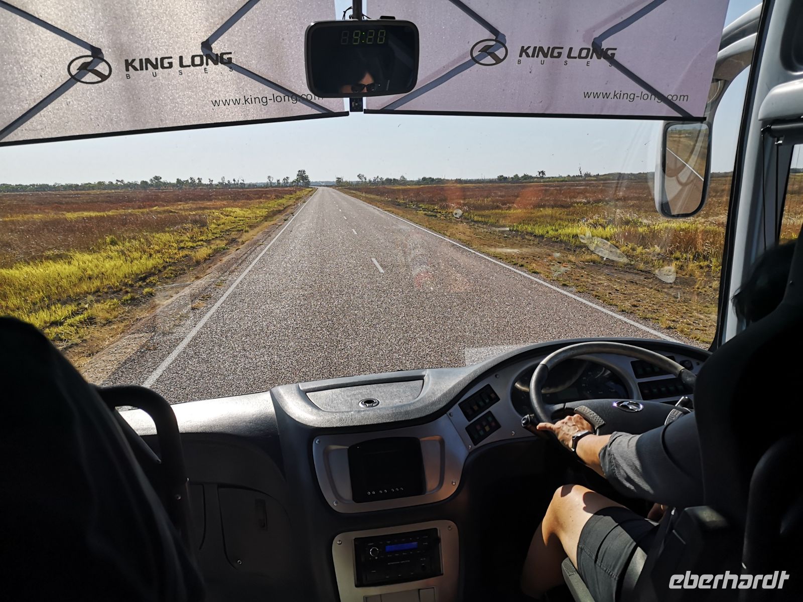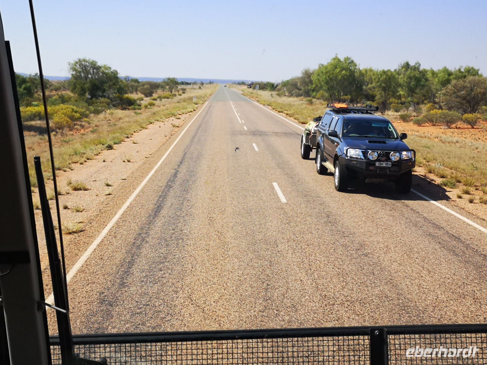 Jim fährt seinen Bus siche,r quer durch das einsame Land, immer bereit zu reagieren, wenn ein Hindernis auf der Straße ist. Sei es verlorene Ladung, Tiere oder liegengebliebene Fahrzeuge. Nach 7 Stunden und 500 km Fahrt durch die Einsamkeit fangen wir an zu verstehen was es heißt im Outback zu leben. Endlose Weite, Trockenheit, die nächste Servicestation 200 km entfernt, dazwischen ist nichts, hier gibt es keinen Handyempfang. Sollte man Hilfe benötigen, ist man auf die wenigen Menschen angewiesen die auf dieser Straße vorbeikommen. Es ist wichtig das man immer einen Wasservorrat mit sich führt, auch wir haben einen Wassertank im Bus.