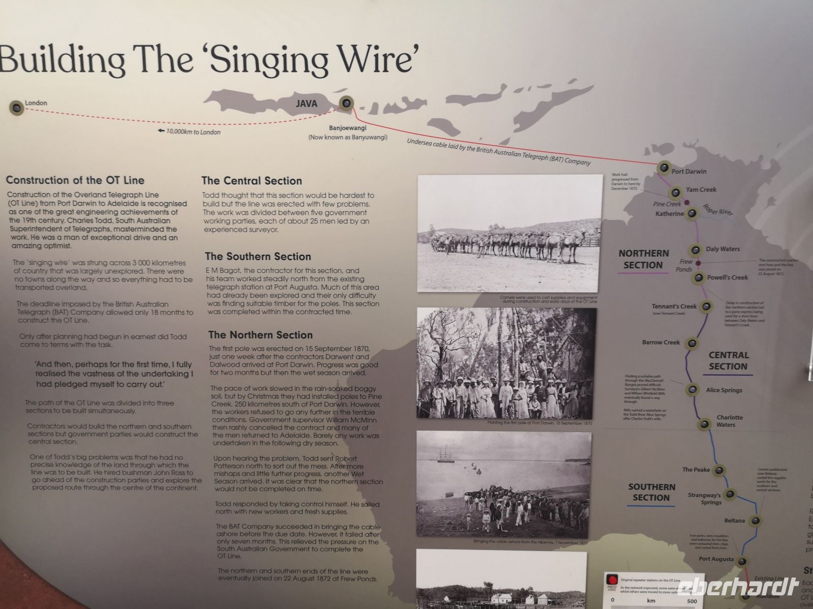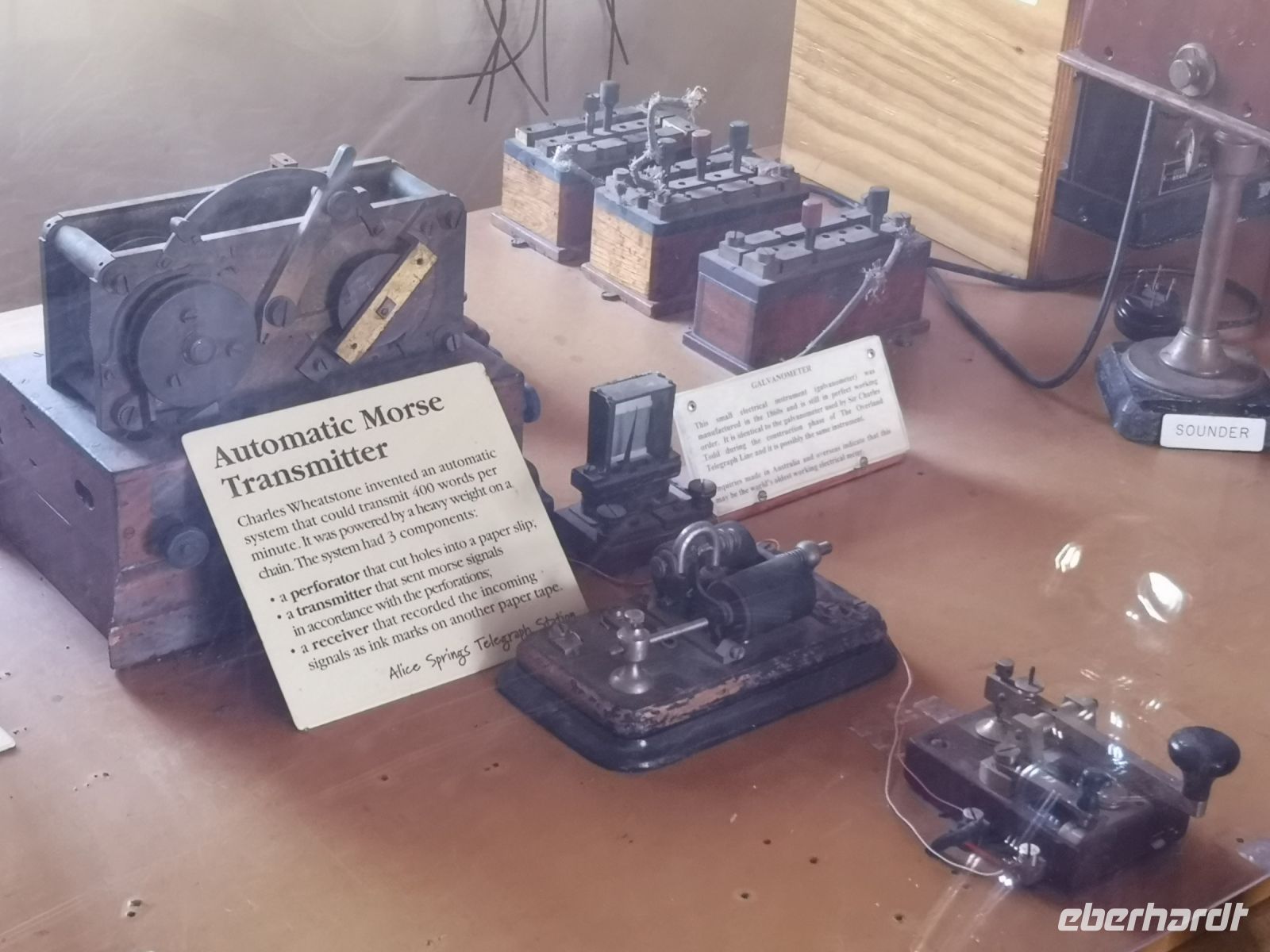 Bevor wir an diesem Abend unser Hotel aufsuchen, schauen wir uns noch das Museum der ehemaligen Telegraphenstation an. Die technischen Geräte machen uns deutlich, welcher Aufwand nötig war um diesen „Singing Wire“ von London, über Java, Port Darwin und dann quer über Land bis Adelaide zu führten. Der Aufwand war enorm groß, jedoch der Nutzen für die Kolonie Australien und Großbritannien waren unermesslich. Ohne diese Kommunikationsverbindung, benötigte eine Botschaft 2 Monate bis sie beim Empfänger ankam, und dieselbe Zeit bis die Antwort zurückkam