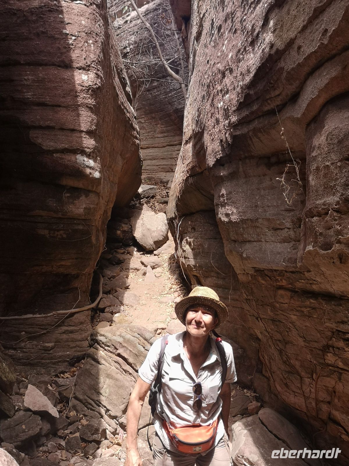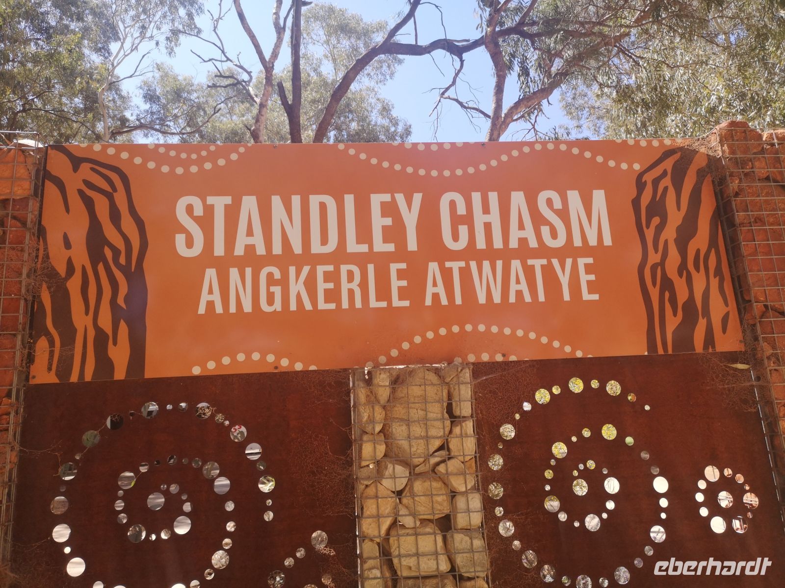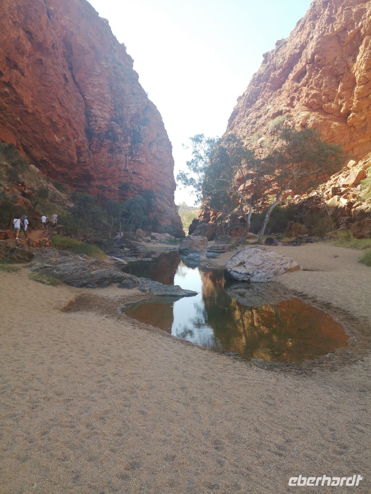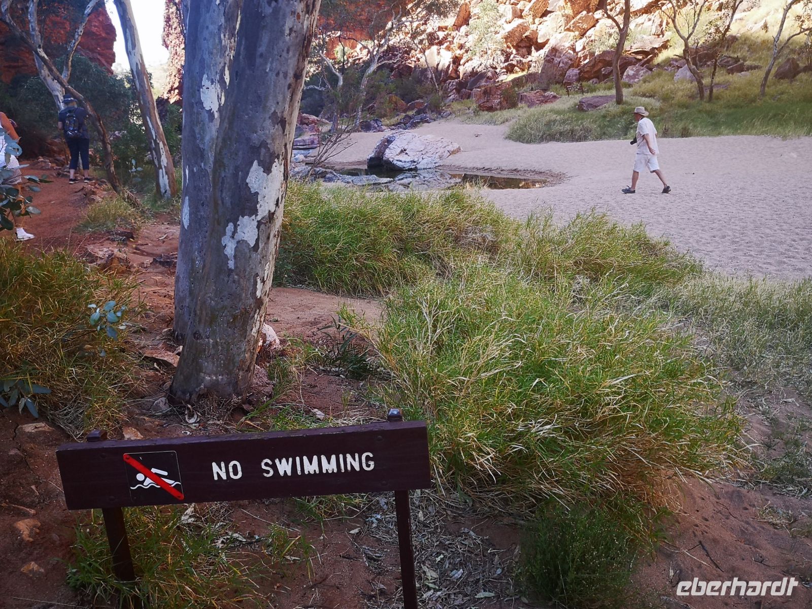 Nach der Mittagspause führt uns Eva zu einer weiteren Naturschönheit der MacDonnell Ranges, zu dem Simpsons Gap. Durch diese Schlucht führt ein Fluss, der jedoch fast nie oberirdisch Wasser führt, aber doch potentiell Wasser führen könnte. Deshalb benötigt es natürlich das behördliche Schwimmverbot, das gut sichtbar am Ufer angebracht ist. :)