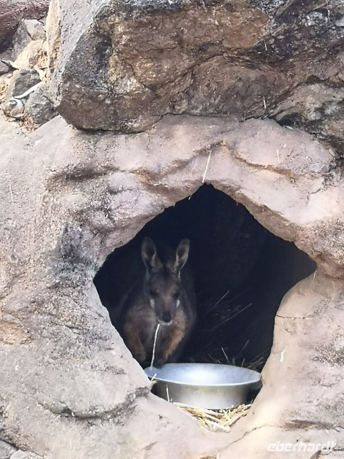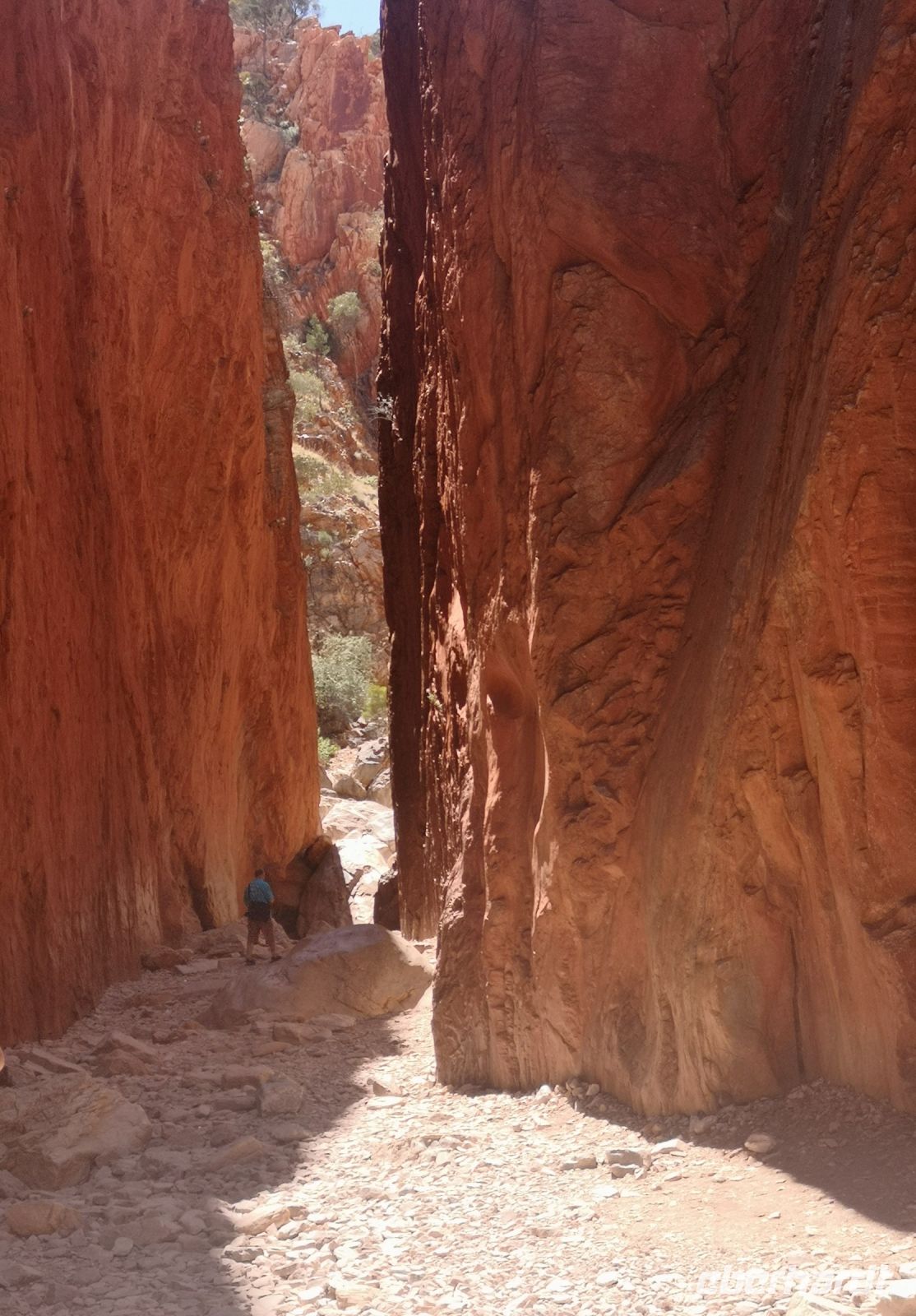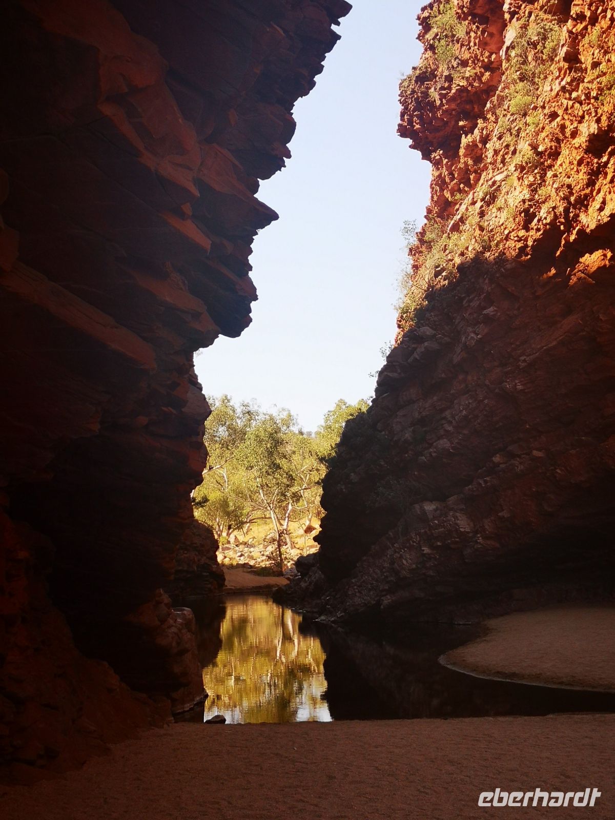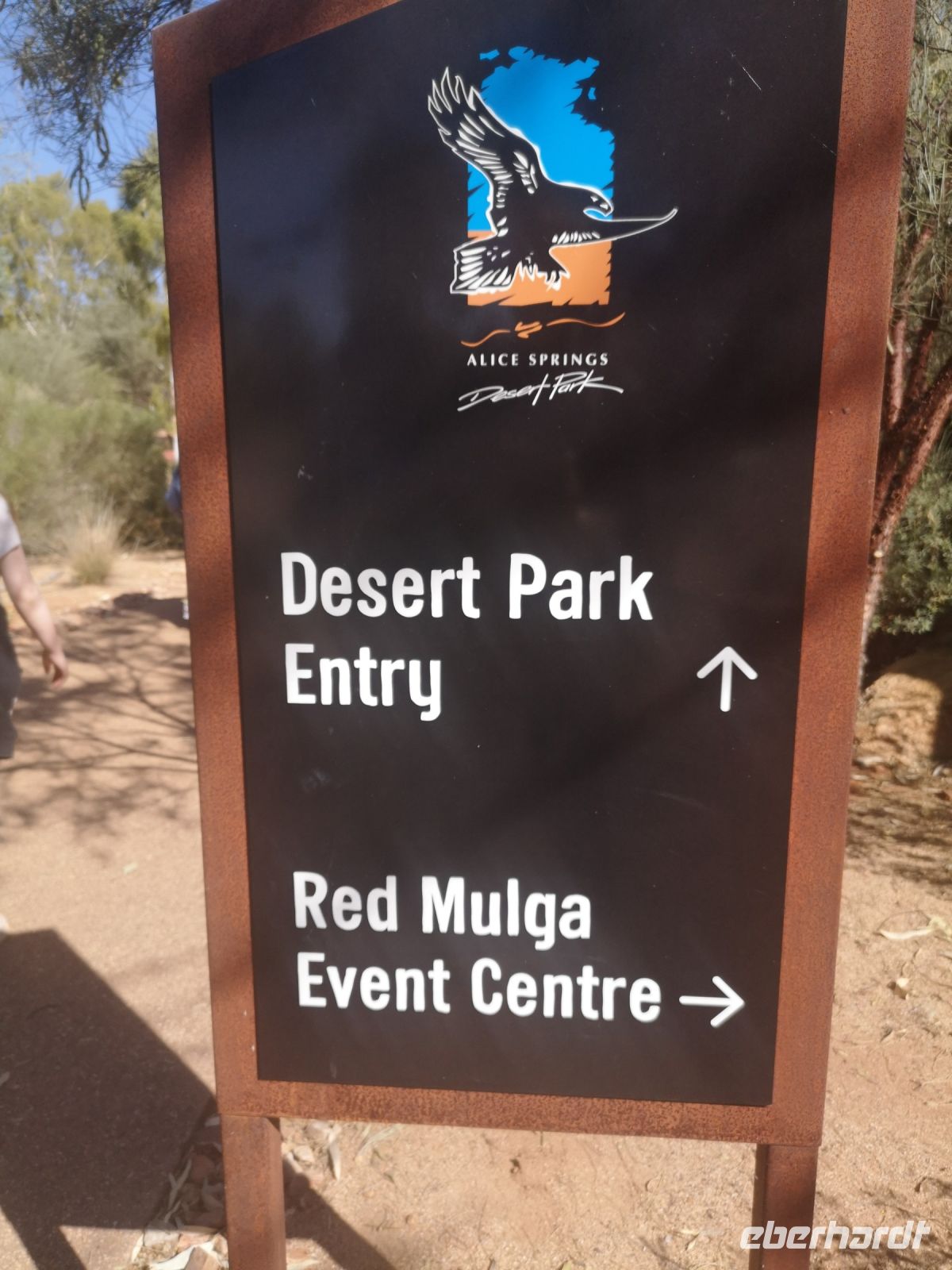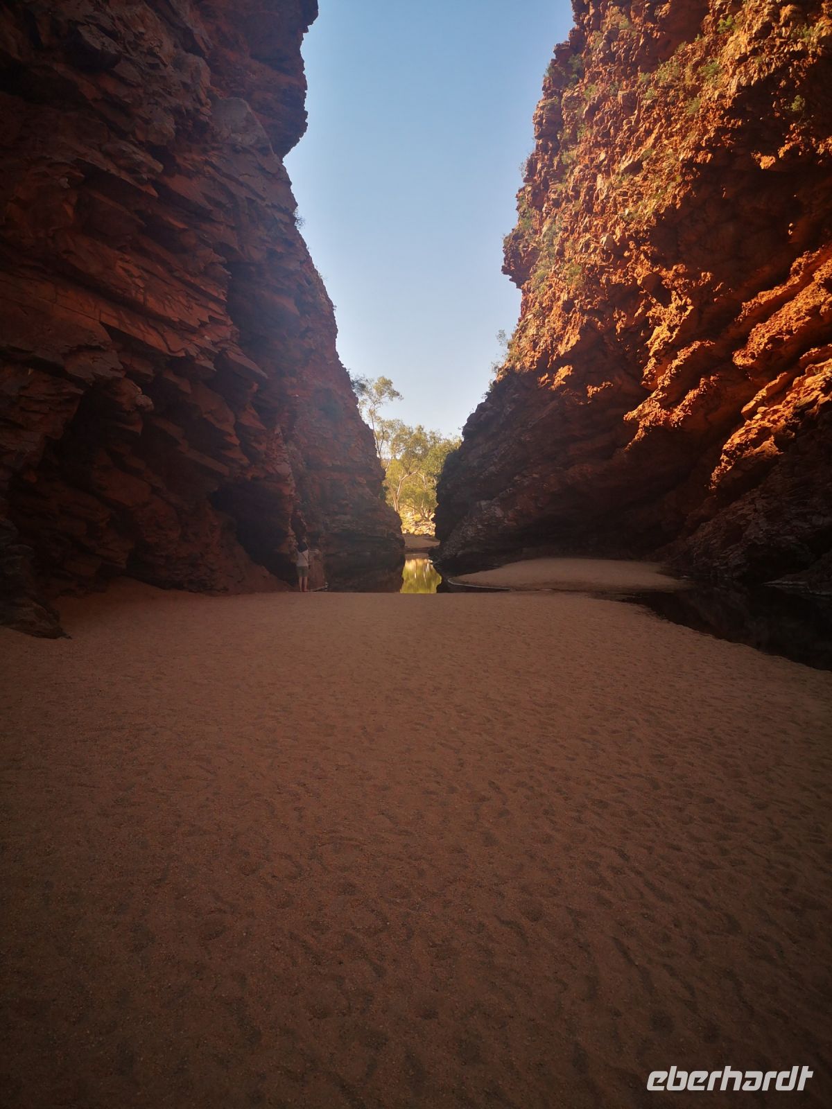 Nach der Mittagspause führt uns Eva zu einer weiteren Naturschönheit der MacDonnell Ranges, zu dem Simpsons Gap. Durch diese Schlucht führt ein Fluss, der jedoch fast nie oberirdisch Wasser führt, aber doch potentiell Wasser führen könnte. Deshalb benötigt es natürlich das behördliche Schwimmverbot, das gut sichtbar am Ufer angebracht ist. :)