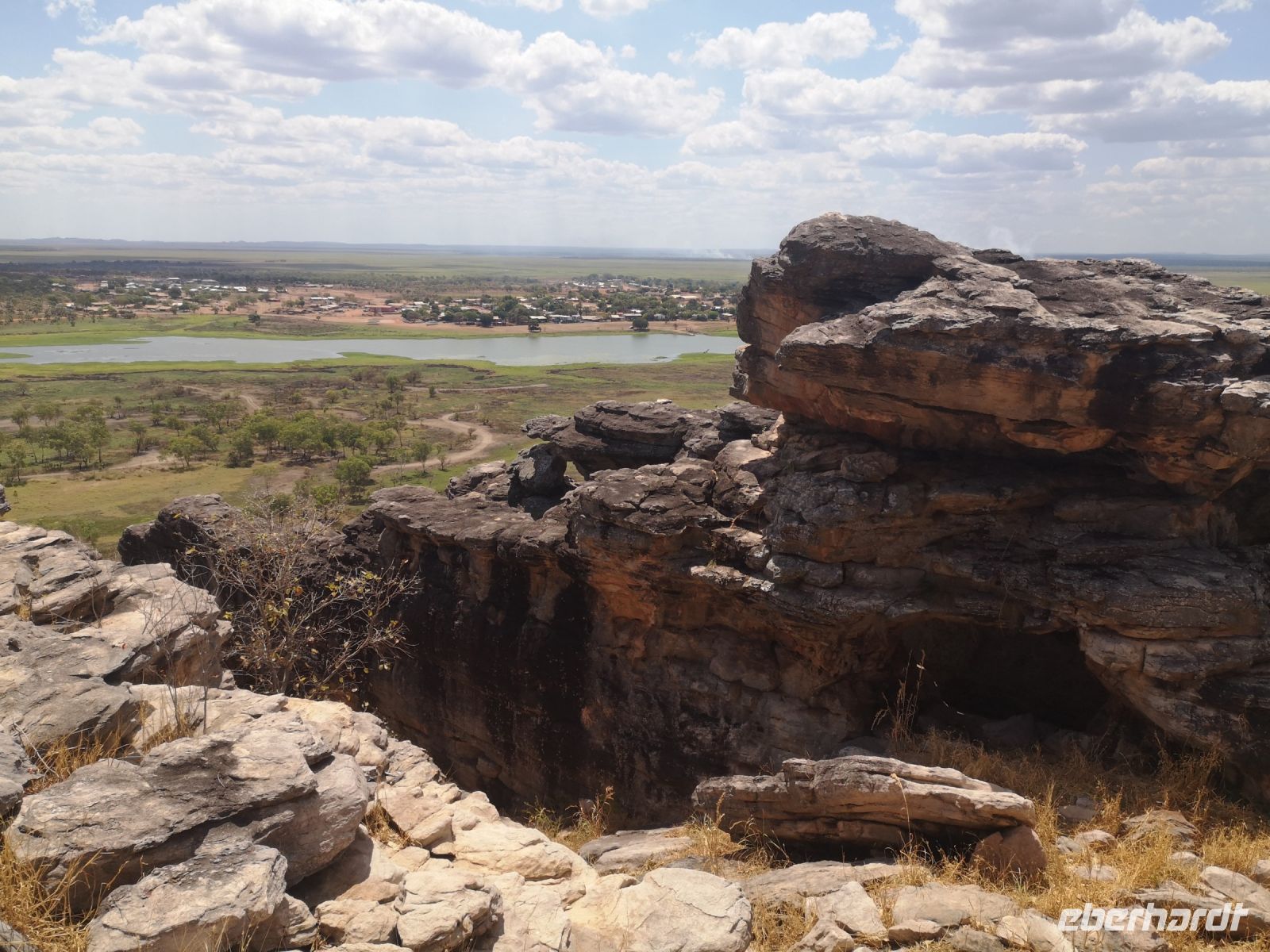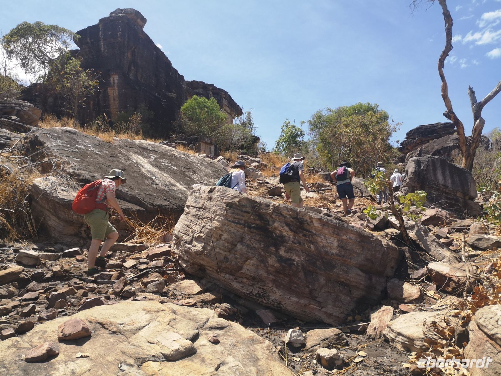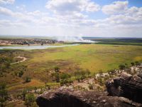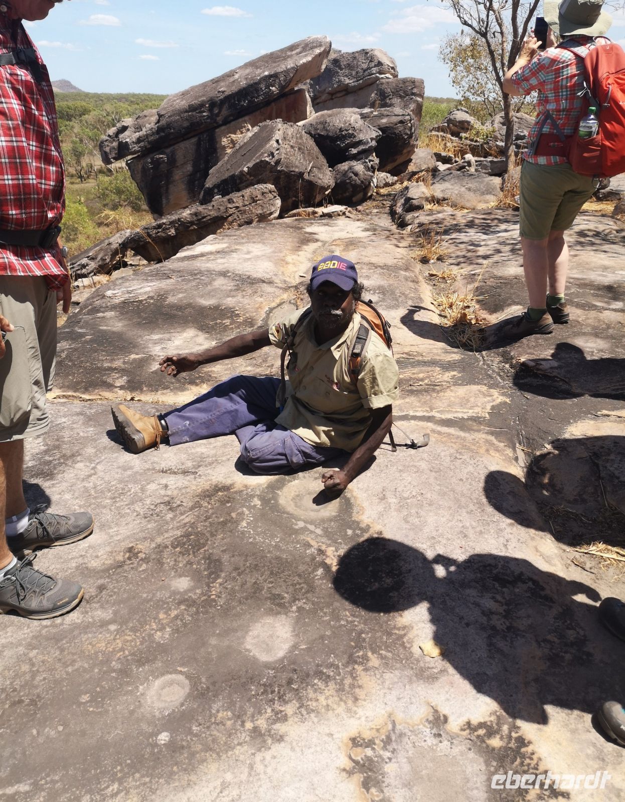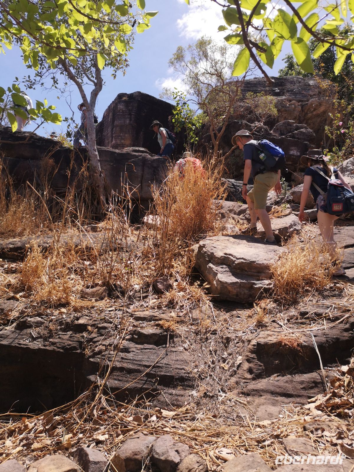 Für diese Exkursion in das abgelegene Aboriginal Land, haben wir einen regenfreien, aber auch heißen und sehr schwülen Tag. Der Weg, den Berg hinauf, ist mühsam und es wird Trittsicherheit benötigt. Es geht über stark verblockte Wege, durch enge Felsdurchbrüche und in hohe, aber sehr schmale Schluchten hinein. Es war richtig, dass sich 3 Personen unserer Grupper dafür entschieden, diesen Aufstieg nicht mit zu machen, strattdessen diese Zeit beim Bus, im Schatten von Bäumen, zu verbringen. Wir anderen wurden jedoch für die Mühen des Aufstiegs sehr belohnt. Diese tiefen Einblicke die uns in die fremde Kultur durch Roland vermittelt wurden, war sehr beindruckend. Als wir schlussendlich oben auf dem Berg, auf einer Felsplatte alle ankommen, können wir einen schönen Ausblick über das Land, die Aborigines Siedlung und die umliegende leicht bewachsene Landschaft werfen. In der Ferne sehen wir Rauch von 2 Buschbränden. Roland erklärt uns, dass diese eine traditionelle Methode der Jagd ist. Sie legen ein begrenztes Feuer im Busch, vertreiben dadurch die Schlangen aus diesem Gebiet und fangen dann die begehrten Langhalsschildkröten.