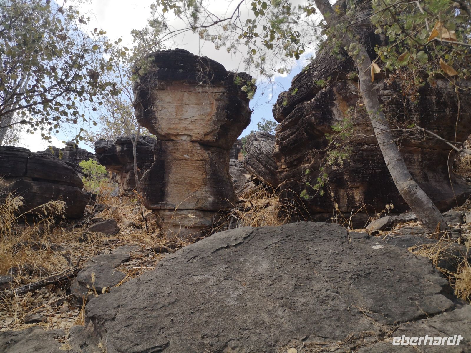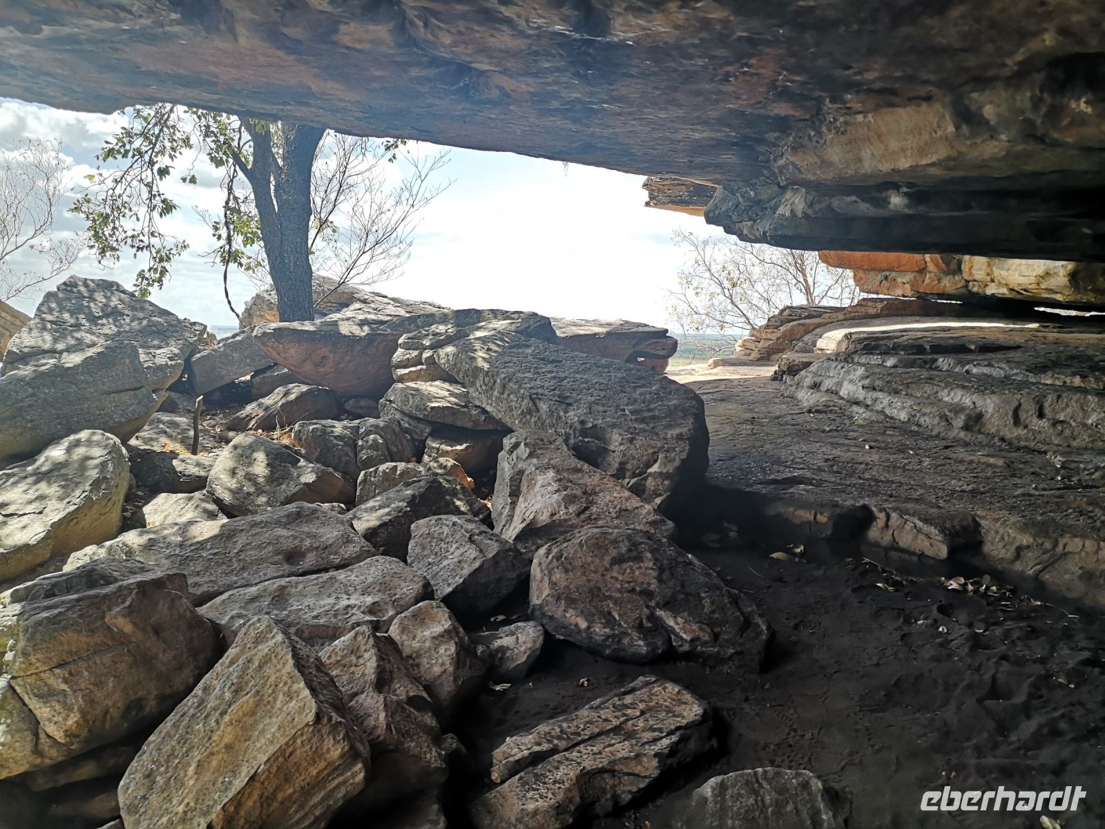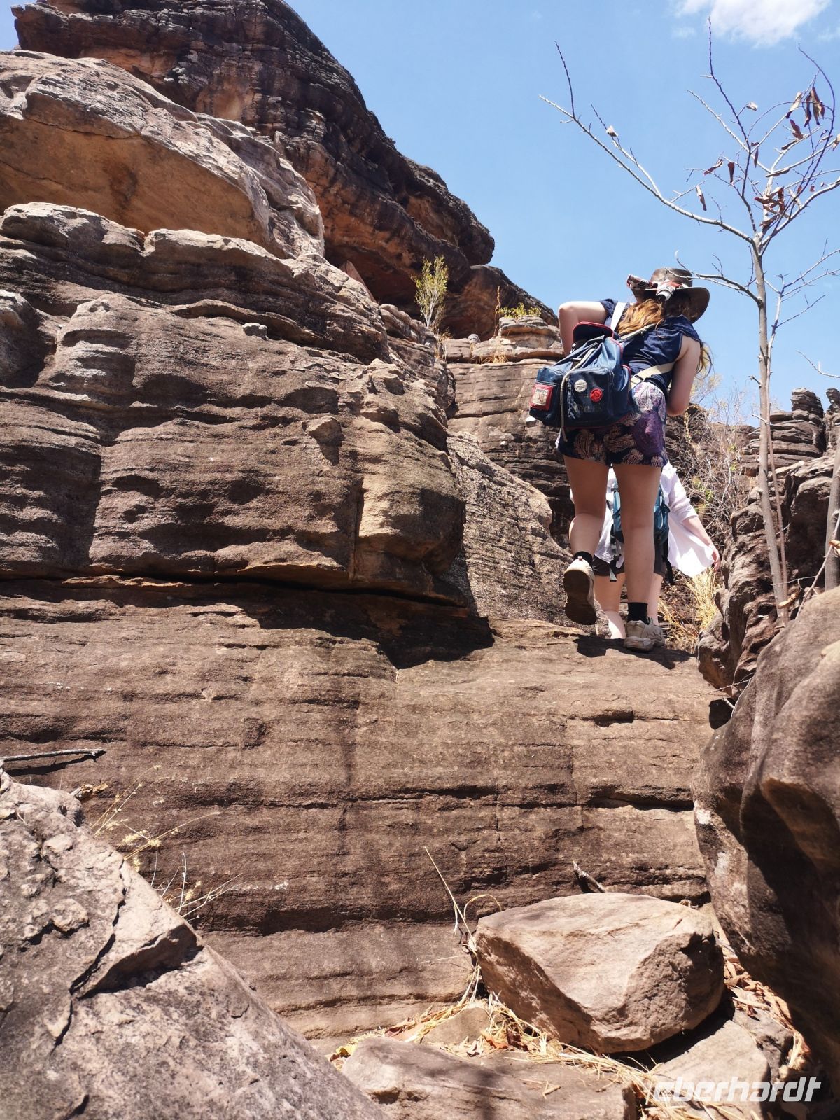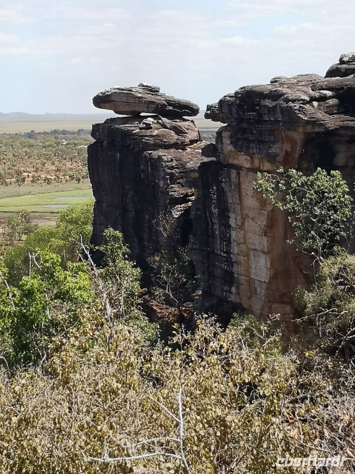 Für diese Exkursion in das abgelegene Aboriginal Land, haben wir einen regenfreien, aber auch heißen und sehr schwülen Tag. Der Weg, den Berg hinauf, ist mühsam und es wird Trittsicherheit benötigt. Es geht über stark verblockte Wege, durch enge Felsdurchbrüche und in hohe, aber sehr schmale Schluchten hinein. Es war richtig, dass sich 3 Personen unserer Grupper dafür entschieden, diesen Aufstieg nicht mit zu machen, strattdessen diese Zeit beim Bus, im Schatten von Bäumen, zu verbringen. Wir anderen wurden jedoch für die Mühen des Aufstiegs sehr belohnt. Diese tiefen Einblicke die uns in die fremde Kultur durch Roland vermittelt wurden, war sehr beindruckend. Als wir schlussendlich oben auf dem Berg, auf einer Felsplatte alle ankommen, können wir einen schönen Ausblick über das Land, die Aborigines Siedlung und die umliegende leicht bewachsene Landschaft werfen. In der Ferne sehen wir Rauch von 2 Buschbränden. Roland erklärt uns, dass diese eine traditionelle Methode der Jagd ist. Sie legen ein begrenztes Feuer im Busch, vertreiben dadurch die Schlangen aus diesem Gebiet und fangen dann die begehrten Langhalsschildkröten.