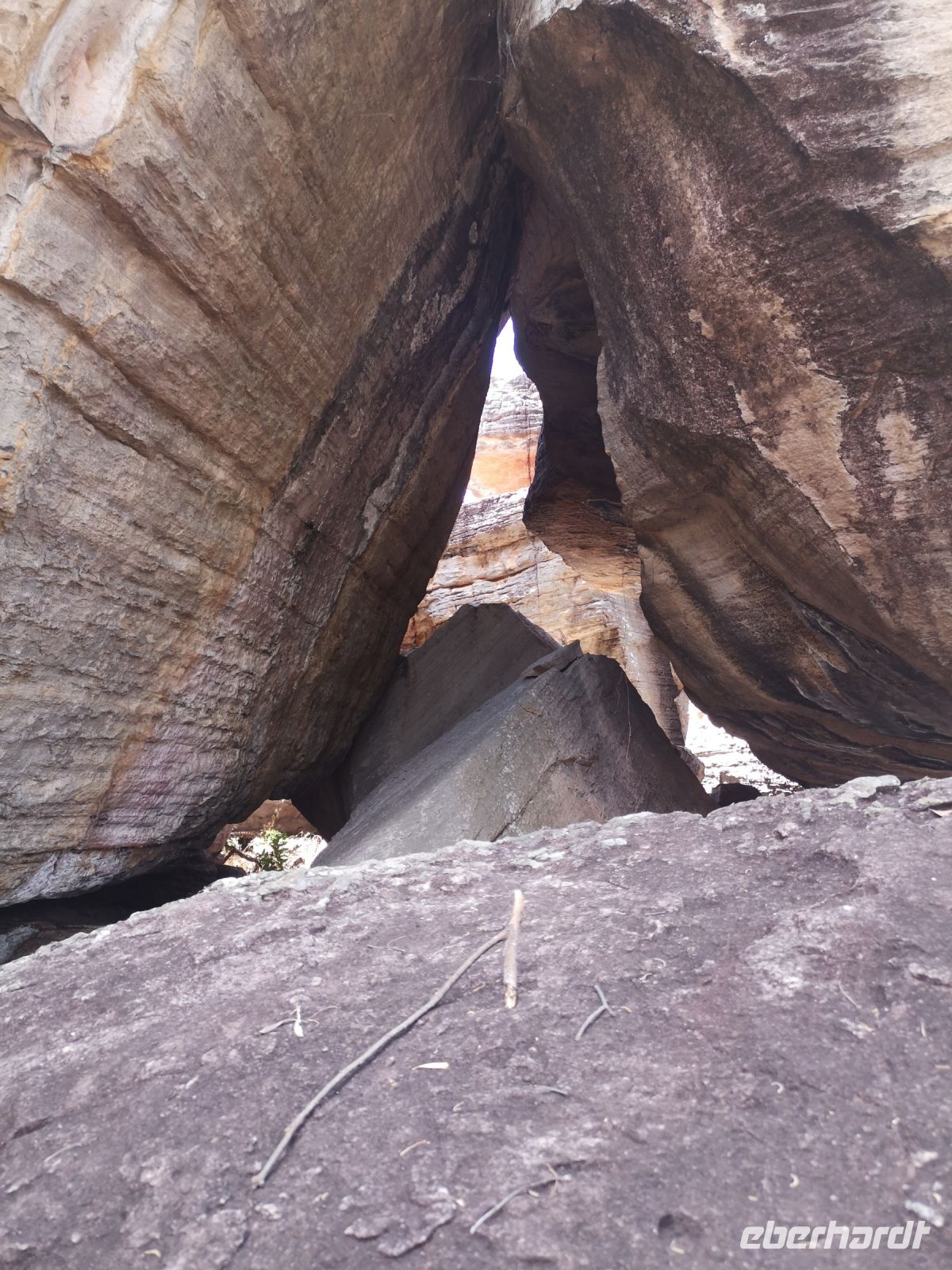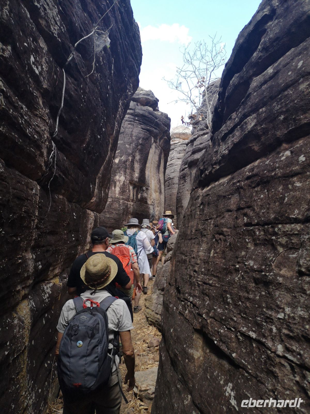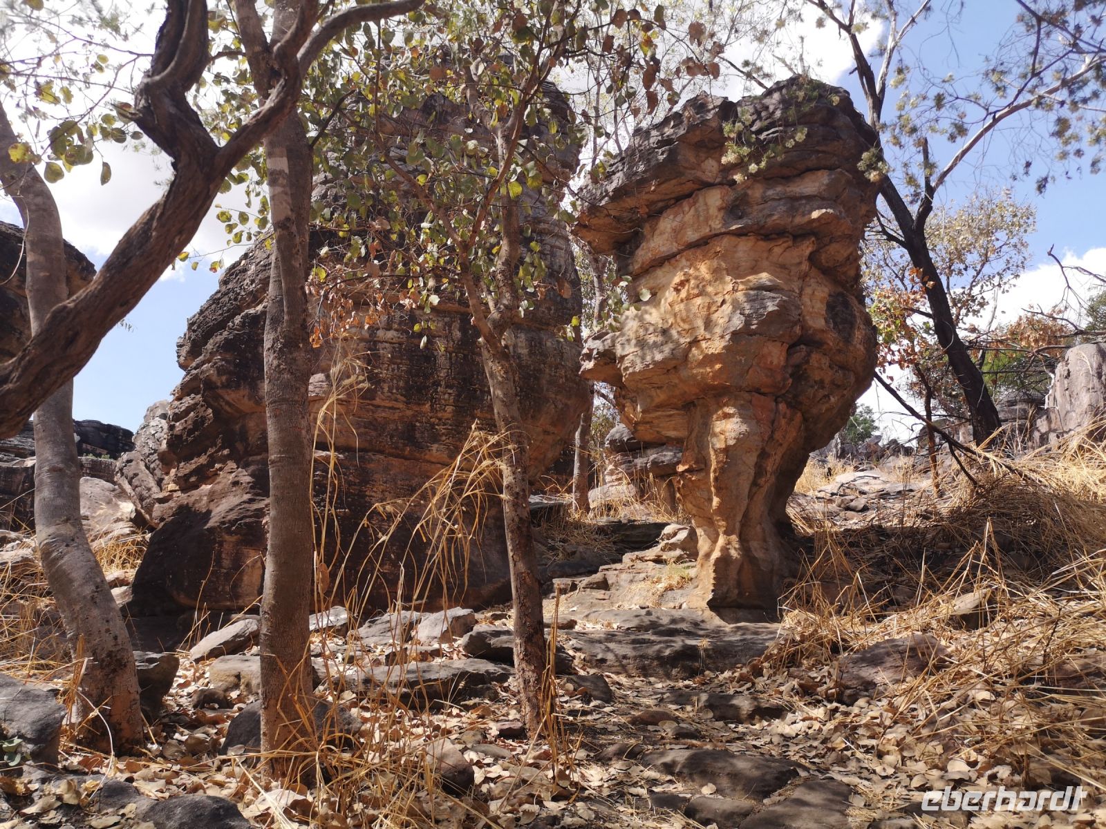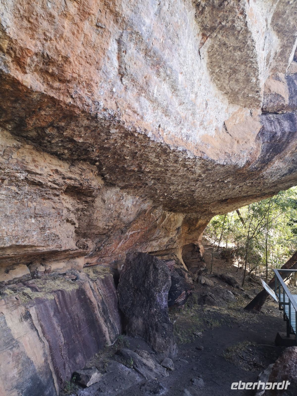 Für diese Exkursion in das abgelegene Aboriginal Land, haben wir einen regenfreien, aber auch heißen und sehr schwülen Tag. Der Weg, den Berg hinauf, ist mühsam und es wird Trittsicherheit benötigt. Es geht über stark verblockte Wege, durch enge Felsdurchbrüche und in hohe, aber sehr schmale Schluchten hinein. Es war richtig, dass sich 3 Personen unserer Grupper dafür entschieden, diesen Aufstieg nicht mit zu machen, strattdessen diese Zeit beim Bus, im Schatten von Bäumen, zu verbringen. Wir anderen wurden jedoch für die Mühen des Aufstiegs sehr belohnt. Diese tiefen Einblicke die uns in die fremde Kultur durch Roland vermittelt wurden, war sehr beindruckend. Als wir schlussendlich oben auf dem Berg, auf einer Felsplatte alle ankommen, können wir einen schönen Ausblick über das Land, die Aborigines Siedlung und die umliegende leicht bewachsene Landschaft werfen. In der Ferne sehen wir Rauch von 2 Buschbränden. Roland erklärt uns, dass diese eine traditionelle Methode der Jagd ist. Sie legen ein begrenztes Feuer im Busch, vertreiben dadurch die Schlangen aus diesem Gebiet und fangen dann die begehrten Langhalsschildkröten.
