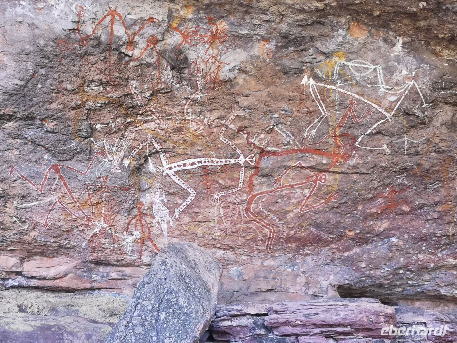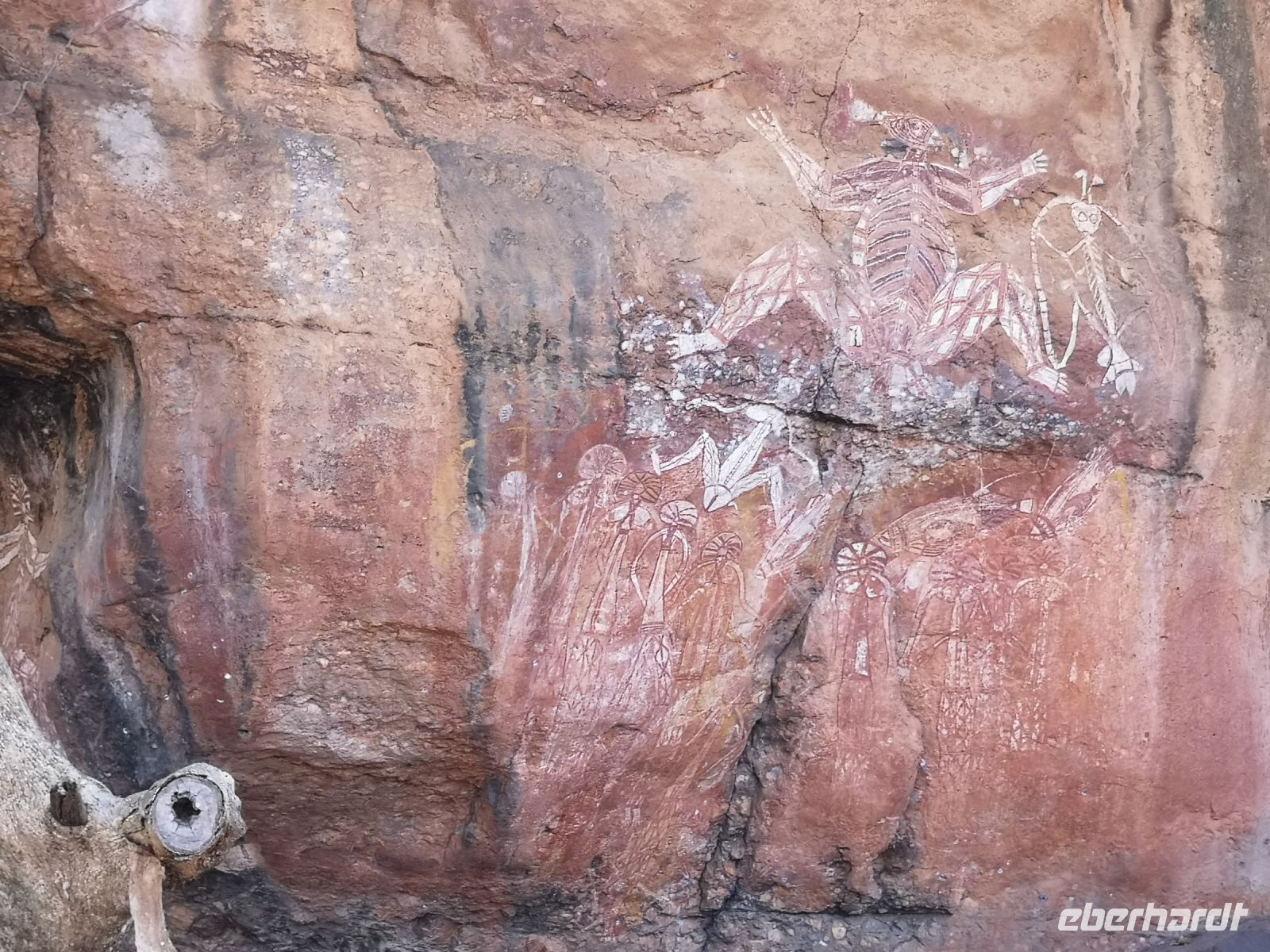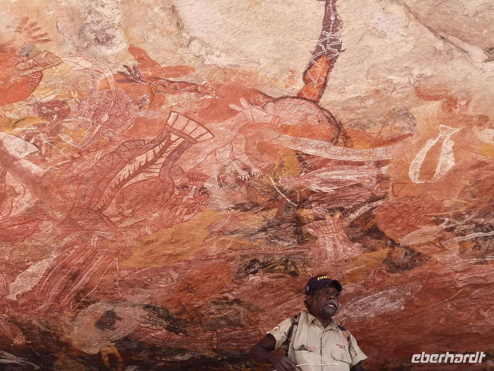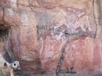 Den ersten Besuch machen wir heute dem Nourlangie-Felsen. Hier befinden ich historische Felsmalereien der Aboriginal in geschützten Höhlen. Es werden Jagdszenen von Kängurus und anderen Tieren dargestellt, teilweise in dem sogenannte Röntgenstiel, der sehr detailgetreu die inneren Organe und das Skelett der Tiere zeigt. Andere Gemälde zeigen die Stammesgesetzte und Verbote, z.B. Regeln zur Heirat und zur Vermeidung von Inzucht. Es gab bei den Ureinwohnern keine Schrift, aber durch Wandmalerei und erzählte Geschichten wurde ihre Kultur, Wissen und Erfahrungen an die nächsten Generationen weitergegeben.