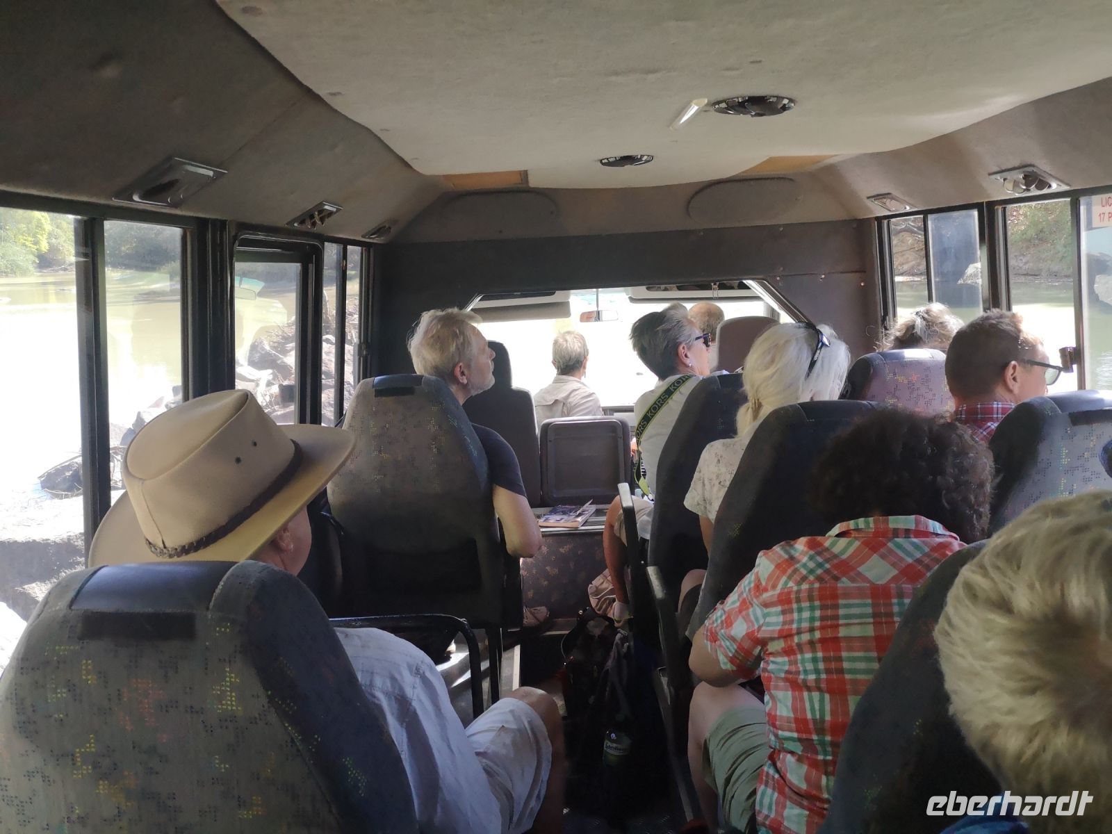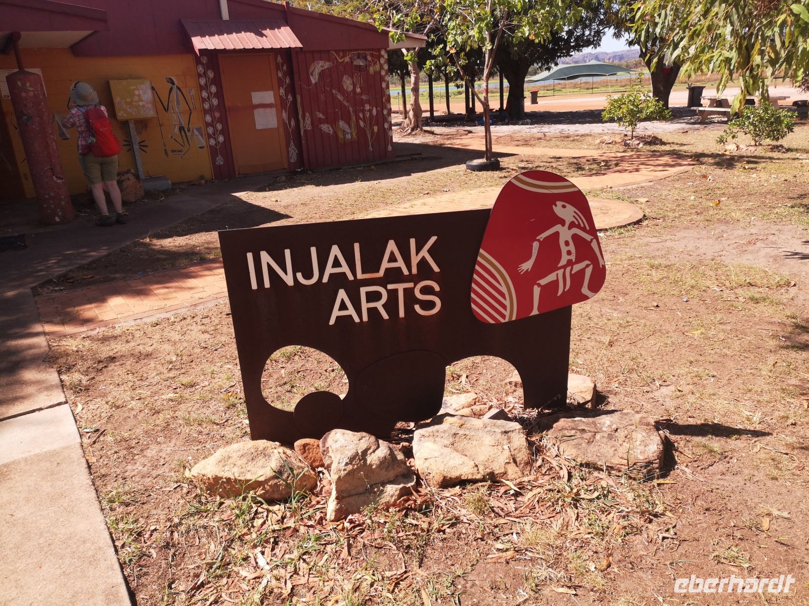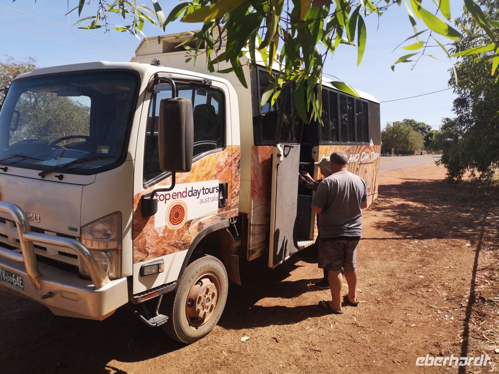 Auf uns wartet heute Tim mit einem geländetauglichen Bus mit dem es möglich ist in das Arnhelmland, auf unbefestigten Straßen und durch Flussfurten, zu fahren. Der Platz für Passagiere und Gepäck war hier eingeschränkt, wir nahmen deshalb nur das Nötigste mit und rückten eng zusammen. Nun bei Fahrten ins Gelände muss man eben Abstriche machen. Wir kamen an einen Fluss den wir ohne Brücke, bei kniehohem Wasser queren mussten. Tim schaltet davor das Allradgetriebe ein, dann durchfuhren wir das Wasser. Links und rechts von uns, im Wasser liegend, schauten uns gelangweilte Krokodile zu. Ohne Problem querten wir die Furt und die Spannung lies nach als wir auf trockenen, staubigen, unbefestigten Pisten weiter Richtung dem Kulturzentrum, der hier ansässigen Aboriginal, fuhren. Gut durchgeschüttelt kamen wir an unserem Ziel an.