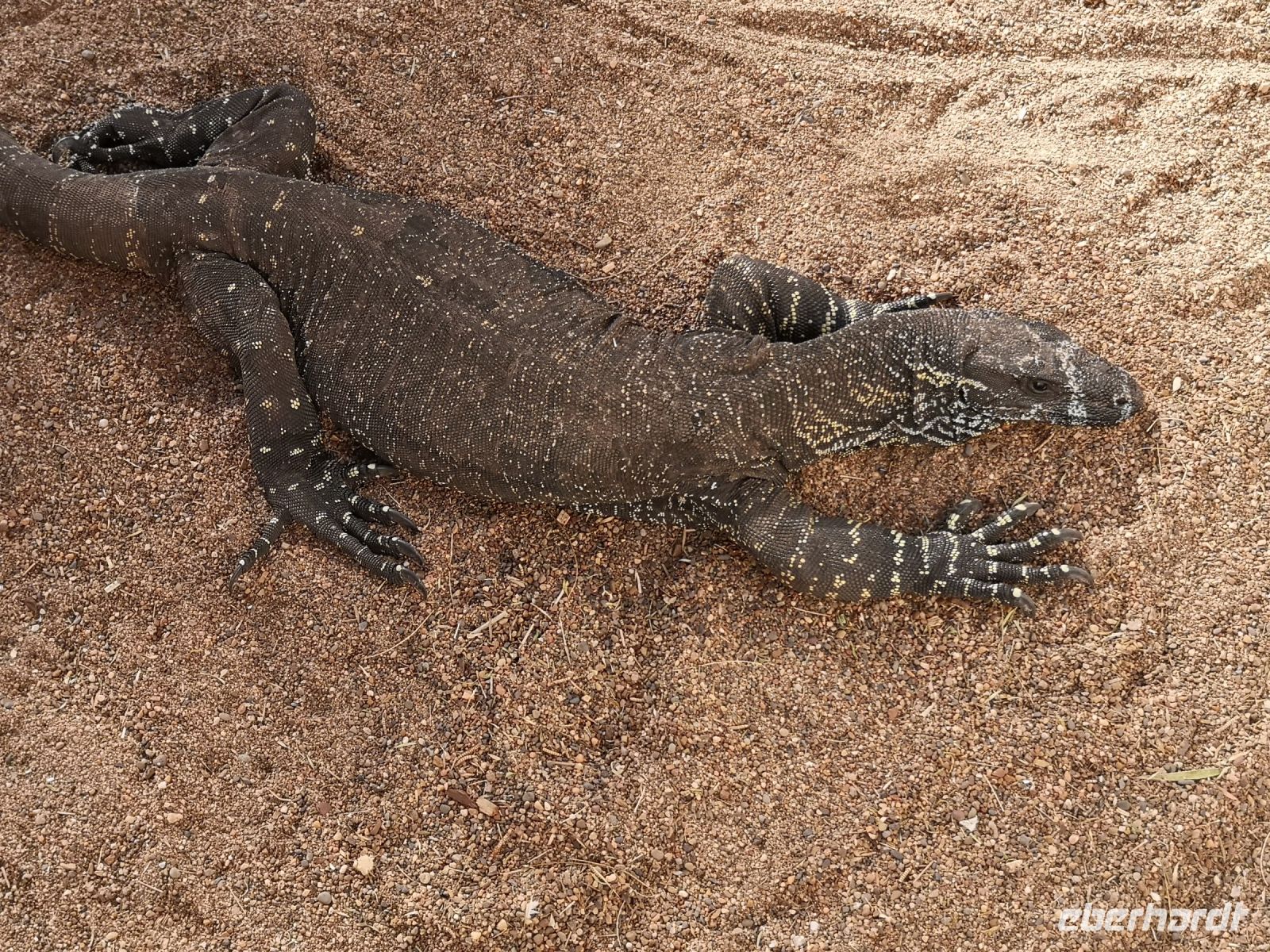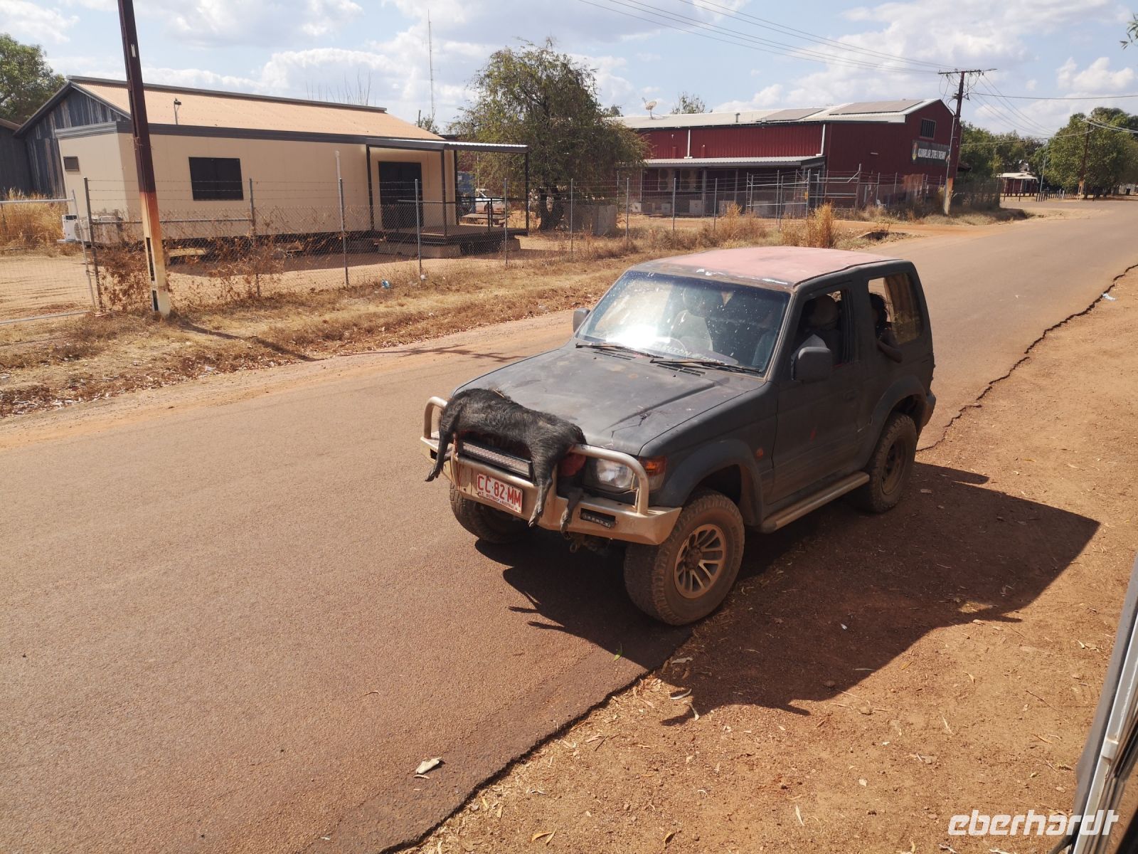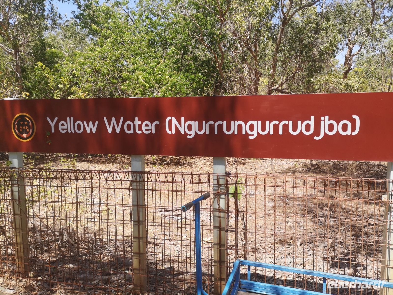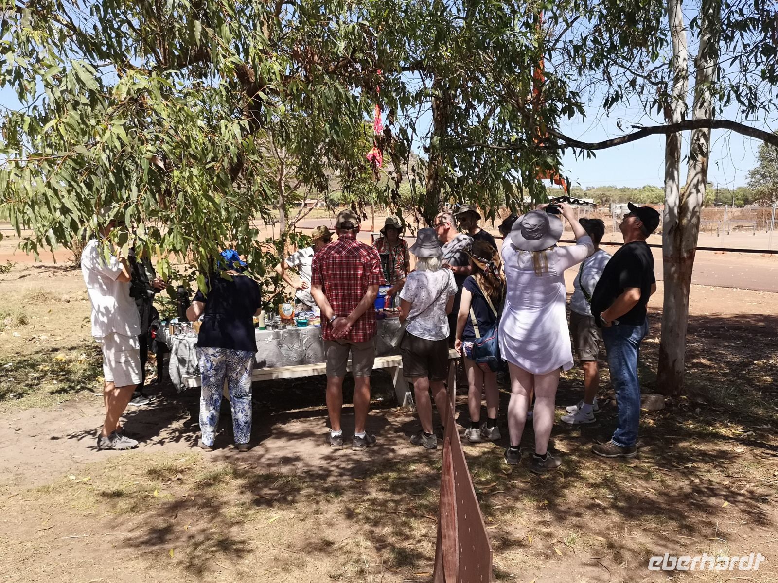 Auf uns wartet heute Tim mit einem geländetauglichen Bus mit dem es möglich ist in das Arnhelmland, auf unbefestigten Straßen und durch Flussfurten, zu fahren. Der Platz für Passagiere und Gepäck war hier eingeschränkt, wir nahmen deshalb nur das Nötigste mit und rückten eng zusammen. Nun bei Fahrten ins Gelände muss man eben Abstriche machen. Wir kamen an einen Fluss den wir ohne Brücke, bei kniehohem Wasser queren mussten. Tim schaltet davor das Allradgetriebe ein, dann durchfuhren wir das Wasser. Links und rechts von uns, im Wasser liegend, schauten uns gelangweilte Krokodile zu. Ohne Problem querten wir die Furt und die Spannung lies nach als wir auf trockenen, staubigen, unbefestigten Pisten weiter Richtung dem Kulturzentrum, der hier ansässigen Aboriginal, fuhren. Gut durchgeschüttelt kamen wir an unserem Ziel an.