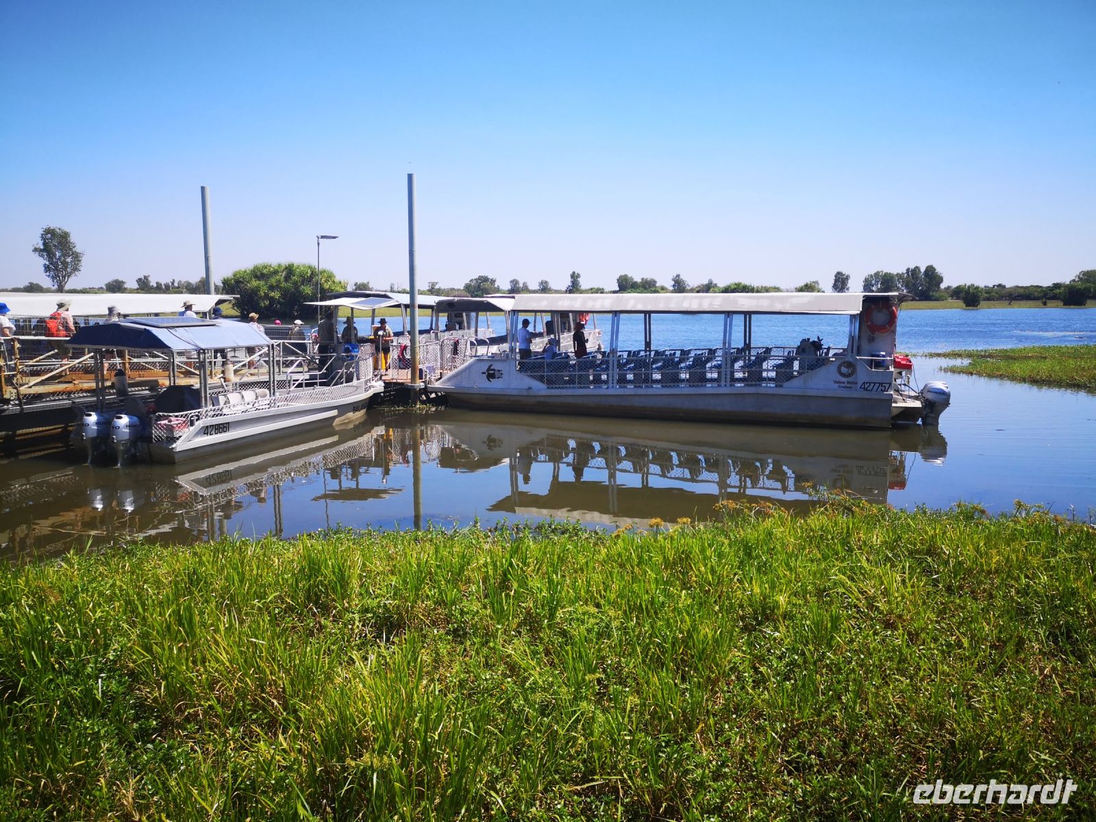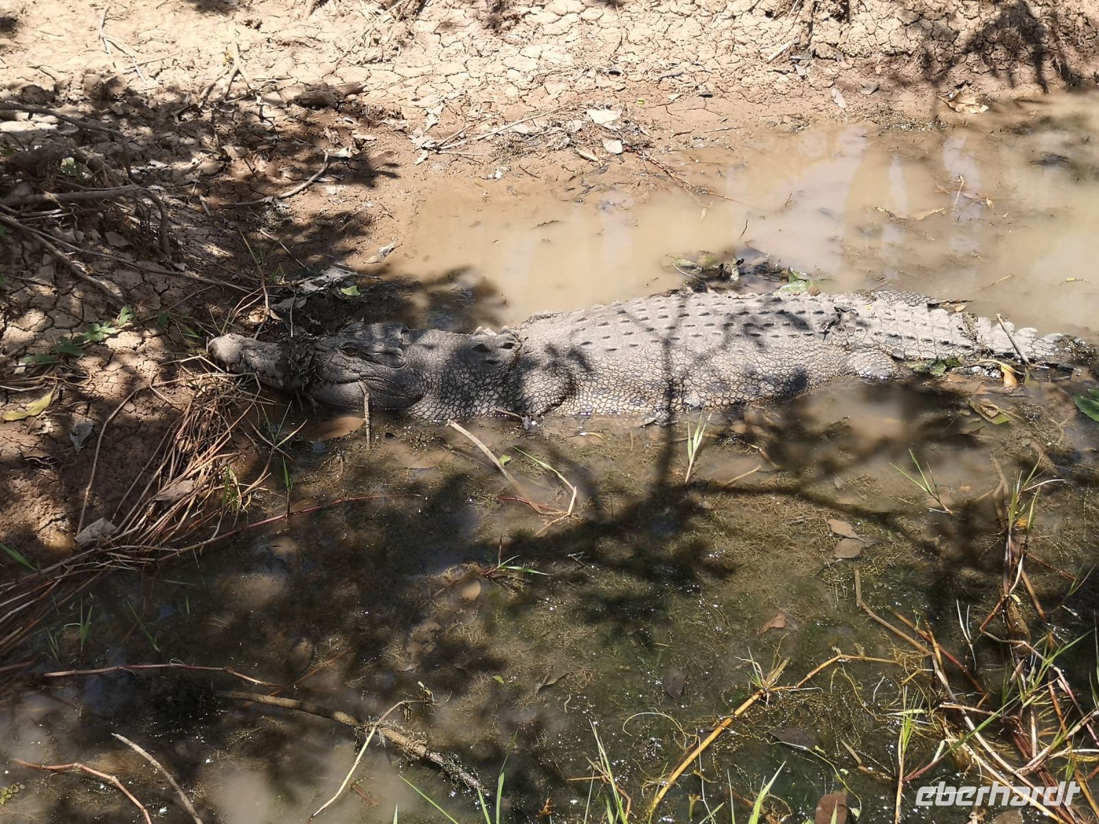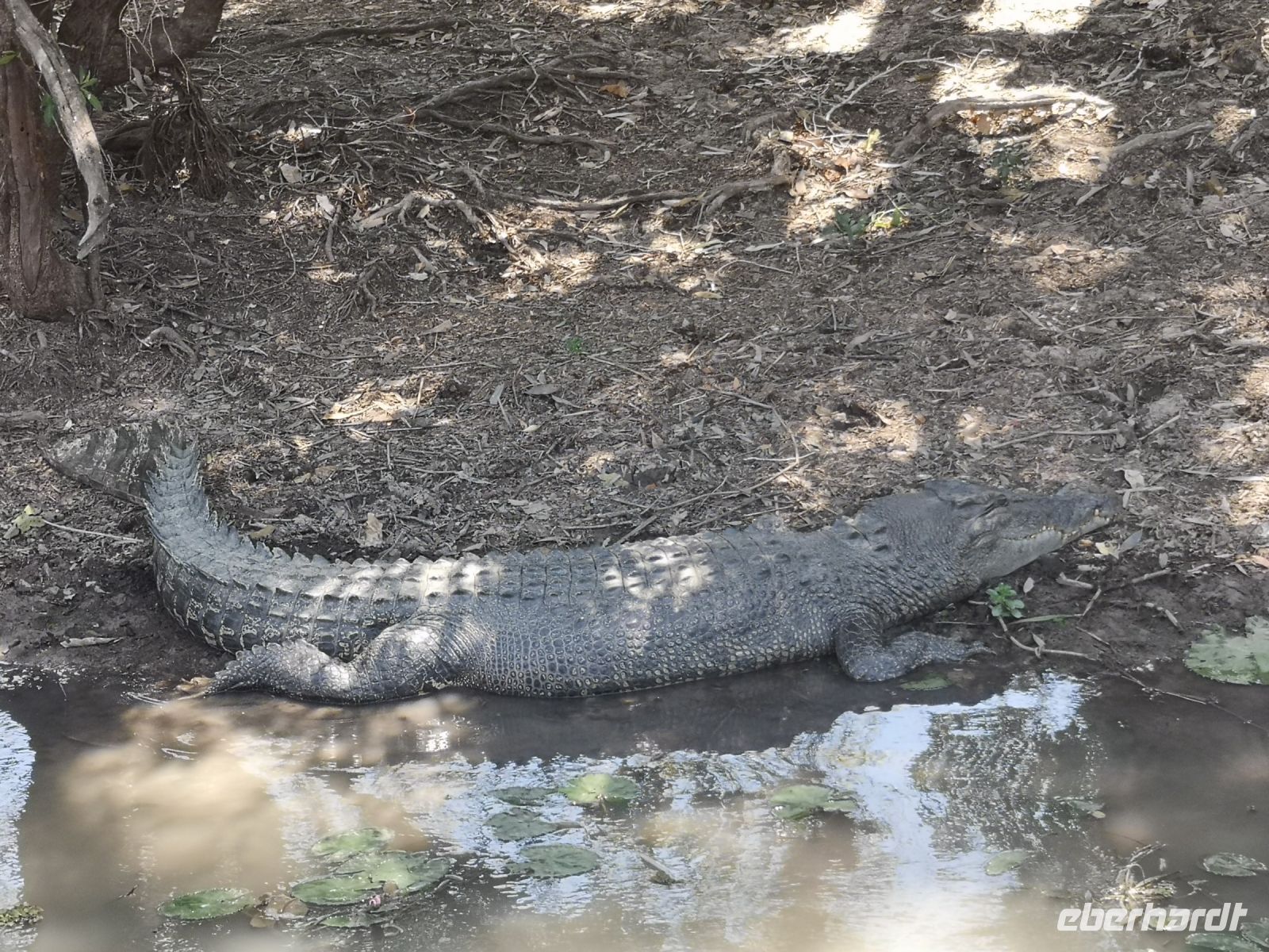 Der nächste Stopp liegt am South Alligator River, einem Fluss der sich komplett auf dem Gebiet des Nationalparks befindet. Hier haben wir einen Termin mit Dennis. Ranger und Krokodil Kenner, er zeigt uns bei einer längeren Bootstour wo sich die großen Salzwasserkrokodile aufhalten und berichtet über deren Jagdverhalten und Revierkämpfe. Und auch über die Gefahr für Menschen, wenn man ihnen zu nahekommt. Wir mussten keine große Strecke auf dem Fluss zurücklegen, es gab fast alle 10 bis 20 Meter eines dieser gefürchteten Warmblüter, entweder am Ufer liegend oder im Wasser schwimmend. Teilweise näherten wir uns den Tieren bis auf wenige Meter, natürlich geschützt durch das Boot in dem wir saßen.
