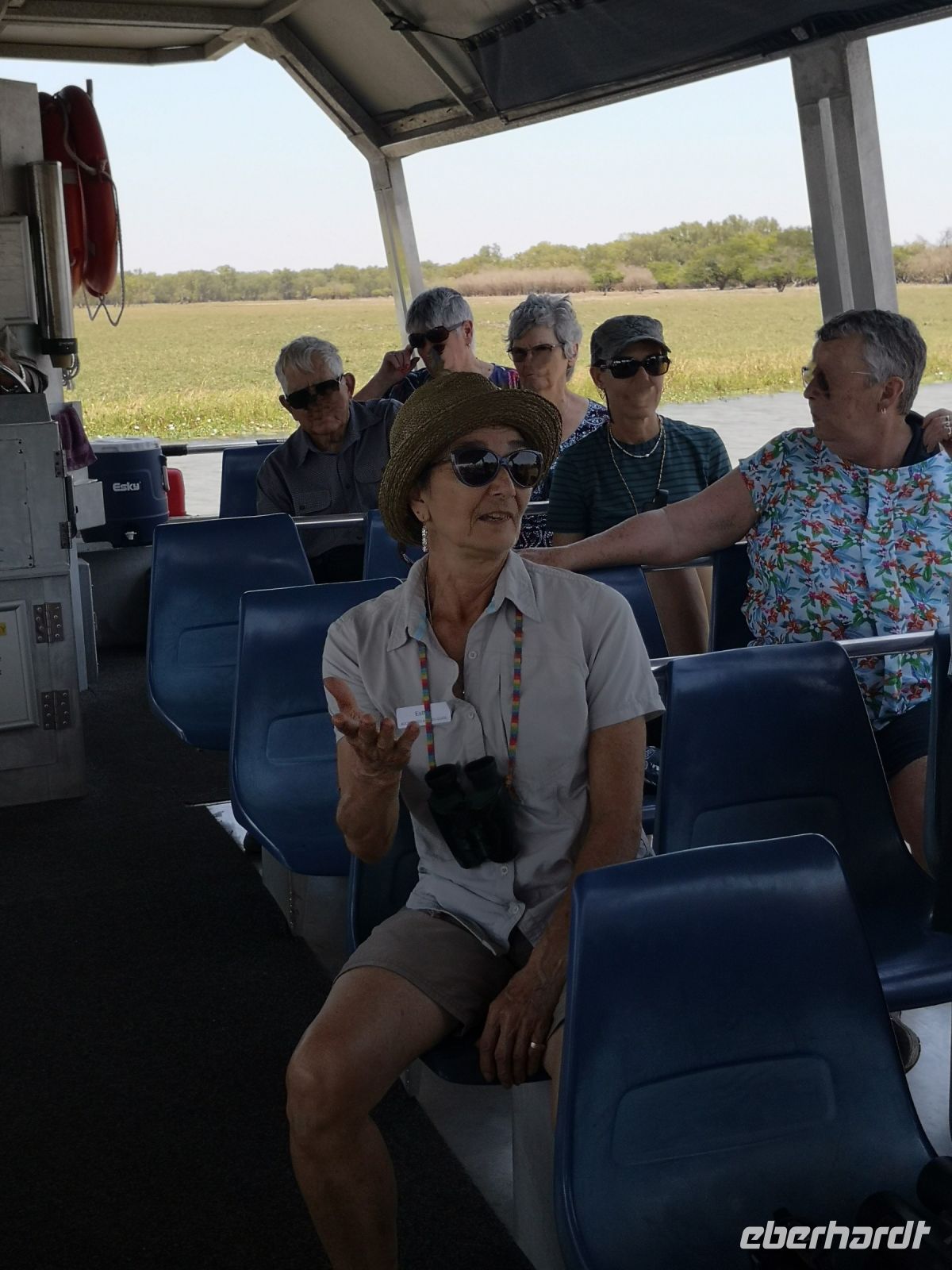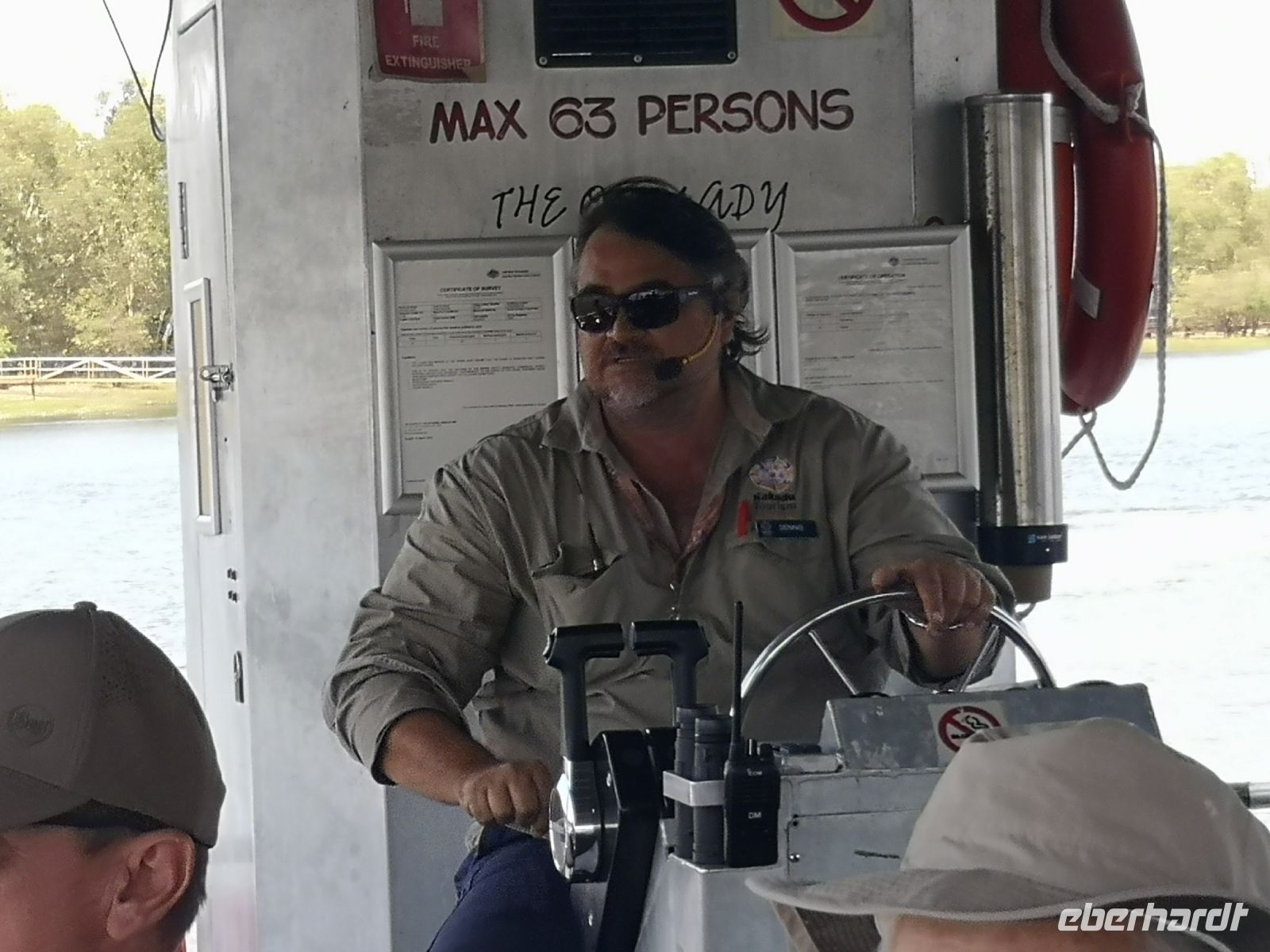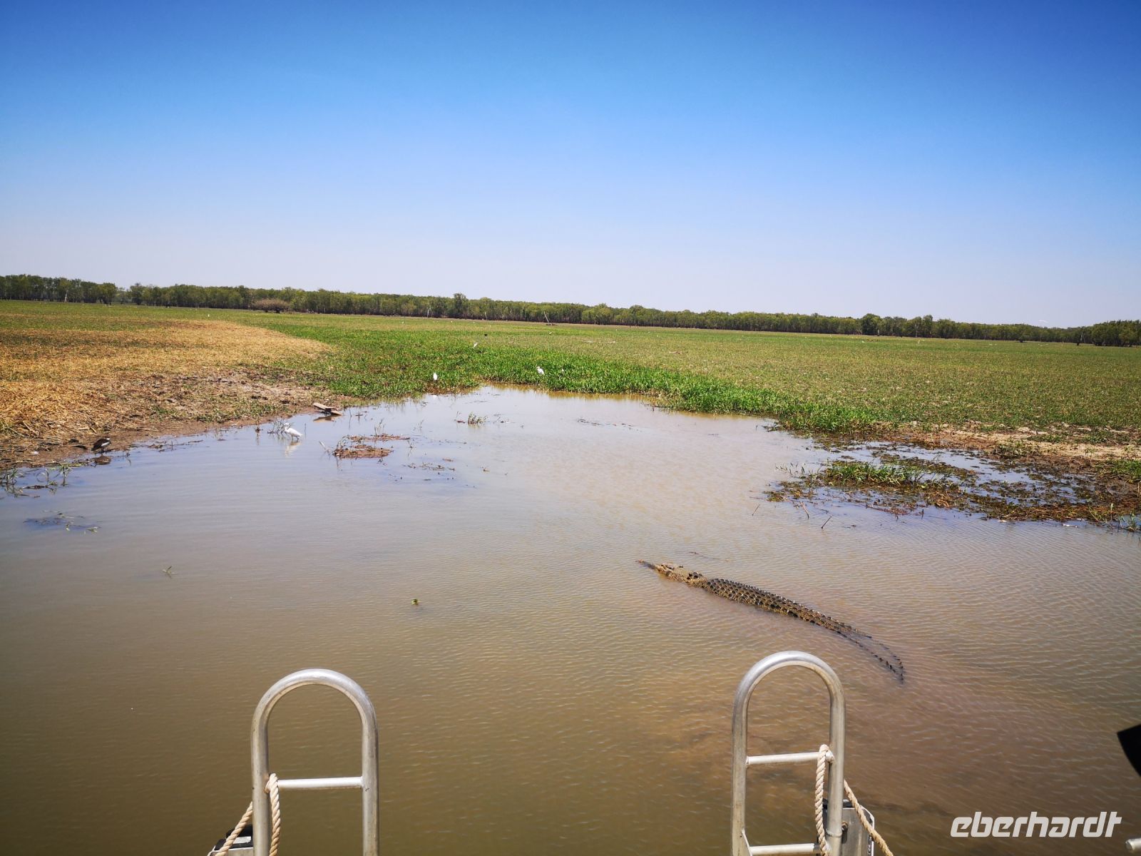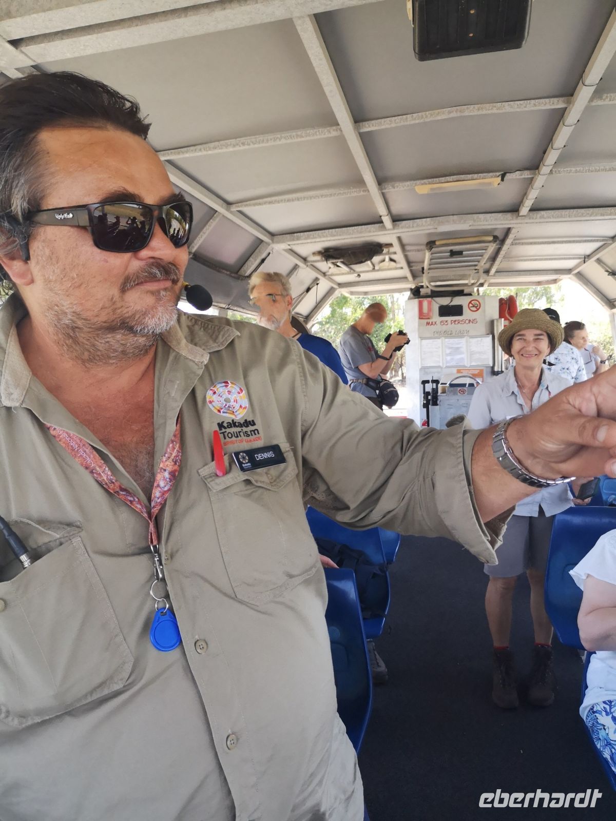 Der nächste Stopp liegt am South Alligator River, einem Fluss der sich komplett auf dem Gebiet des Nationalparks befindet. Hier haben wir einen Termin mit Dennis. Ranger und Krokodil Kenner, er zeigt uns bei einer längeren Bootstour wo sich die großen Salzwasserkrokodile aufhalten und berichtet über deren Jagdverhalten und Revierkämpfe. Und auch über die Gefahr für Menschen, wenn man ihnen zu nahekommt. Wir mussten keine große Strecke auf dem Fluss zurücklegen, es gab fast alle 10 bis 20 Meter eines dieser gefürchteten Warmblüter, entweder am Ufer liegend oder im Wasser schwimmend. Teilweise näherten wir uns den Tieren bis auf wenige Meter, natürlich geschützt durch das Boot in dem wir saßen.