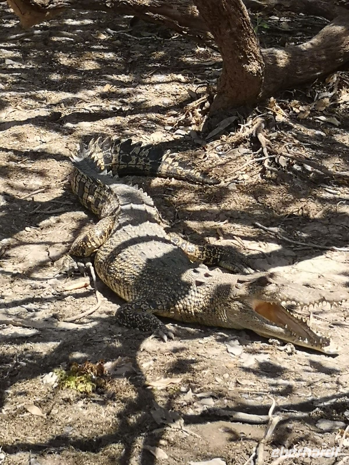 Auf der Anfahrt sehen wir ausgedehnte Mango Plantagen links und rechts der Straße. Von hier wird die ganze Welt mit Mangos beliefert selbst in Süd-Ost Asien werden diese Früchte in großen Mengen nachgefragt. Wenn in Zentral Australien das Wasser ein sehr seltenes Gut ist, gibt es hier im Norden aufgrund der Regenzeit genügend Grundwasser und die Flüsse bilden breite Wasserstraßen. Der Wechsel von Regenzeit, wo große Teile des Landes und auch Straßen überflutet sind, zur Trockenzeit muss von den Farmern jedes Jahr von neuem begleitet werden. Zum einen muss das üppig gewachsene Grass kontrolliert abgebrannt werden, damit in der heißen Jahreszeit möglichst keine unkontrollierten Buschbrände entstehen und sich ausbreiten bis in die bewohnten Gebiete. Zum anderen muss das ganze Gebiet wo sich Menschen aufhalten, wie Straßen, Parkplätze und Wege, abgesucht werden nach Krokodilen die sich aufgrund der großen Flutflächen weiträumig ausgedehnt haben. Krokodile die der Zivilisation zu nahe kommen, werden mit Käfigen gefangen und an abgelegene Gebiete, oder zu Krokodilfarmen gebracht.