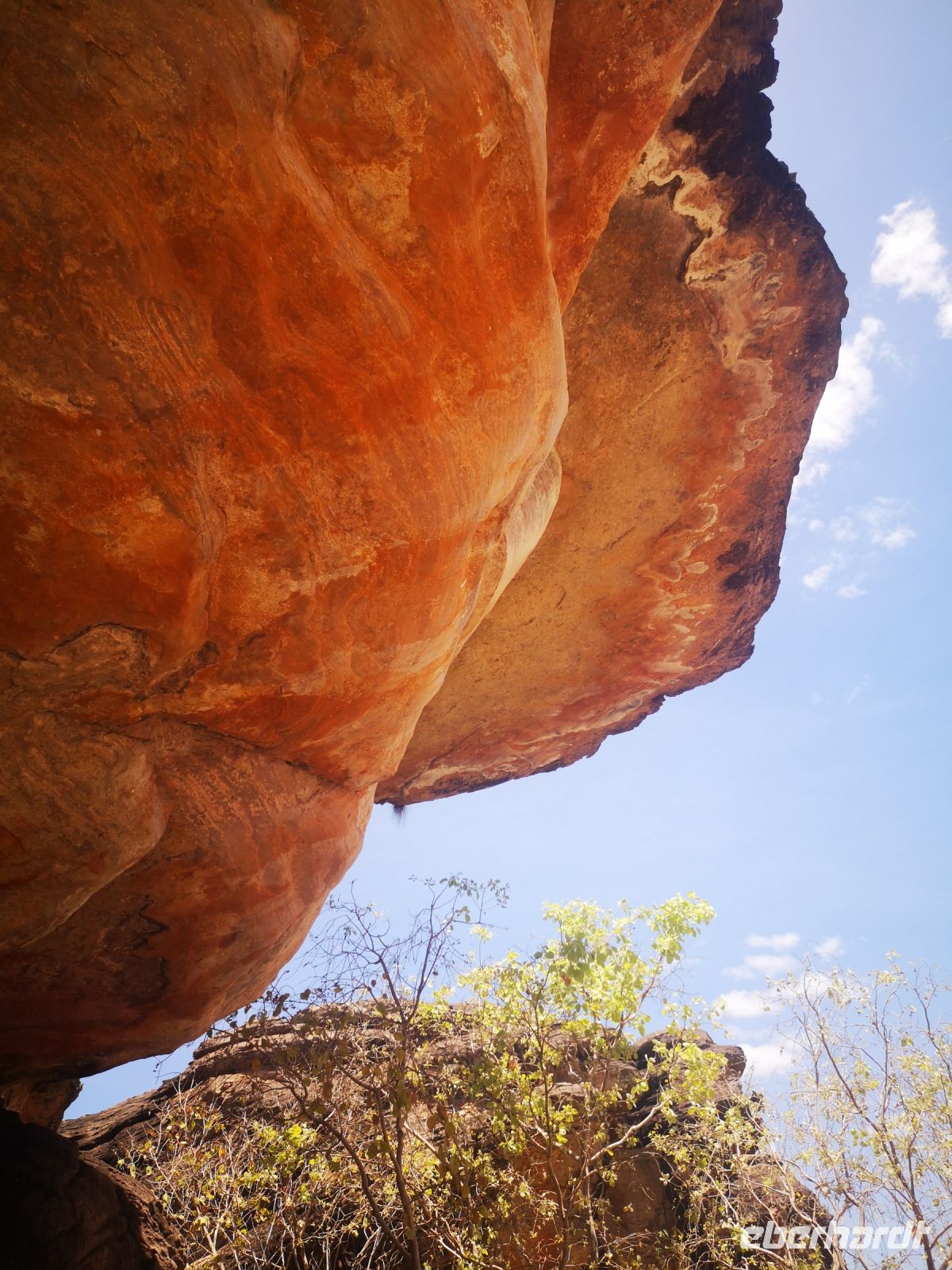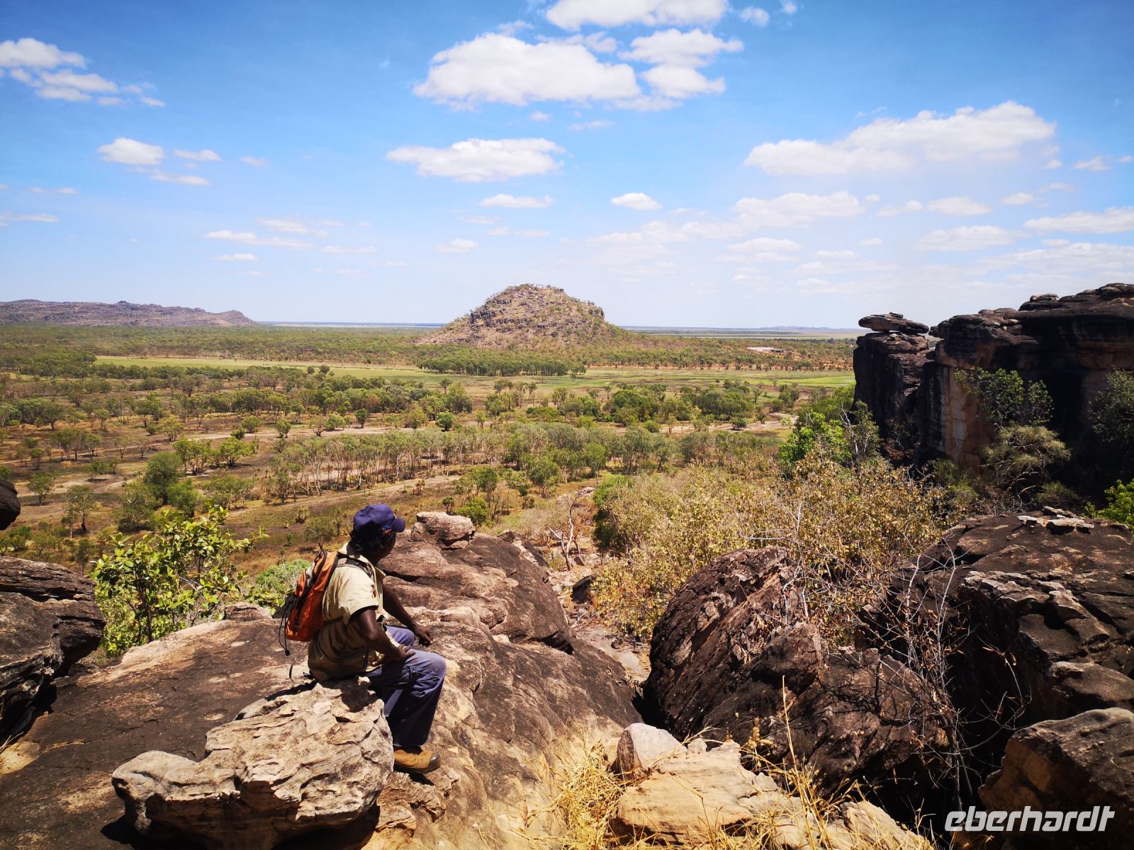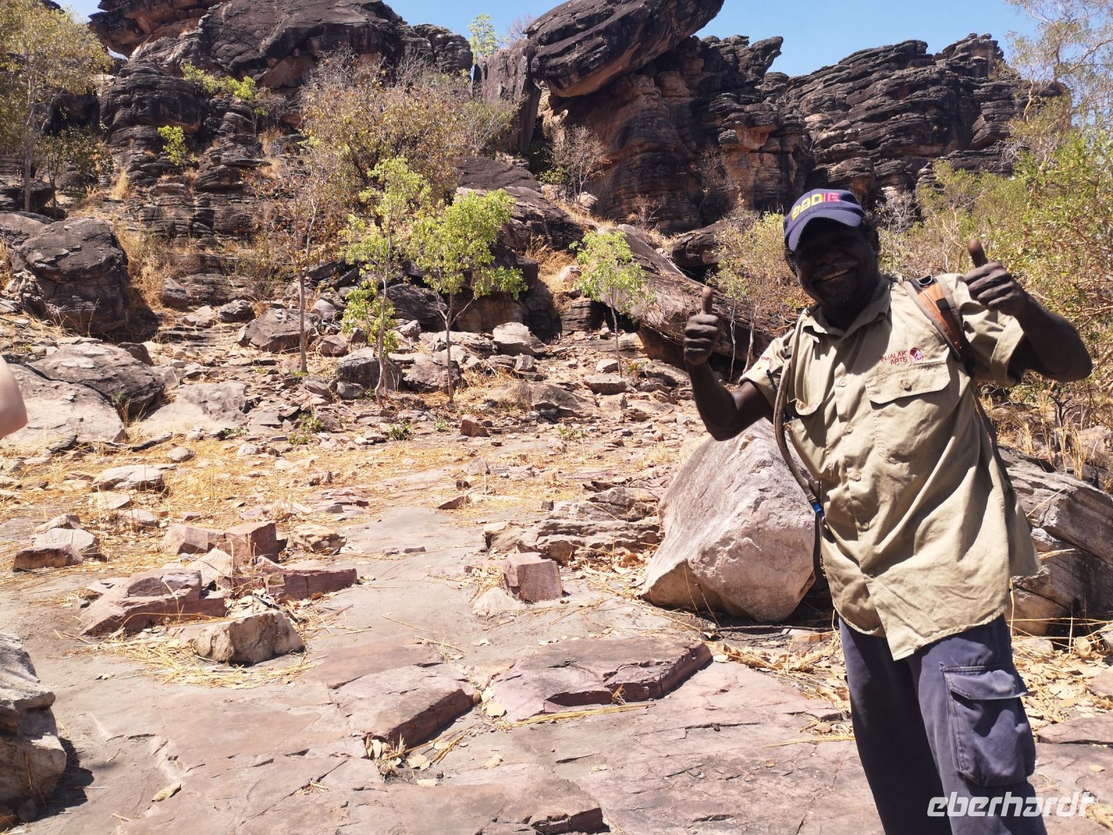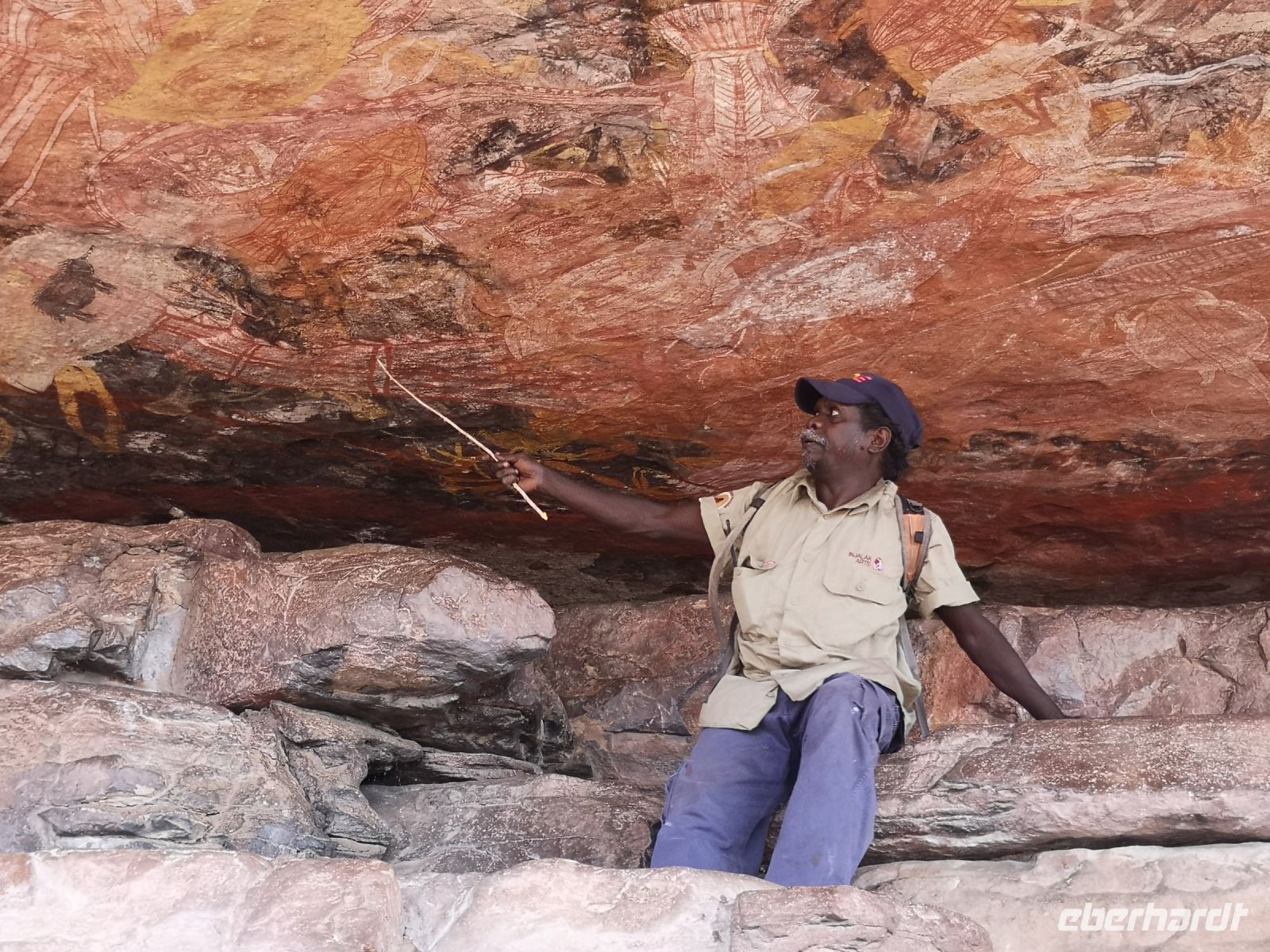 In diesem nahezu unberührte Land, können die Aboriginal ihr traditionelles Leben führen wie sie es von ihren Vorfahren gelernt haben. Sie leben hier in einfachen Siedlungen, in etwas größeren Dörfern aber auch teilweise abgesetzt in kleinen Gruppen entfernt von der Dorfgemeinschaft. Sie leben vom Jagen, Sammeln von Kräutern, Insekten und Früchten. Für ihre Gemälde bereiten sie sich ihre Farben aus natürlichen Pigmenten zu. Dazu zählt Kängurublut gemischt mit der Milch eines bestimmten Baumes, auch Menschenblut und verschiedene Mineralien des Landes. Diese Farben haben eine sehr hohe Haftung auf den Felsen, auf Leinwänden aber auch auf den Körpern der Ureinwohner die sie bemalen für ihre Rituale und Feste. Nach einer kurzen Kaffeepause die uns Tim aus seinem Geländewagen zubereitet, lernen wir unseren Aboriginal Guide Roland kennen, mit dem wir tiefer in sein Land wandern wollen. Der westliche Name Roland kam durch die englische Missionsarbeit, die hier vor Jahrzehnten betrieben wurde.