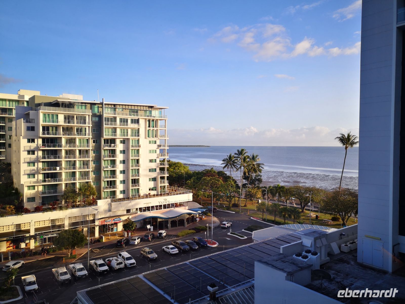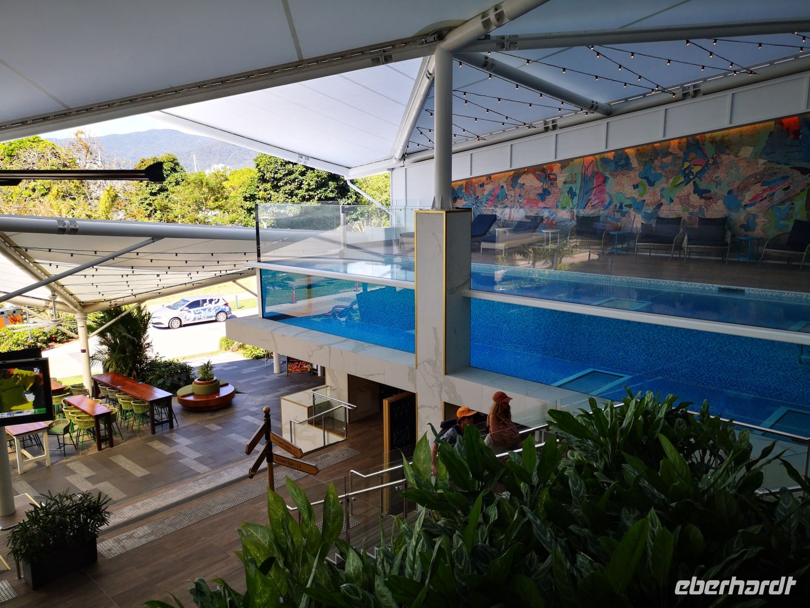 Frontseite an der Abbott Street mit Hotelzufahrt, freundlicher Rezeption, alles sehr korrekt. Und das zweite Gesicht geht nach hinten zur Promenade hin zum Meer, mit lockerer Pool Atmosphäre, schöner beschatteter Gastronomie, mit Musik untermalt und Blick auf das Korallenmeer, ein schöner Wohlfühlbereich.