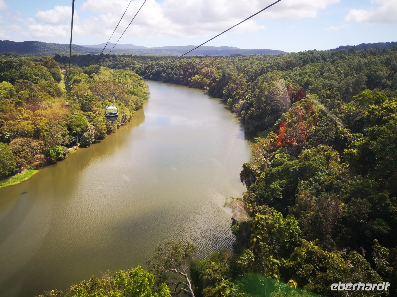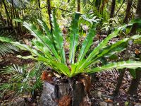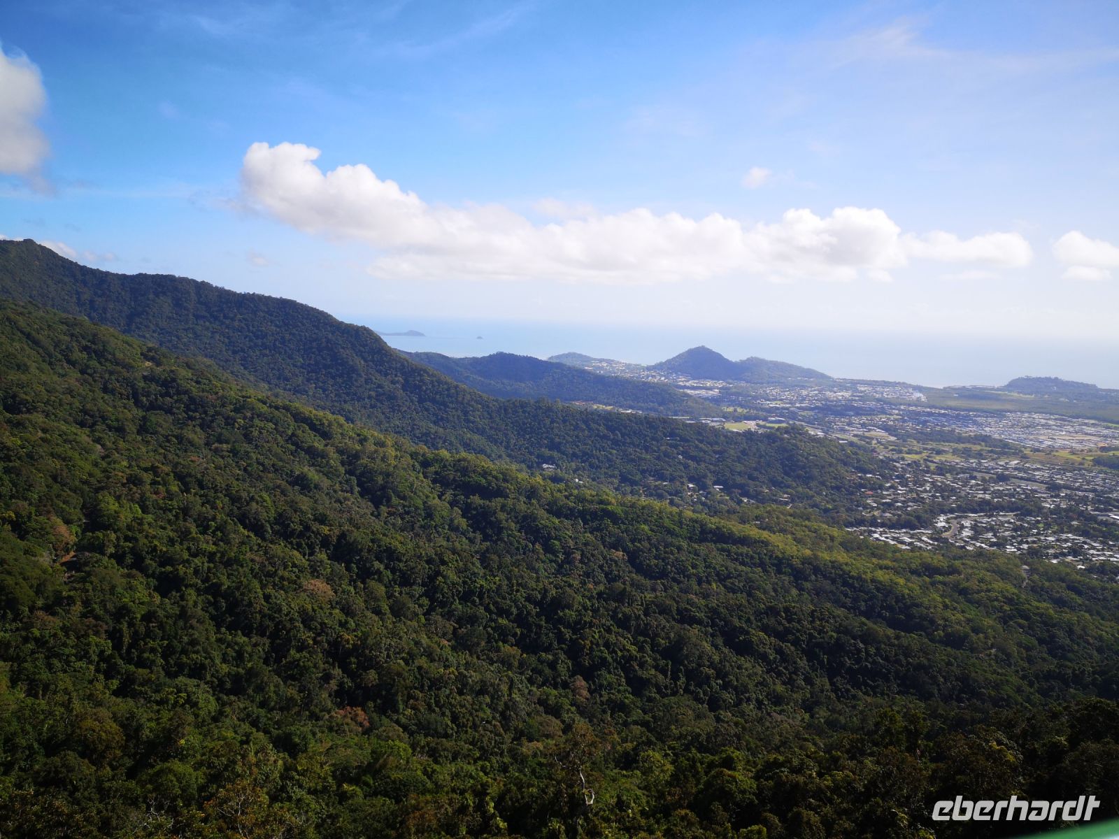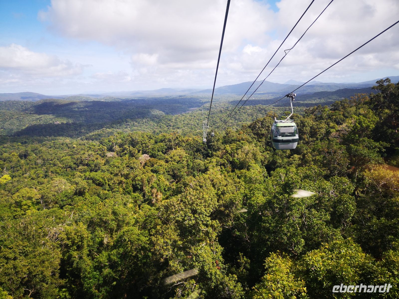 Nach dem wir die Stadt Cairns gestern kennenlernten, geht es heute in das Hinterland der Stadt, in einen Teil des riesengroßen Regenwalds der sich hier an der Küste entlang ausgebreitet hat. Da es keine einfache Möglichkeit gibt den Regenwald auf eigene Faust zu begehen und es auch kaum Wege gibt, bedienen wir uns einer sehr attraktiven Alternative. Wir fahren mit der Seilbahn „Skyrail“ über und in den Regenwald. Es gibt immer wieder Stationen an denen man aussteigen und ein abgegrenztes Gebiet im Wald erkunden kann. Mächtige Baumstämme, 50..70 Meter hoch, bewachsen von schmarotzenden Kletterpflanzen Buschwerk mit Wiederhacken, pragmatisch werden sie als „Wait a while“ bezeichnet, denn immer wenn sich einer der Austriebe mit seinen Widerhaken an der Kleidung festhakt, dann wartet die Person eine Weile, bis er sich von den Haken bereit hat.