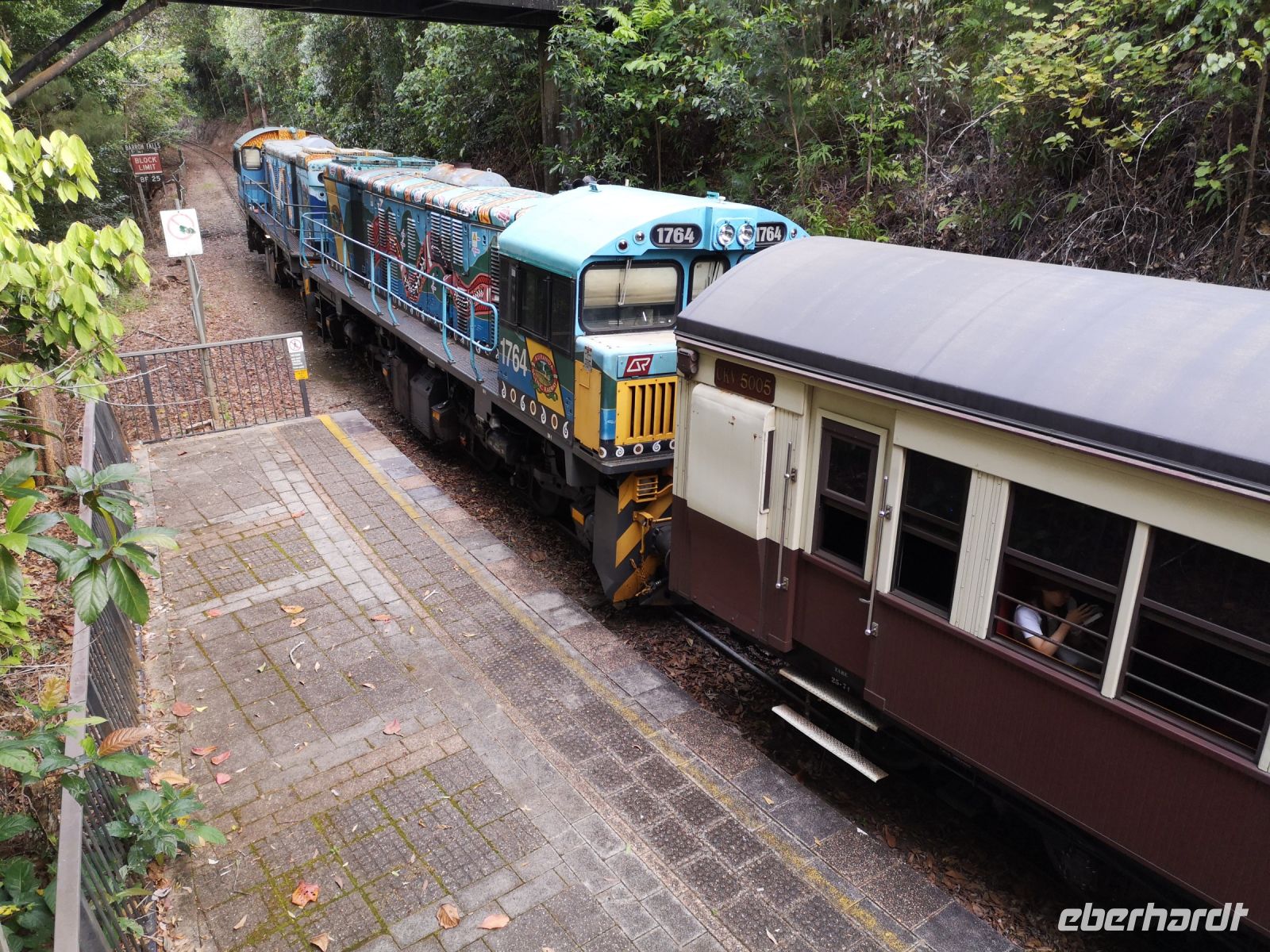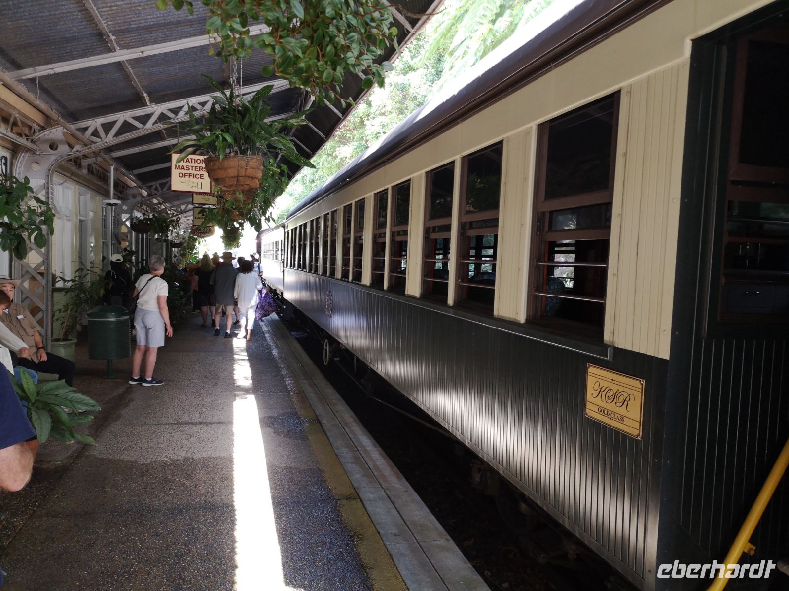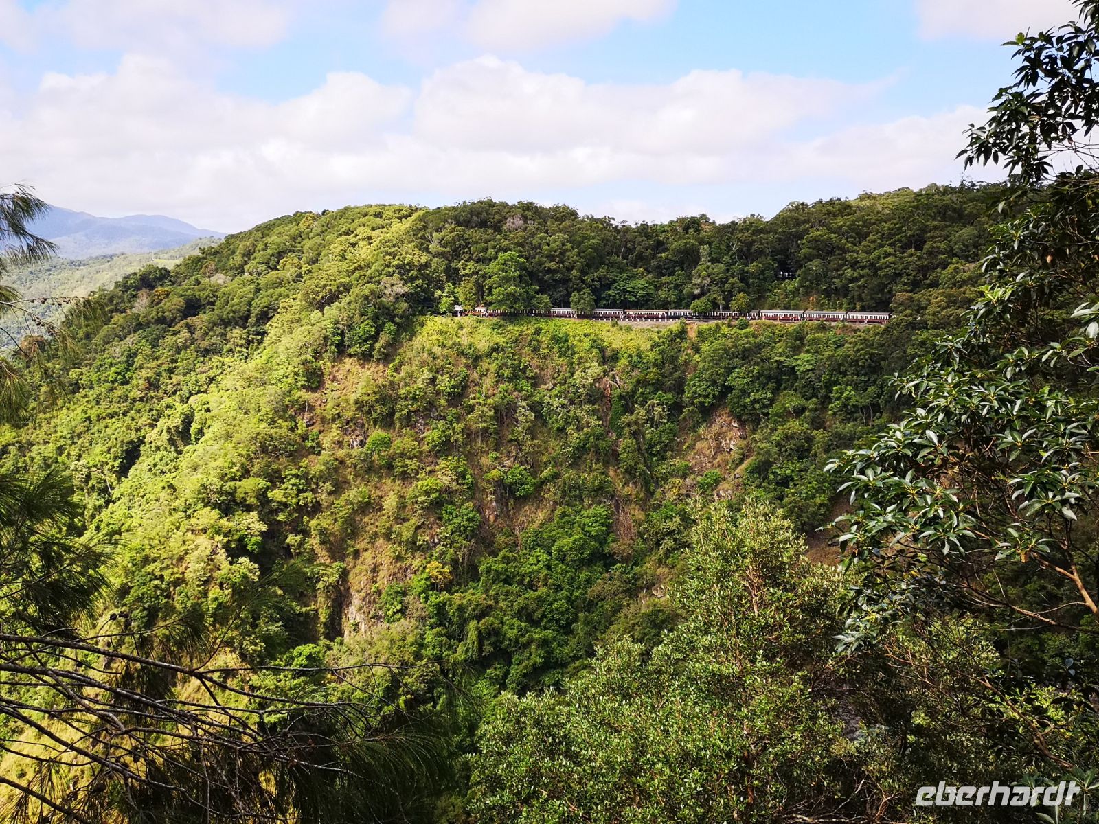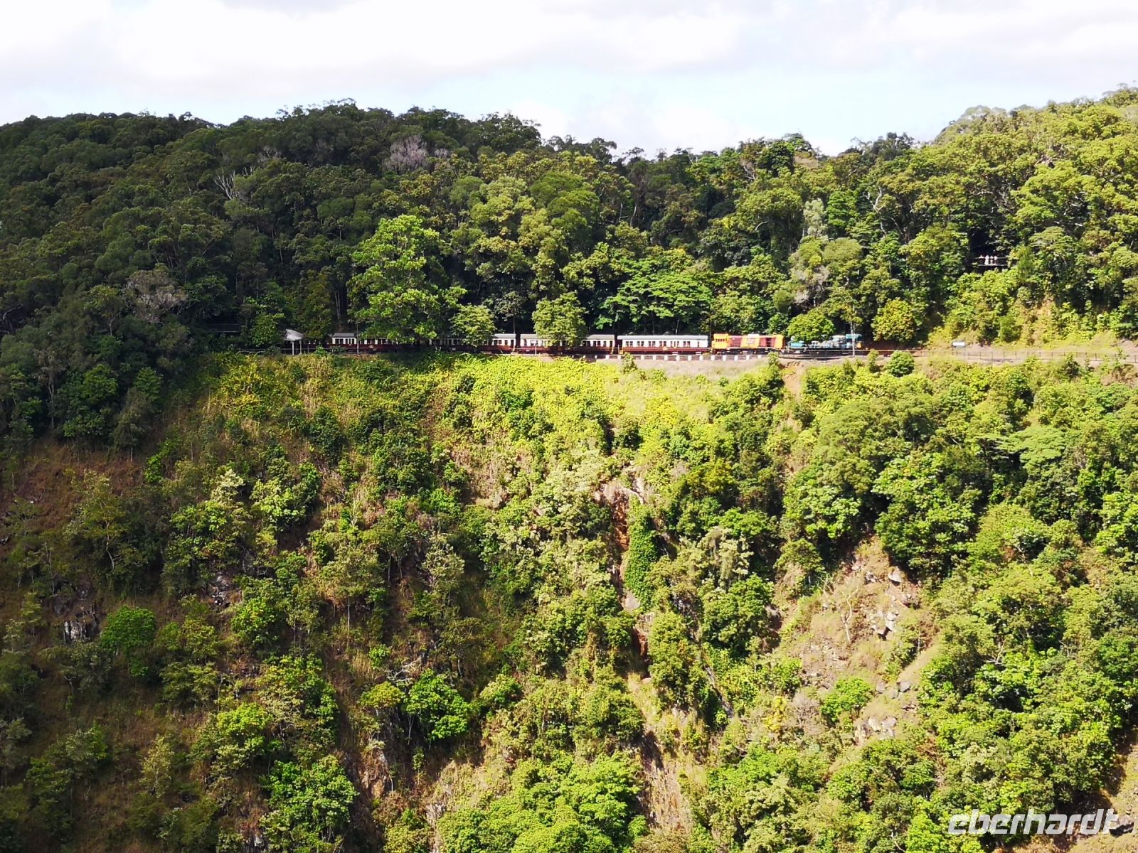 Anschließend, nach einem entspannten Bummel durch den Ort Kuranda geht es wieder zurück nach Cairns, nun aber nicht mit der Seilbahn, sondern mit dem historischen Zug, dem „Kurunda Scenic Train“ fahren wir zurück. Die Strecke der Scenic Railway wurde 1886 erbaut, zur Versorgung der Goldgräberstadt Kuranda. Die historischen Waggons und die 2 Lokomotiven stammen aus der Zeit von 1966, sie wurden ursprünglich im Verkehrsnetz von Brisbane eingesetzt. Die Strecke verläuft über filigrane historische Brücken, vorbei an tiefen Schluchten und hohen Wasserfällen. Eine atemberaubende Landschaft zieht an uns vorbei, an zwei Haltestellen können wir aussteigen wo herrlich Fotos entstehen.