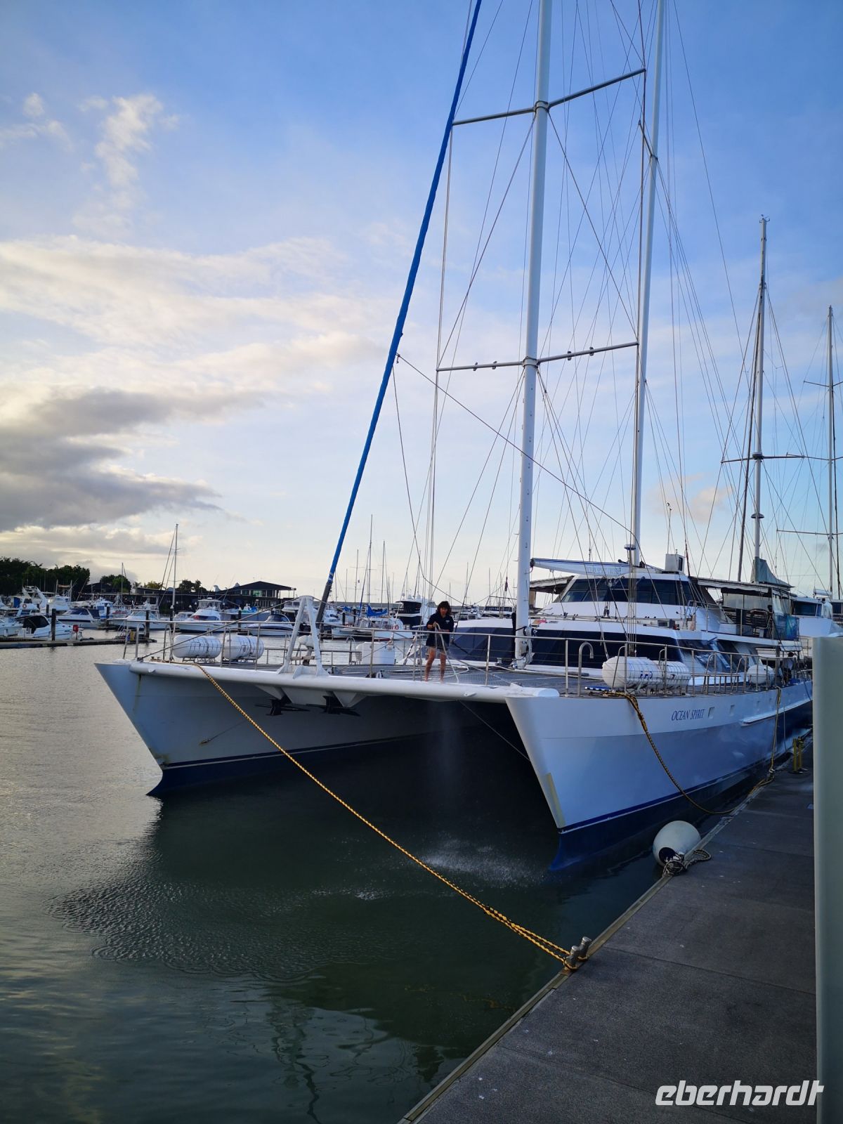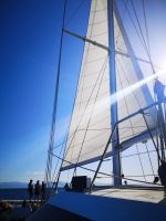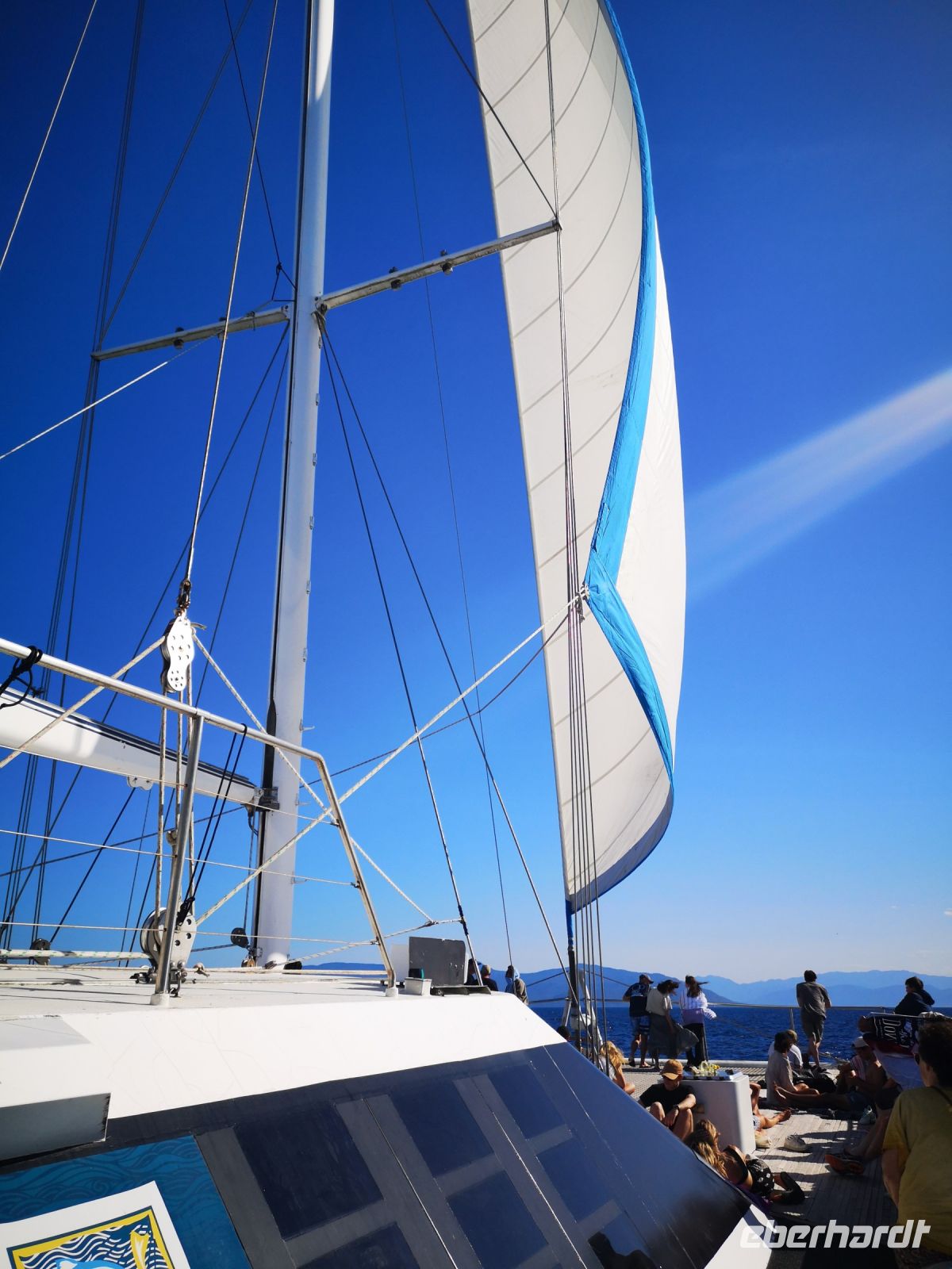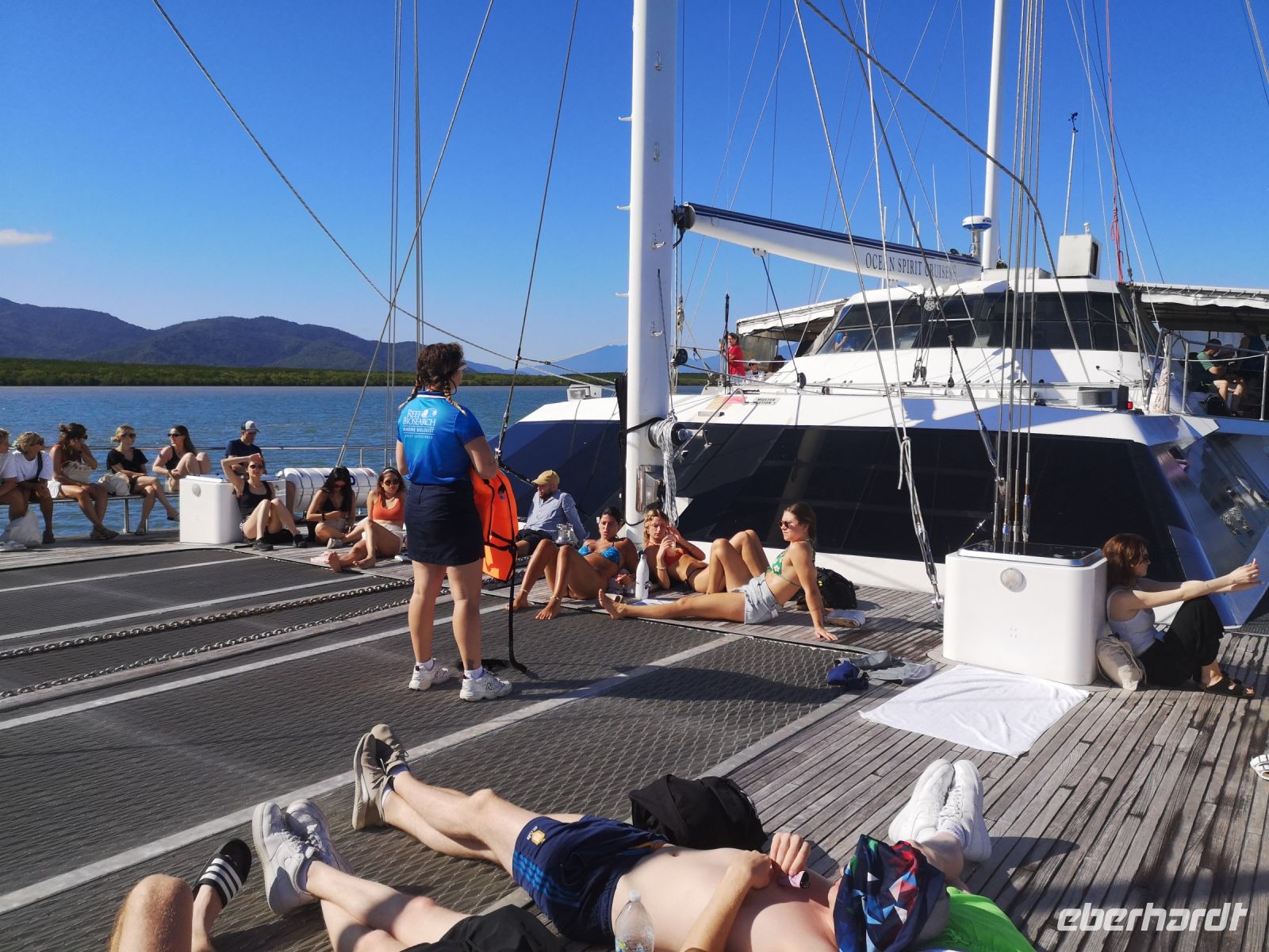 Trotz der Begeisterung für Fische und Korallen kommt irgendwann der Hunger. Dafür gibt es auf dem Katamaran eine Lösung. Mit dem Tenderboot lassen wir uns zurück auf das große Deck des Katamarans bringen, wo schon ein Buffet bereitsteht. Es ist ein super Tag hier draußen auf dem Ozean. Am späten Nachmittag geht es zurück. Es ist genügend Platz am Sonnendeck, und bei schönstem Wetter geht es mit gesetztem Segel zurück in den Hafen nach Cairns.