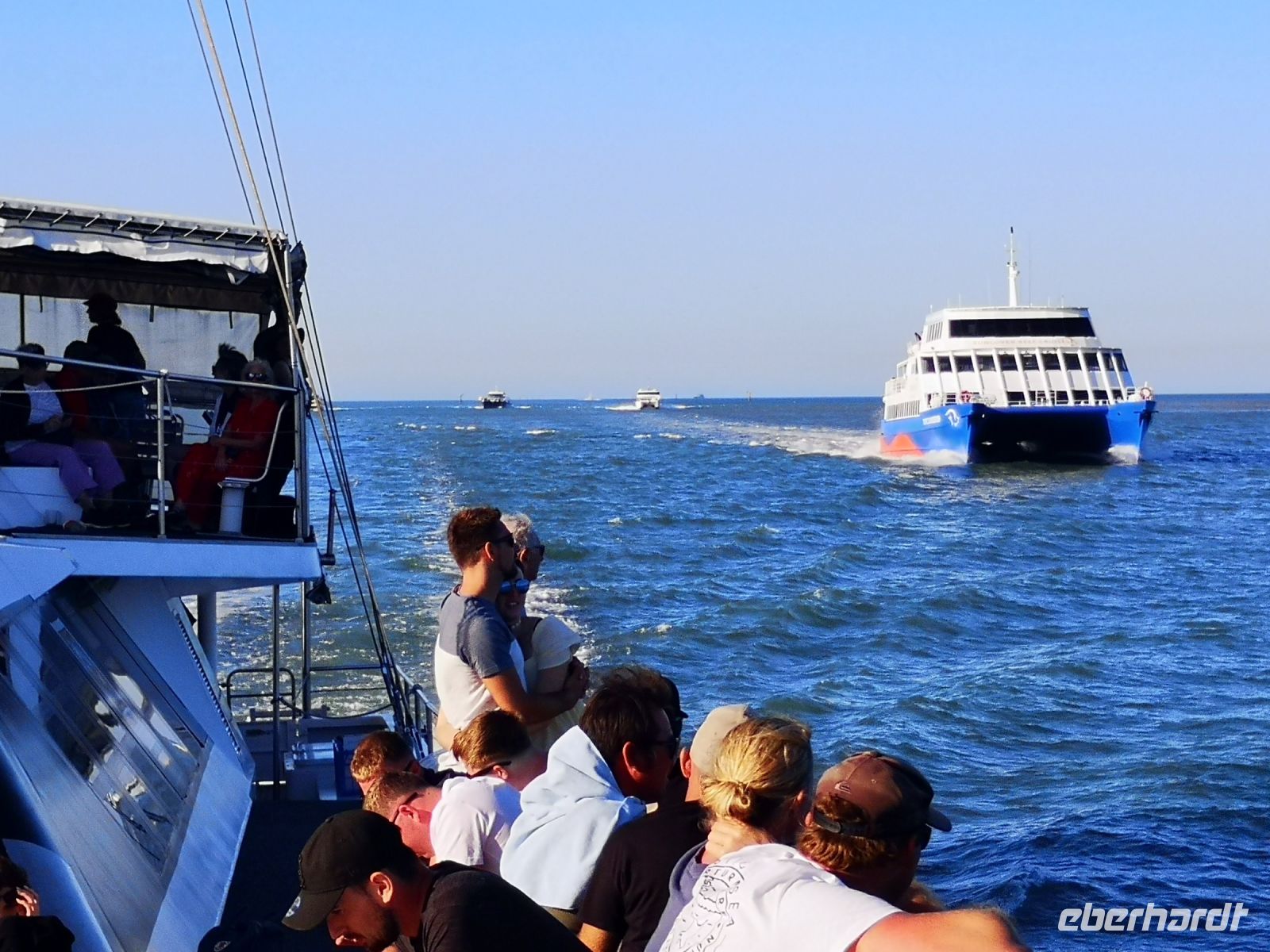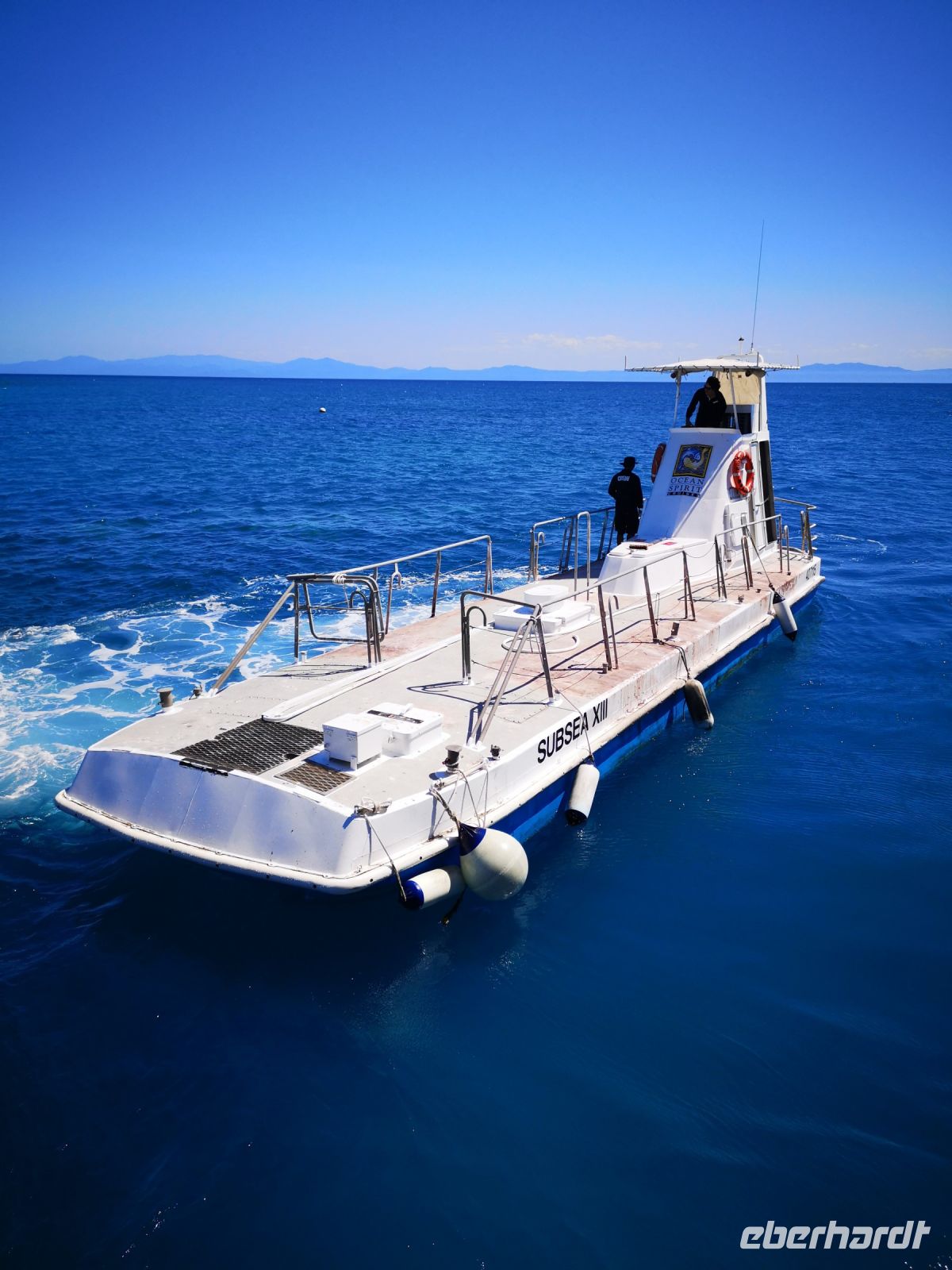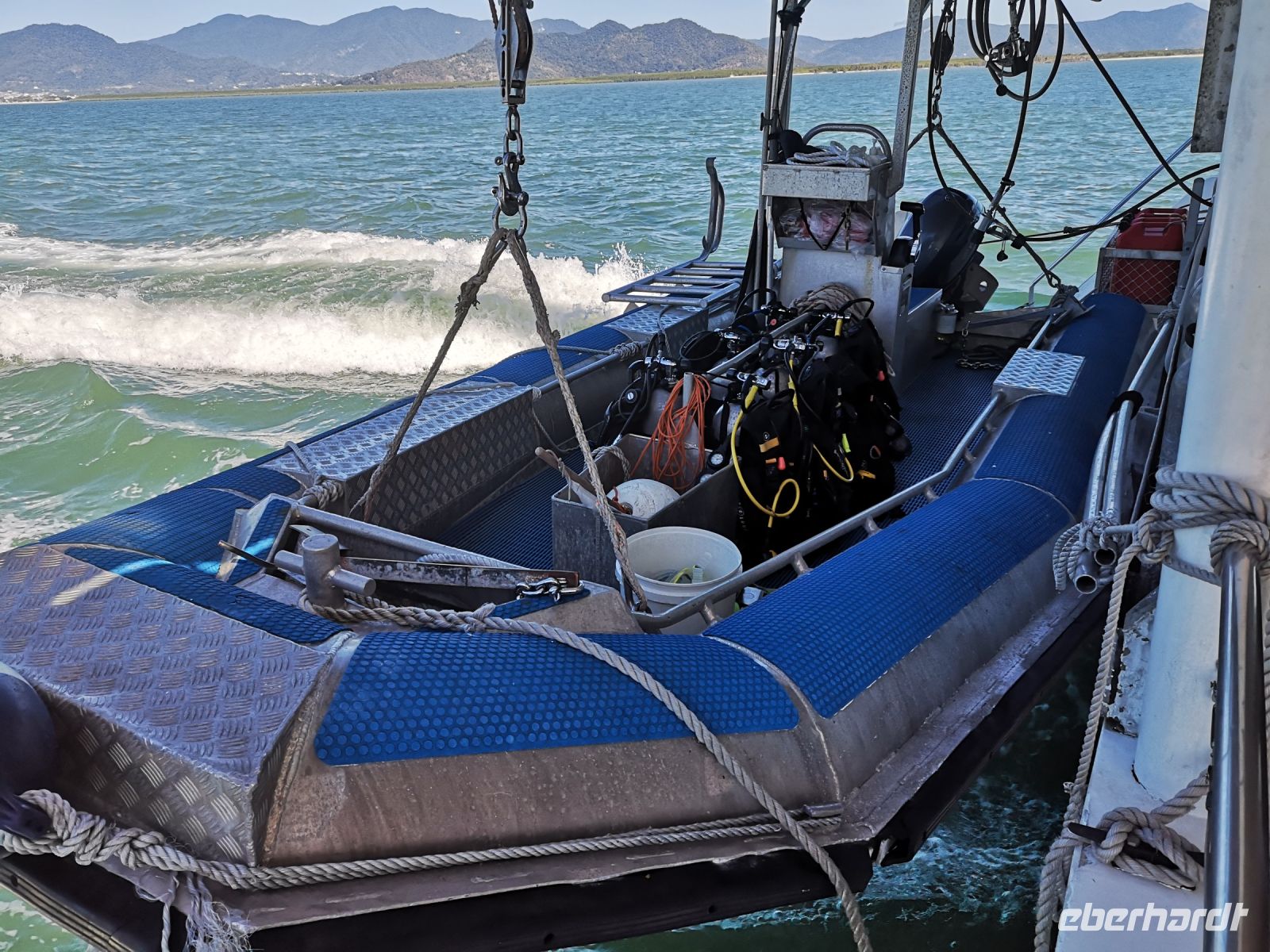 Trotz der Begeisterung für Fische und Korallen kommt irgendwann der Hunger. Dafür gibt es auf dem Katamaran eine Lösung. Mit dem Tenderboot lassen wir uns zurück auf das große Deck des Katamarans bringen, wo schon ein Buffet bereitsteht. Es ist ein super Tag hier draußen auf dem Ozean. Am späten Nachmittag geht es zurück. Es ist genügend Platz am Sonnendeck, und bei schönstem Wetter geht es mit gesetztem Segel zurück in den Hafen nach Cairns.