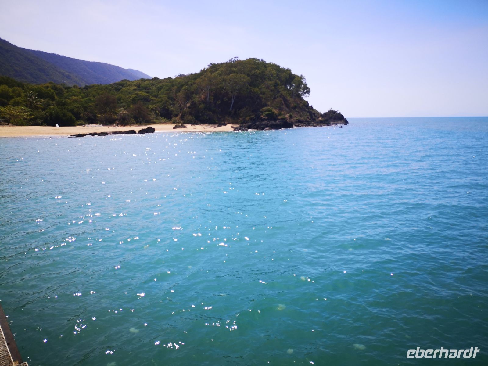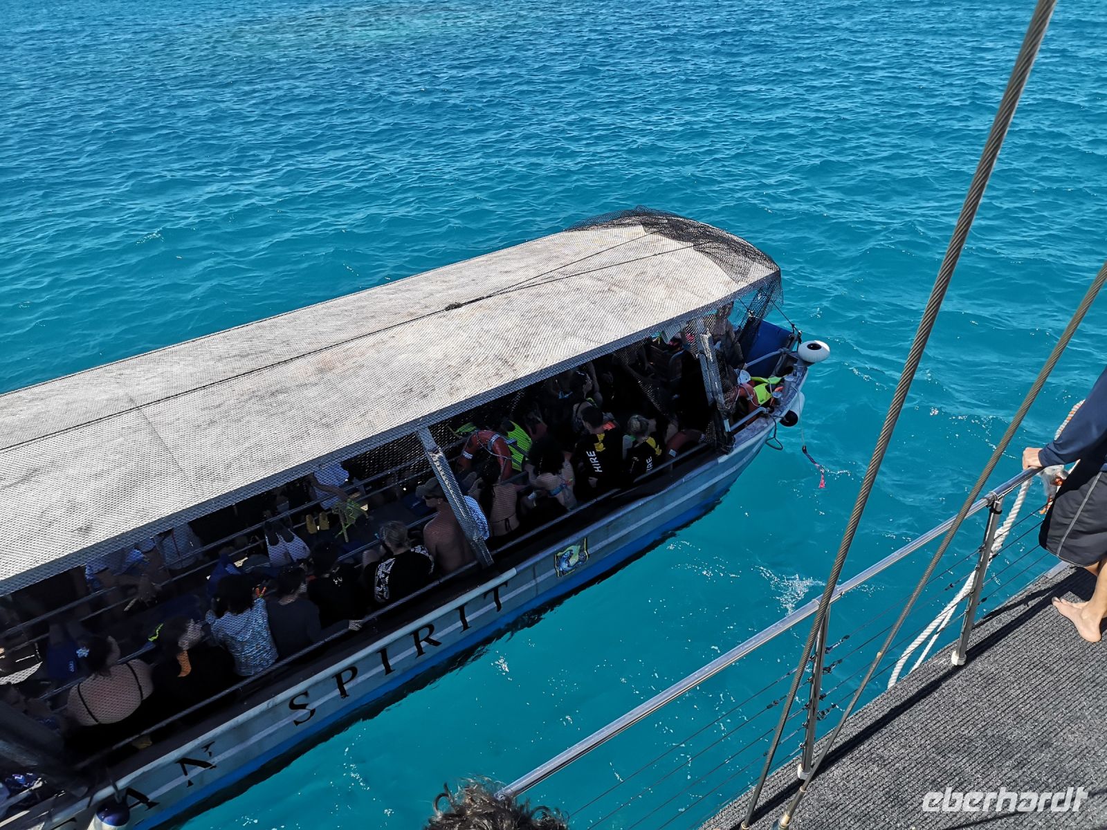 Und genau dieses Riff wollen wir uns heute anschauen und in dem kristallklaren Wasser schwimmen und schnorcheln. Mit dem Katamaran „Ocean Spirit“ fahren wir heute Morgen ca. 2 Std, bei herrlichem Sonnenschein auf das Meer hinaus bis zur Michaelmas Cay, einer kleinen Vogelinsel die nur knapp über dem Meeresspiegel liegt. Wir machen vor der Insel an Bojen fest und sind alle erstmal begeistert von dem Anblick des türkisfarbenen Meers, der leuchtend weißen Sandinsel und den Schatten die wir unter dem Wasser sehen konnten, was Teile des großen Great Barrier Reefs sind. Um sich dieses schöne Riff näher anschauen zu können liegt hier in der Bucht ein Boot mit Sitzplätzen unter dem Meeresspiegel und seitlichen Fenstern. Damit kann jeder das Riff und seine Bewohner bestaunen. Von oben wird es gesteuert, möglichst nahe an die Korallen heran.