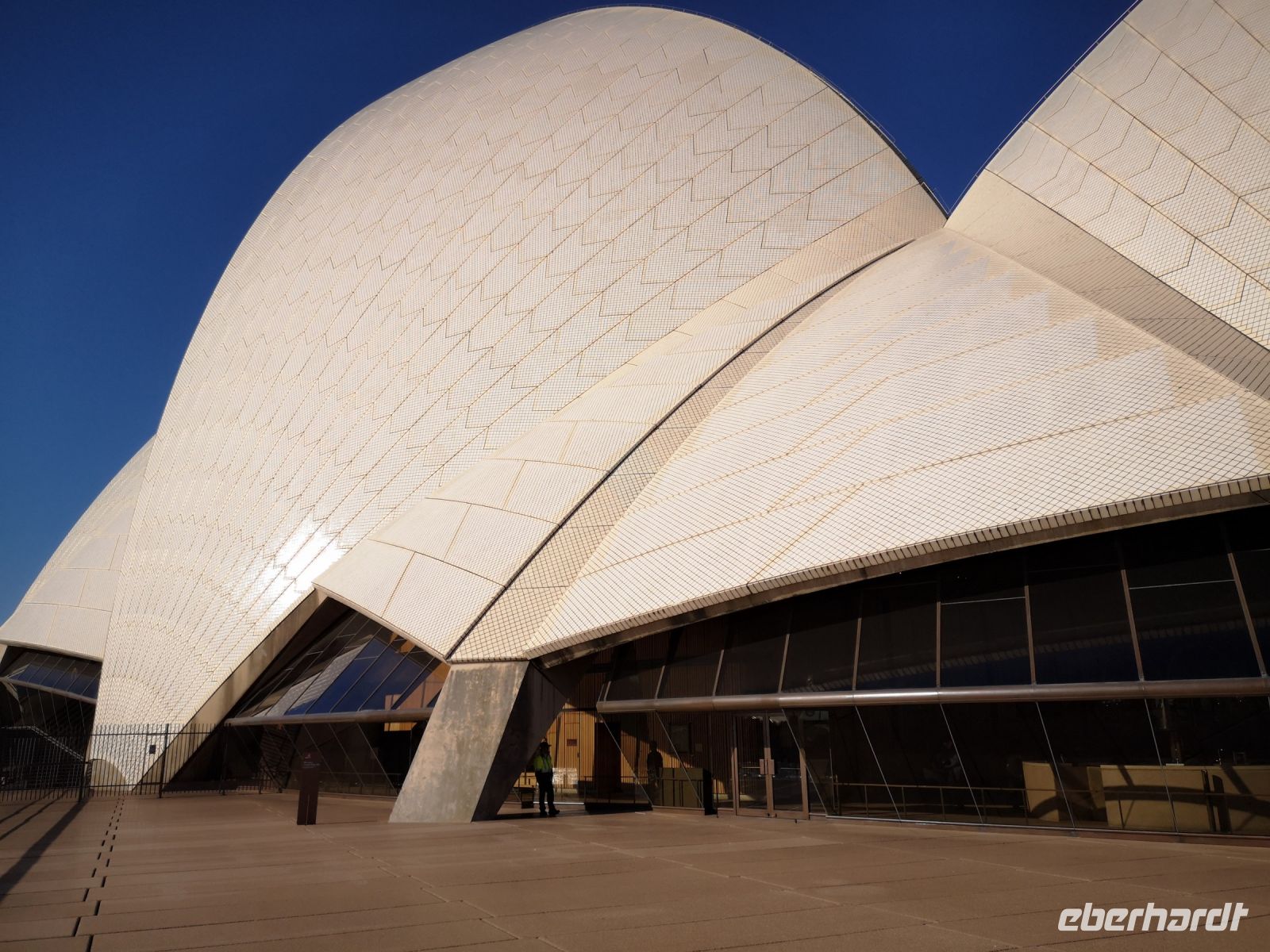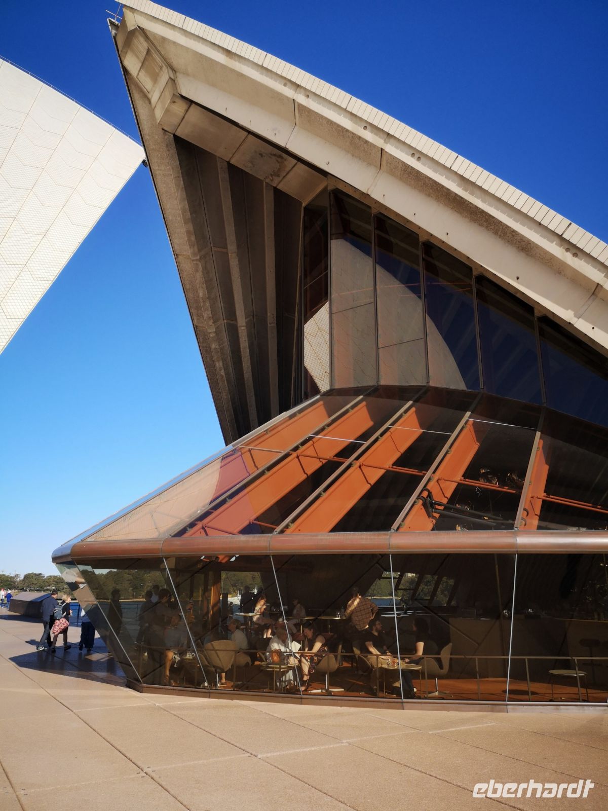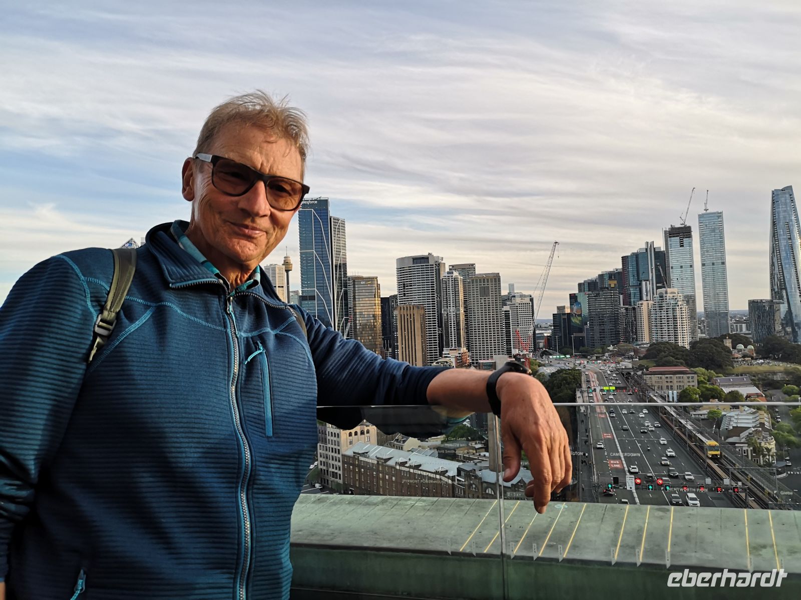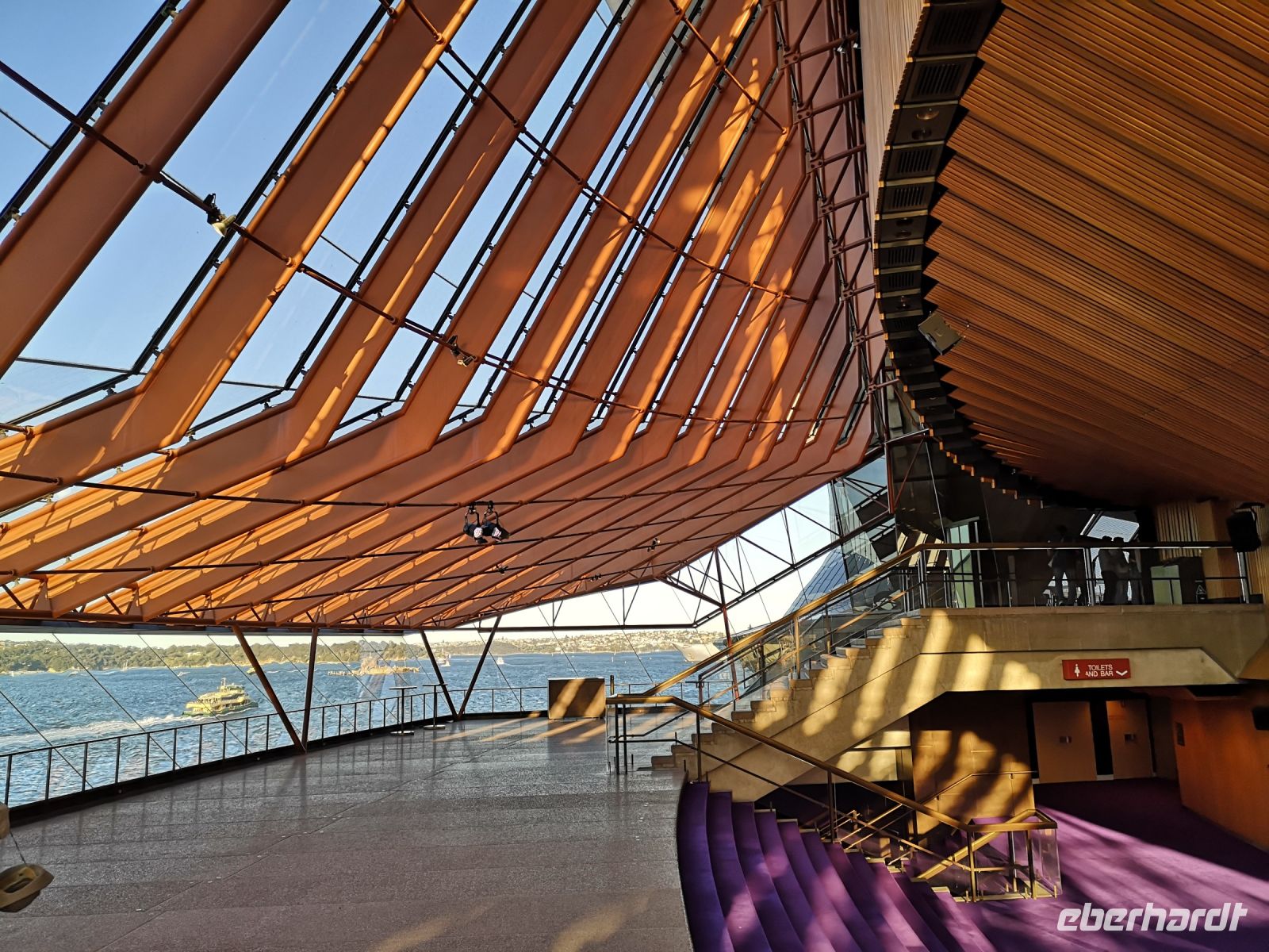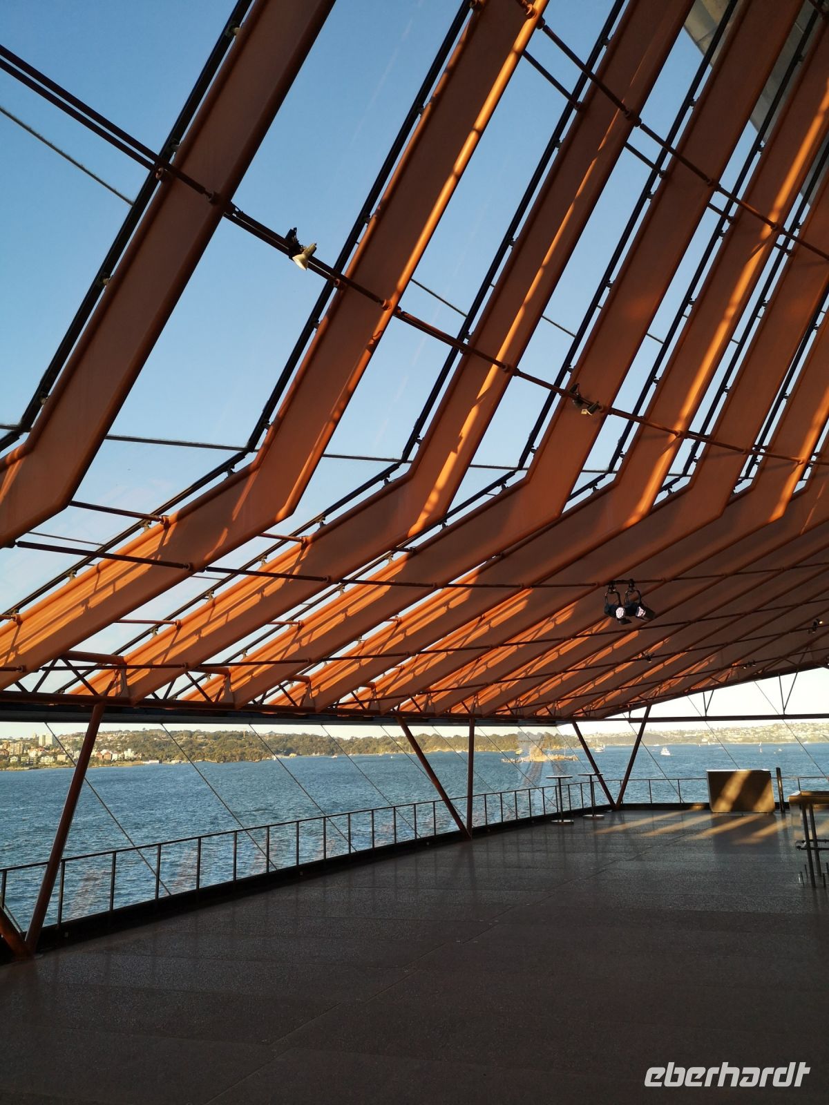 Die ganzen Sehenswürdigkeiten Sydney’s auf einem Blick vor uns. Habour Bridge, Opernhaus die glitzernde Skyline am Circular Quay. Dann unter der Brücke hindurch zum Darling Habour. Die Sicht auf die Stadt, nun vom Wasser aus, ist faszinierend. Das nächste Highlight ist eine Führung durch das berühmte Opernhaus. Hier sind wir ganz nahe an der Architektur, können die leuchtenden Fließen der Dachkonstruktion berühren. Im Innenraum tritt das Licht über die großen Fensterflächen gleichmäßig in die Aula der Oper ein. Wir besuchen die Konzertsäle die teilweise durch Requisiten für abendliche Aufführungen vorbereitet sind. Uli kennt sich im Opernhaus sehr gut aus, und übernimmt die Führung komplett selbst. Andi der der eigentliche Fremdenführer der Oper, lässt sie machen, denn er kennt ihre Qualität und direkt in deutscher Sprache ist es viel einfacher.