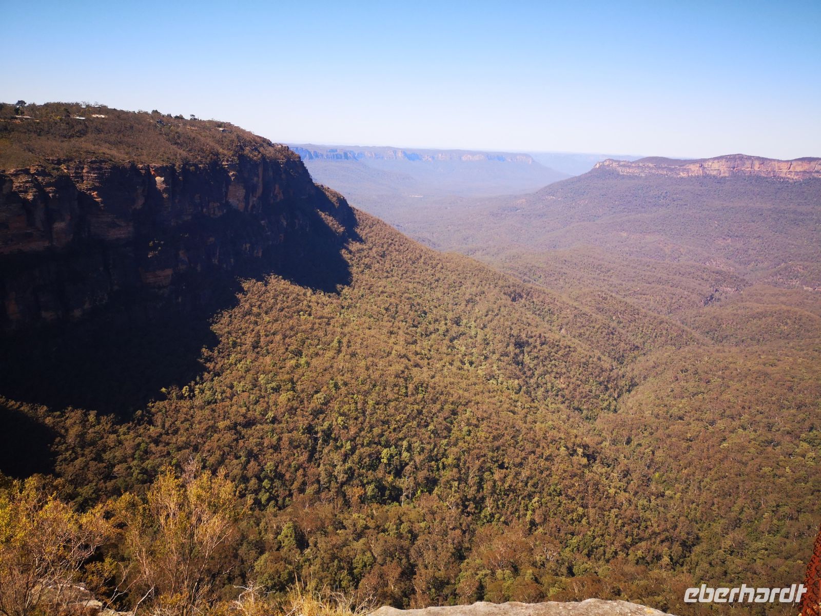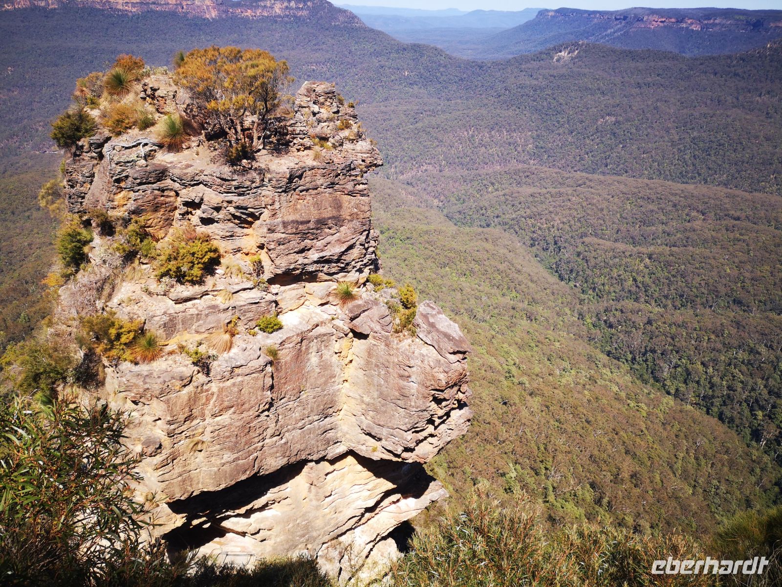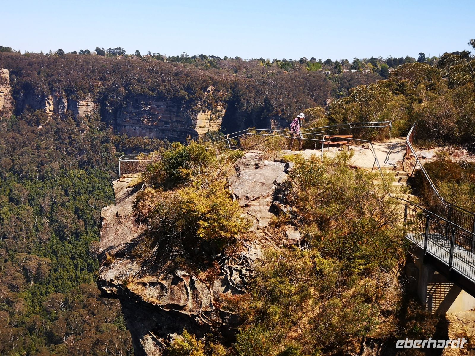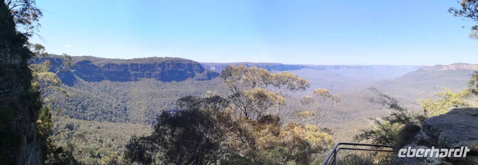 Wieder haben wir auch heute tolles Reisewetter, Sonne und klarer blauer Himmel. Perfekt um heute in die Blue Mountains zu fahren. Wir fahren von Sydney am Morgen los und entscheiden uns direkt ohne Zwischenstopp nach Katoomba zu fahren. Die Sicht in den riesengen zusammenhängenden Wald, bestehend aus überwiegend Eukalyptusbäumen ist am Morgen am schönsten. Die Bäume verdunsten über ihre Blätter einen Nebel aus Eukalyptusöl, der als blauer Dunst über den Bäumen schwebt. Durch die Morgensonne ist diese Erscheinung am besten zu beobachten. Die Blue Mountains sind ein Teil des Gebirgsmassives Great Dividing Range. Dieses Gebirge verläuft parallel zur Ostküste Australiens und teilt das Hinterland von der Küste ab. Nach der Besiedelung Sydneys hat man viele Jahre vergeblich versucht die Blue Mountains zu durchdringen um neuen Raum für weitere Siedler zu finden. Erst nach fast 20 jährigem Bemühen gelang es einer Expedition, der unter anderen auch Gregory Blaxland angehörte, das stark bewachsene Bergmassiv zu durchdringen. Sie durchquerten das Gebiet auf derselben Route wo heute der Great Western Highway verläuft. Auf diesem Highway sind wir heute Morgen mit dem Reisebus unterwegs und gelangen zeitig zu dem Aussichtsplateau „Echo Point“. Von hier hat man eine weite Sicht über die Berge, über den Dunst der des blauen Nebels. Direkt im Vordergrund befindet sich die berühmte Felsformation „three sisters“. Wer trittsicher ist kann hier über einen Pfad absteigen zum Fuß der Felsen gelangen und eine interessante Fotoperspektive auf die drei Schwestern einnehmen. Nach einem längeren Aufenthalt an diesem Plateau und Kletterexkursionen in kleinen Gruppen, versammelten wir uns zur Mittagspause im Restaurant The Lookout. Hatten dort auch weiterhin einen super Blick auf die blaue Bergkette, konnten hier entspannt sitzen und ein leckeres Mittagsessen genießen.
