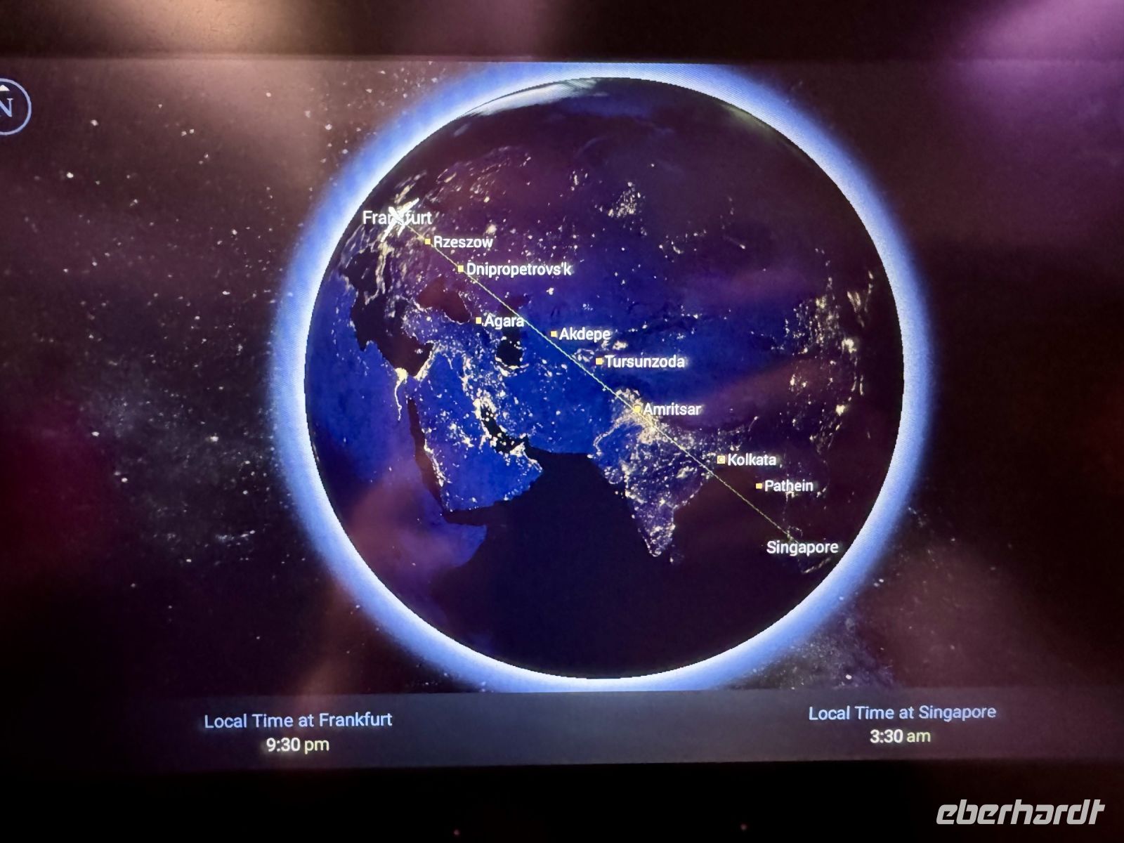 Für meine Gäste erfüllt sich mit dem heutigen Tag ein großer Wunsch, ein großer Lebenstraum: eine Reise nach Australien! Auch die Aufregung ist daher groß, als wir uns auf dem Frankfurter Flughafen vor dem Schalter von Singapore Airlines treffen, um unsere Koffer abzugeben. Fast die Hälfte der Gruppe ist mit der Bahn angereist, was nach den ganzen Streiks in den letzten Monaten erstaunlich gut geklappt hat. Sechs Gäste hatten Zubringerflüge aus Berlin bzw. Dresden, zwei weitere sind schon in Singapur und zwei von Zürich aus auf dem Weg dorthin. An der Sicherheitskontrolle ist nicht viel los; auch durch die Passkontrolle sind wir schnell durch. Bleibt noch mehr als genug Zeit für ein kleines Abendessen, bevor das Boarding beginnt, wir im Flugzeug freundlich von der Crew begrüßt werden und unsere Plätze im riesigen Airbus A380 einnehmen. Nach dem Start bekommen wir nochmals ein Abendessen serviert, bevor schließlich das Licht gedämmt und Ruhezeit verordnet wird, während unser Flieger in Richtung Südostasien steuert.
