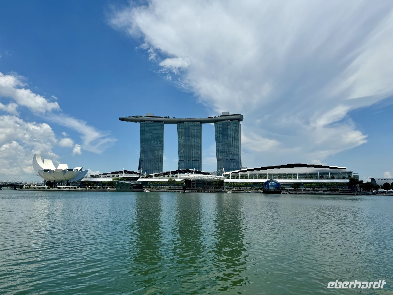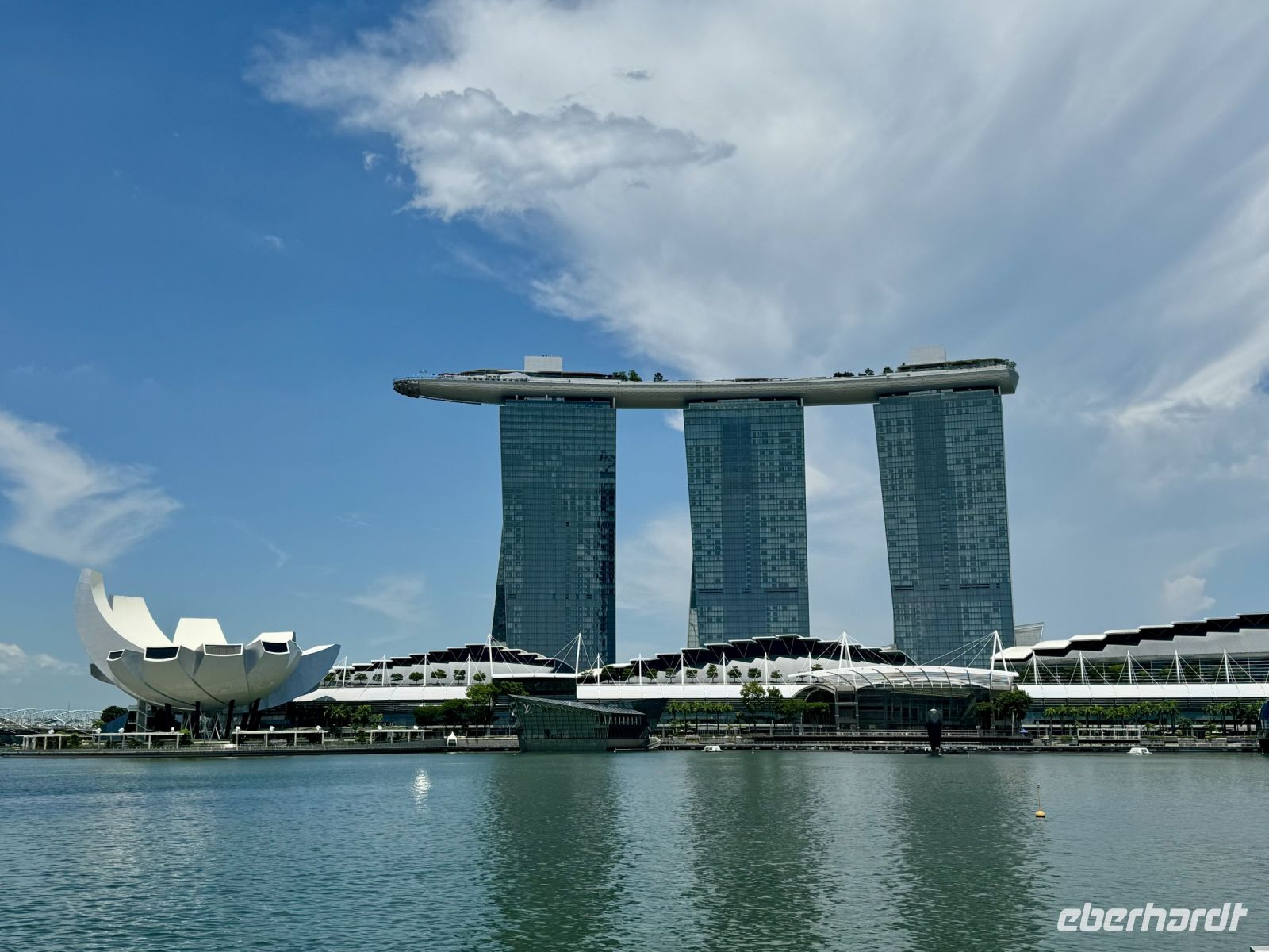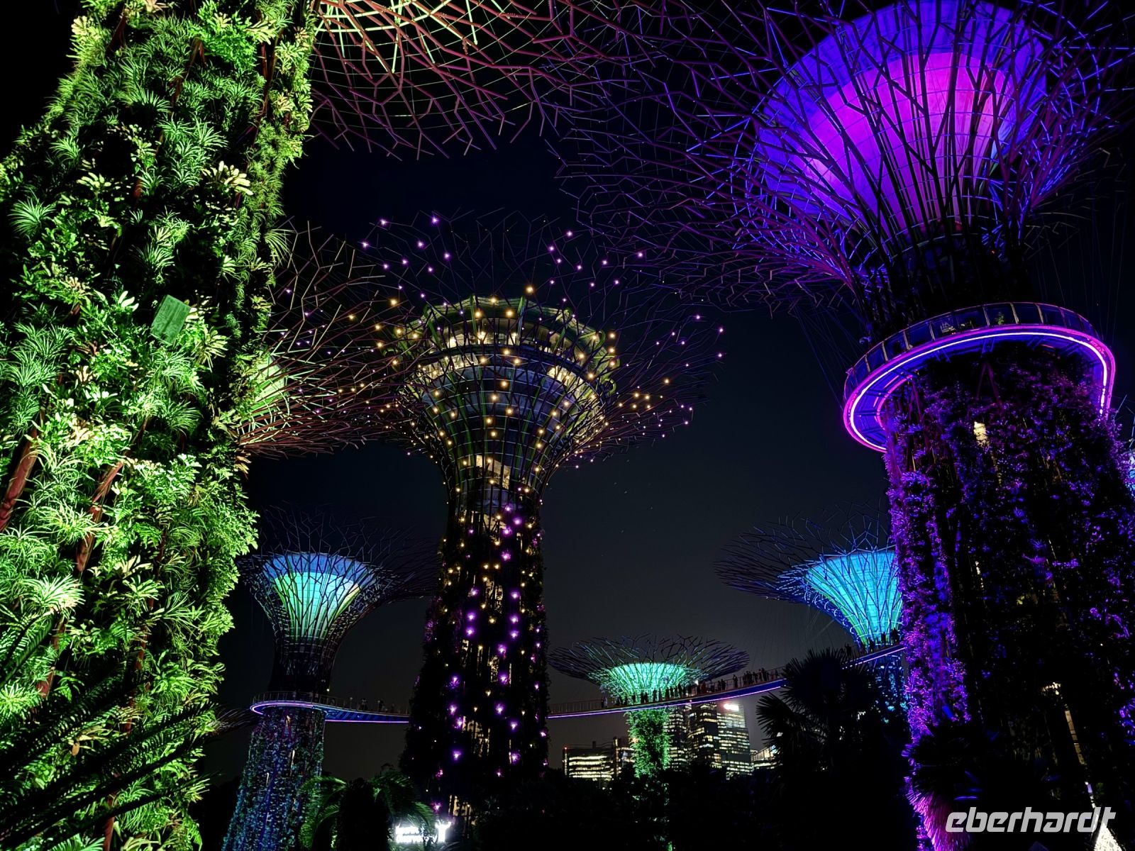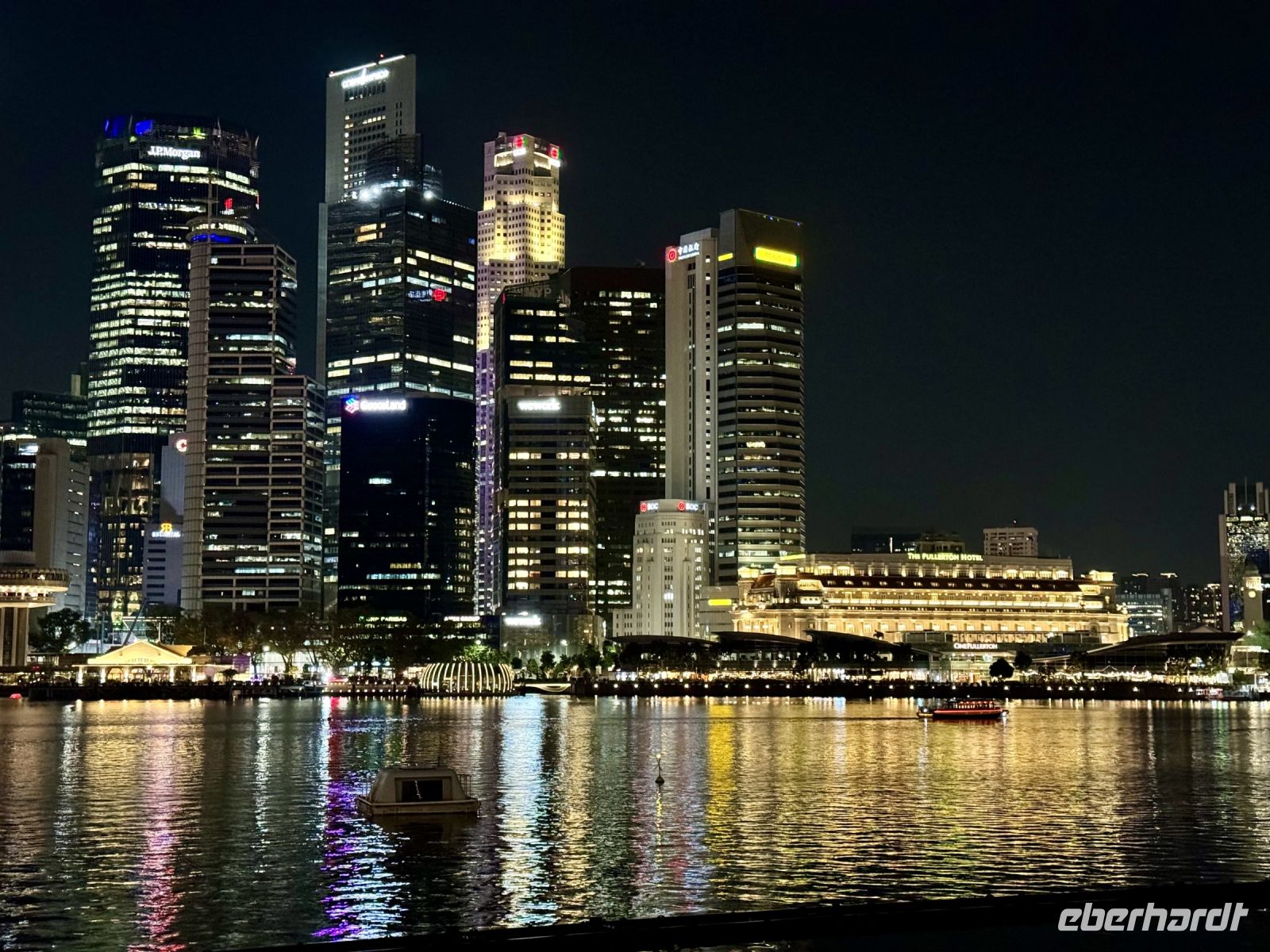 Als wir überpünktlich in Singapur landen, ist es dort aufgrund des Zeitunterschieds bereits Nachmittag. Die durchautomatisierte Einreise klappt dank Online-Voranmeldung durch Eberhardt problemlos und unsere Koffer haben wir ebenfalls schnell abgeholt. Draußen werden wir bereits von unserem sehr enthusiastischen Stadtführer Alvin erwartet, zum Bus gebracht und zum Hotel transferiert. Unterwegs gibt er uns bereits einige Informationen zur Orientierung und zur historischen Landgewinnung, denn gut 20 Prozent der Fläche wurden seit Ende des 19. Jahrhunderts dem Meer abgetrotzt. In unserem schicken Carlton Hotel gewährt uns Alvin eine Erholungspause, bevor wir mit dem öffentlichen Bus nochmal gemeinsam in Richtung Marina Bay Sands Hotel aufbrechen. Hier verabschiedet er sich für heute von uns und wünscht uns viel Spaß bei den beiden Shows, die wir uns noch anschauen wollen: der Lichtershow im Supertree Grove in den Gardens by the Bay und etwas später dann der Wasser-, Lichter, Laser-Show „Spectra“ vor dem Marina Bay Sands. Zwischendurch bietet sich die Chance auf ein schnelles Abendessen im Food Court des riesigen Nobel-Einkaufszentrums zu Füßen des Hotelkomplexes. Beide Shows sind auf unterschiedliche Weise spektakulär und bilden für meine Gäste einen stimmungsvollen Empfang in Singapur. Mit dem Bus fahren wir anschließend wieder zum Hotel zurück und versuchen dann zu schlafen, was aufgrund des Zeitunterschieds, der (positiven) Aufregung und der vielen neuen Eindrücke gar nicht so einfach ist. Es war ein schöner erster Tag in Singapur und wir sind gespannt auf die morgige Stadtrundfahrt.