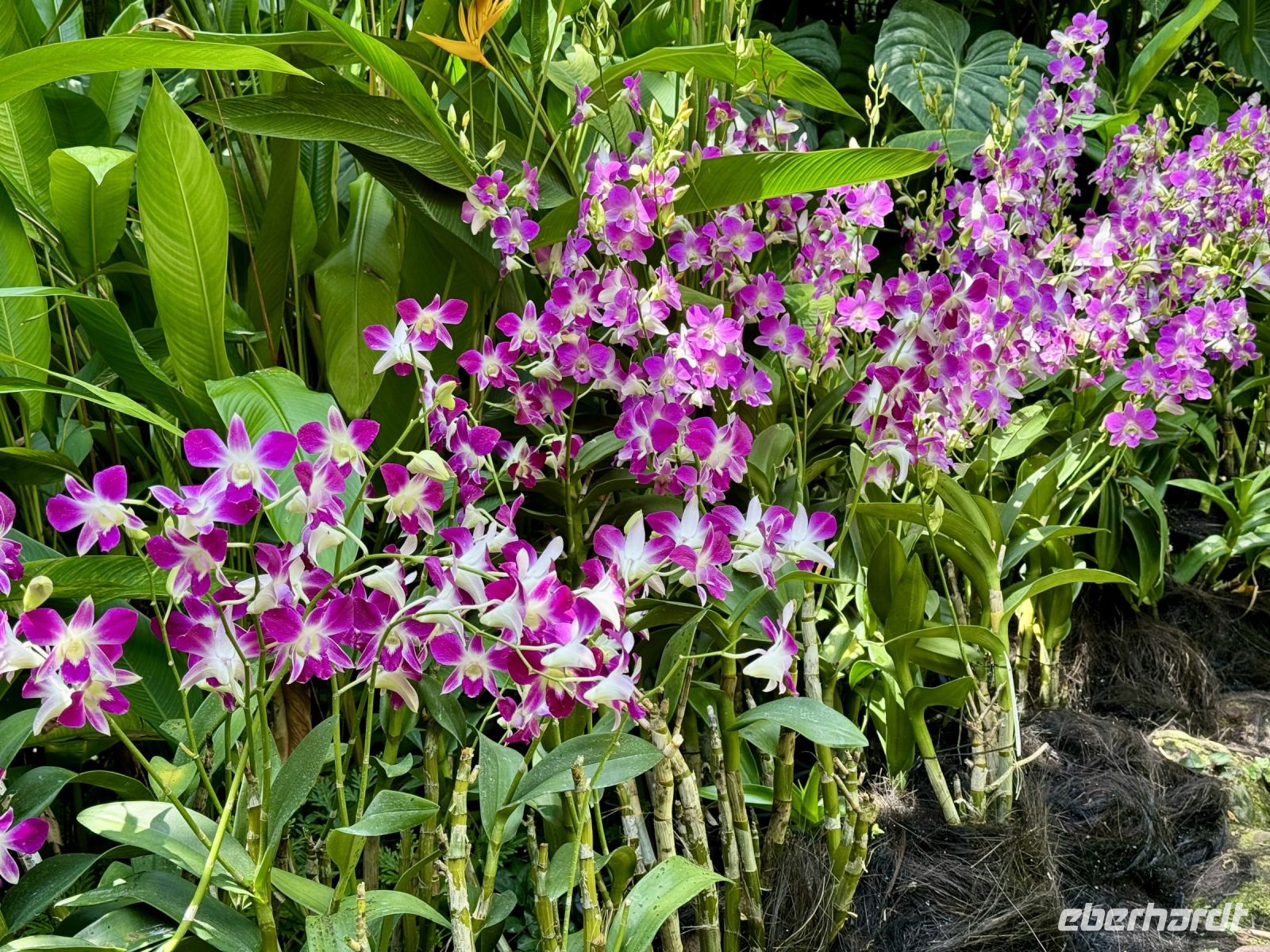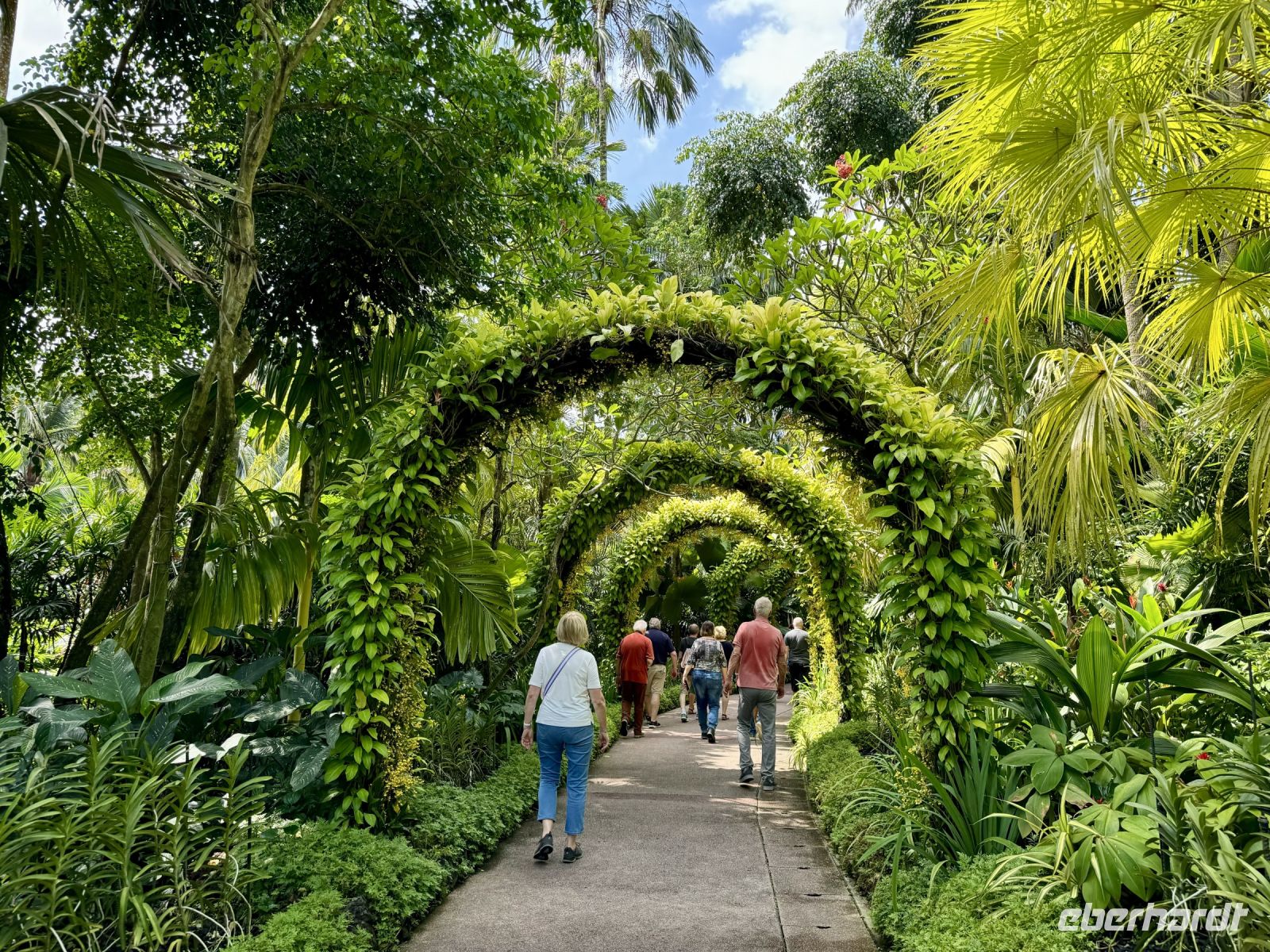 Nach dem gestrigen schönen Abendprogramm wollen wir uns heute zusammen mit Alvin weitere Viertel und Sehenswürdigkeiten des Stadtstaats Singapur anschauen. Wir beginnen mit dem Nationalen Orchideengarten im Botanischen Garten, den ich noch nie so voll wie heute erlebt habe — einem Kreuzfahrtschiff sei Dank. Alvin baut die Führung jedoch sehr geschickt um die anderen Gruppen herum, zeigt uns Ingwerpflanzen, Muskatbäume, Libellen, Holzbienen, fleischfressende Pflanzen, natürlich ganz viele Orchideen und auf dem Rückweg zum Bus verschiedene Bananensorten. Wir sind von seinem breiten Wissen und der herrlichen Blütenpracht gleichermaßen begeistert. Durch die berühmte Einkaufsstraße Orchard Road fahren wir in Richtung Little India und arabisches Viertel. Hier machen wir ebenfalls einen kleinen Spaziergang, um die traditionellen Shop Houses und die Sultan-Moschee zu sehen und zu fotografieren. Nächster Stopp ist dann recht spontan bereits das Marina Bay Sands Hotel, da Alvin etwas besorgt ist, ob sich das Wetter hält. Wir fahren also mit dem Aufzug hinauf zur Aussichtsplattform und genießen einen tollen Blick auf Stadt und Meer. Seine Sorgen in Bezug auf das Wetter sind nachvollziehbar, aber letztendlich unbegründet. Die Wolken verziehen sich schnell wieder; selten habe ich anschließend am Merlion, dem zweiten berühmten Wahrzeichen, mit einer Reisegruppe so schöne Fotos machen können. In Chinatown haben wir Gelegenheit für eine Mittagspause, einen Besuch des buddhistischen Tempels und einen kurzen Bummel durch die Straßen mit ihren vielen kleinen Geschäften und Ständen. Nun müssen wir das Stadtzentrum leider schon wieder verlassen und uns auf den Weg zum Flughafen machen. Wir haben aber einen guten Eindruck von der kulturellen Vielfalt Singapurs erhalten und Alvin hat uns viele interessante Informationen vermittelt, sowohl über die Geschichte als auch über das heutige Zusammenleben der unterschiedlichen ethnischen und religiösen Gruppen. Vor dem Weiterflug nach Perth führe ich meine Gäste auf dem Flughafen noch zum „Jewel“, dem dortigen Einkaufszentrum mit einem riesigen Indoor-Wasserfall. Der Flug nach Perth dauert nochmal rund fünf Stunden, dann landen wir tatsächlich gegen Mitternacht Ortszeit in Australien! Juhu! Die Einreise klappt unkompliziert, Bus und Fahrer stehen bereit, im Hotel direkt im Stadtzentrum werden wir bereits erwartet und sehr freundlich empfangen. Wir sind natürlich etwas erschöpft, aber auch sehr glücklich und aufgeregt, in Australien angekommen zu sein und freuen uns sehr auf die kommenden Tage und Wochen!