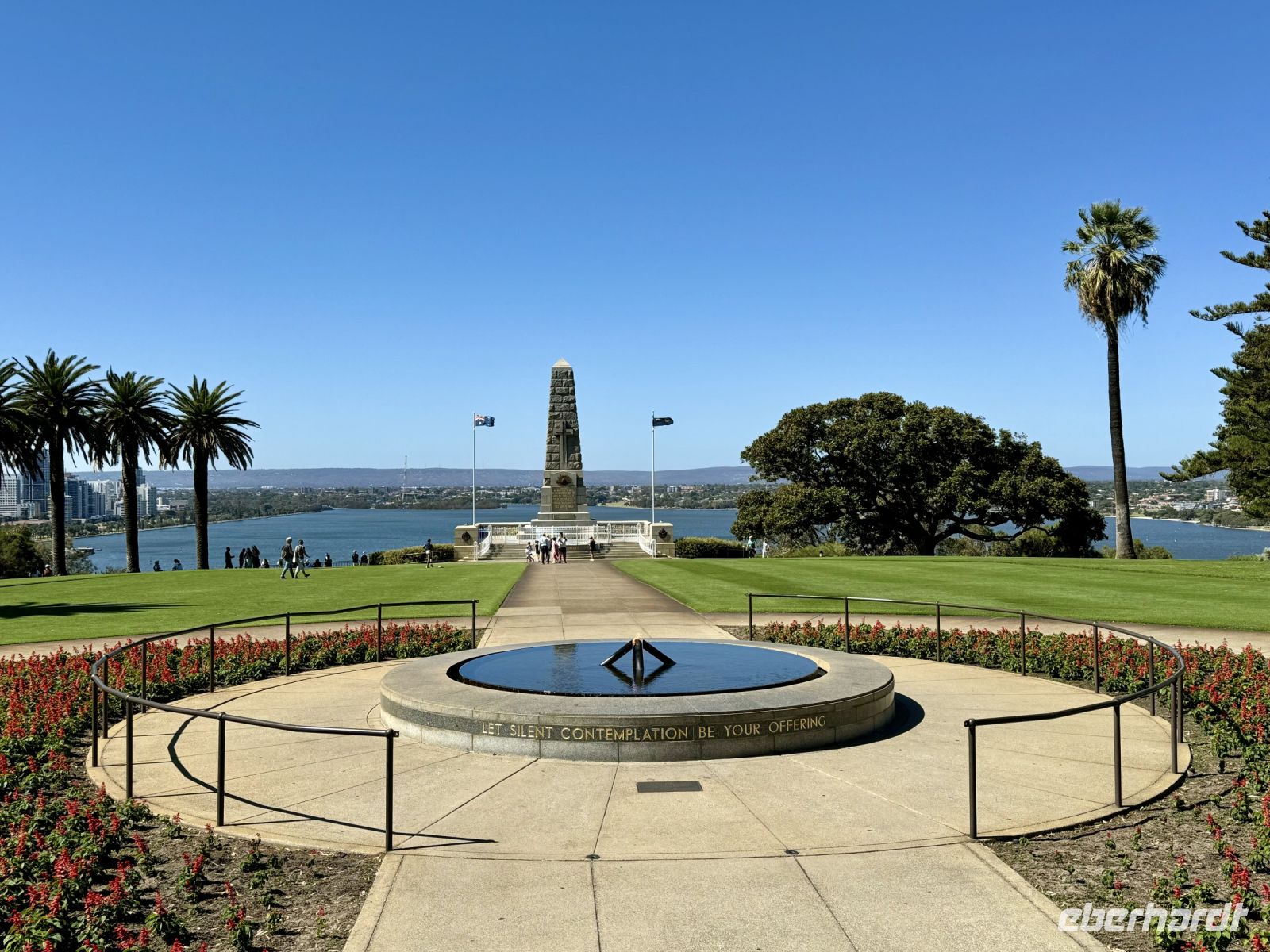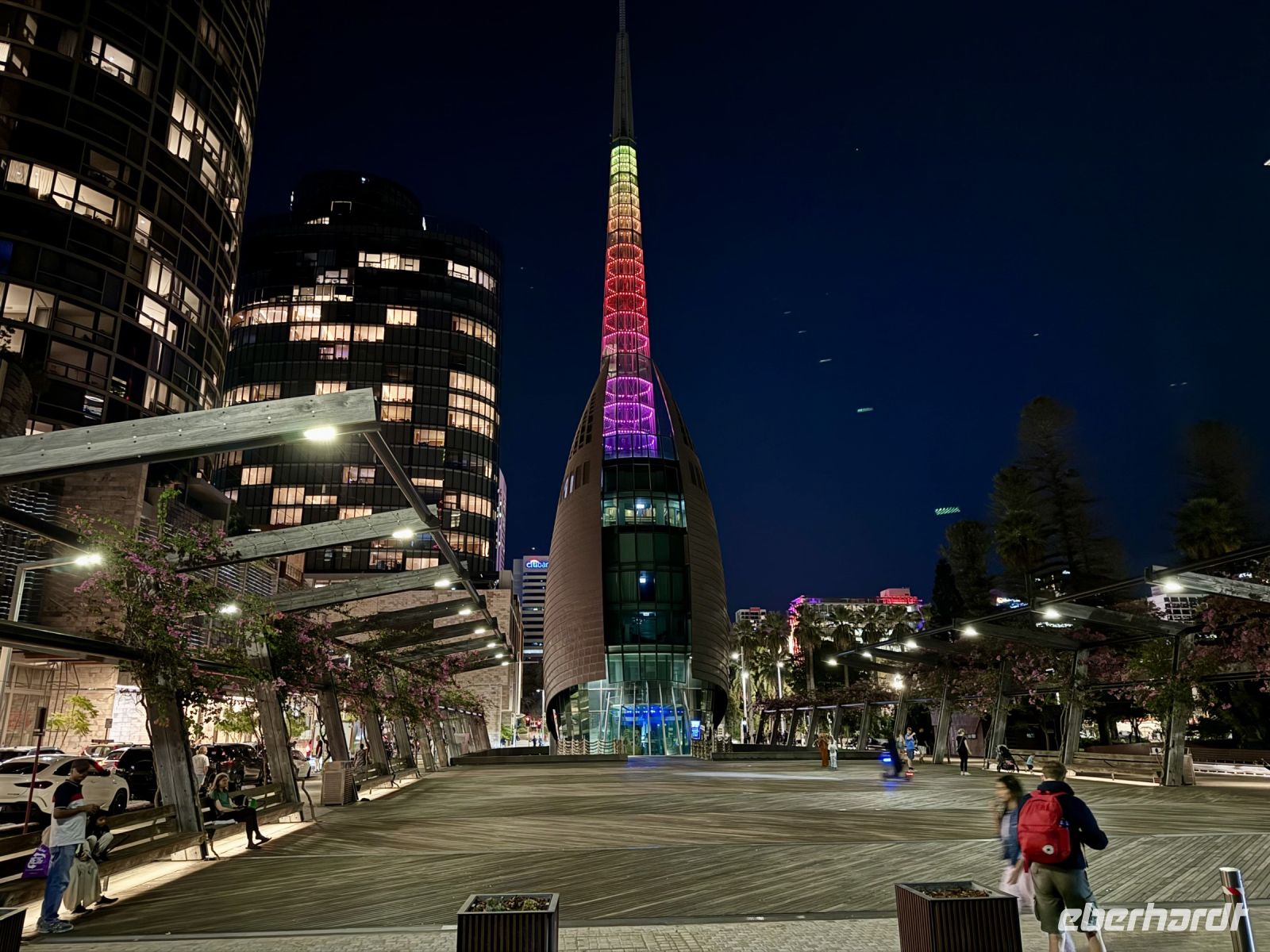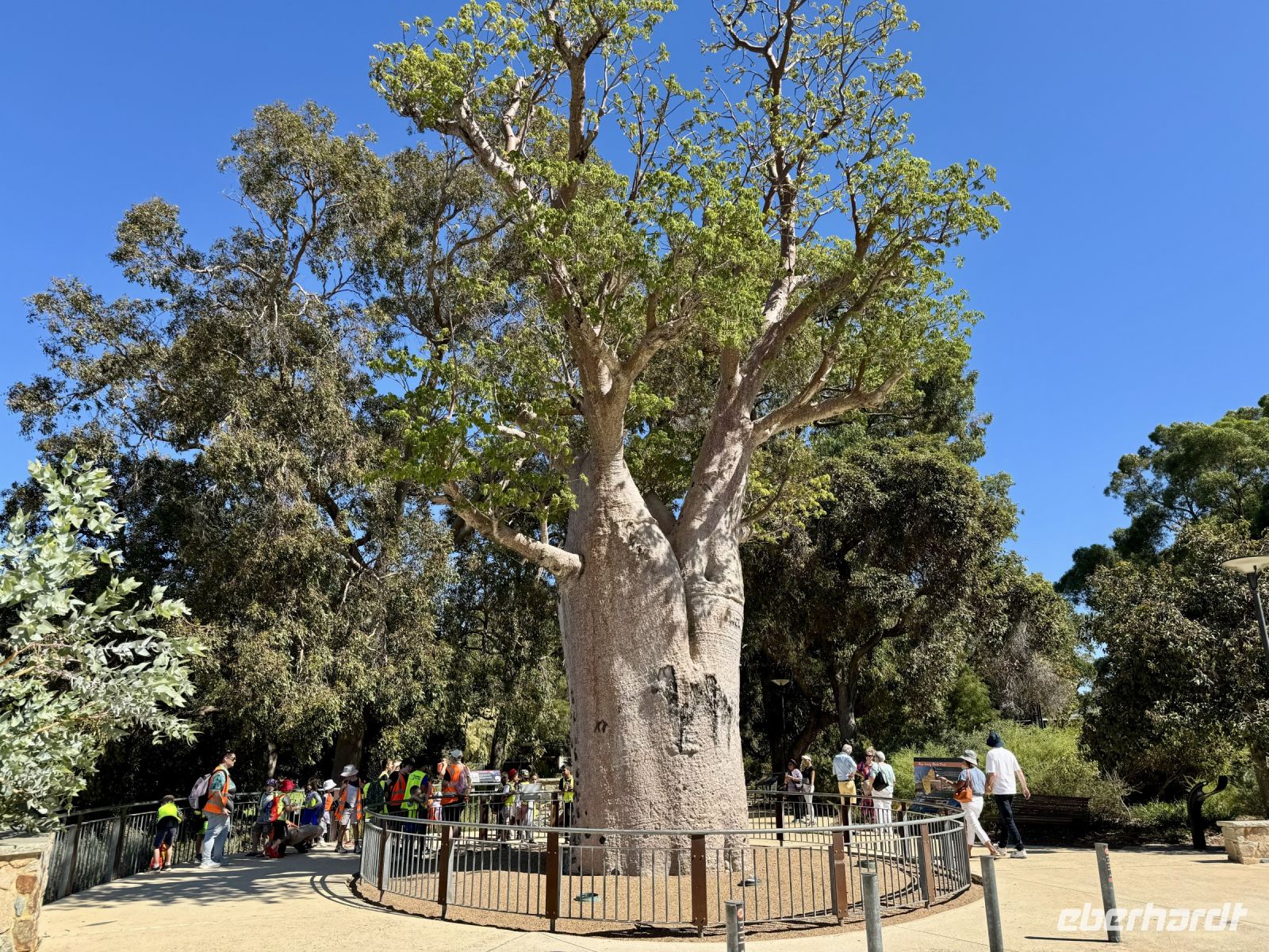 Die erste (kurze) Nacht in Australien liegt hinter uns! Natürlich müssen wir uns alle immer noch an den Zeitunterschied und ab heute auch noch an Vegemite zum Frühstück gewöhnen. Unser Stadtführer Patrick versucht, uns die Eingewöhnung an Australien mit einer umfassenden und informativen Stadtrundfahrt durch Perth zu erleichtern. Wir verlassen die Innenstadt zunächst, um von South Perth aus einen Blick auf die Skyline des CBD am gegenüberliegenden Ufer des Swan River zu werfen, und fahren dann in Richtung der großen Sportstadien weiter. Am Glockenturm bei der Anlegestelle machen wir einen weiteren Fotostopp, bevor uns Patrick auf einen kleinen Spaziergang durch den Botanischen Garten im riesigen King’s Park einlädt, auf dem er uns die wichtigsten Besonderheiten der Flora und Fauna Westaustraliens erklärt. Zuvor konnten wir am ANZAC-Denkmal im Park tolle Fotos vom Stadtzentrum machen. Entlang der Küste hat Perth auch viele schöne Strände zu bieten, wovon wir uns bei einem Abstecher zum Cottesloe Beach überzeugen können. In der alten Hafenstadt Fremantle erwartet uns dann zur Stärkung ein Mittagessen in einer Kleinbrauerei. Bis hierhin hat uns Patrick begleitet, nun verabschiedet er sich von uns und wir haben noch etwas Freizeit in Fremantle, die wir für einen Spaziergang entlang der Esplanade und durch den historischen Stadtkern des alten Hafens von Perth (samt des ersten Gefängnisses) nutzen. Mit der Fähre wollen wir später zum Sonnenuntergang auf dem Swan River zurück nach Perth fahren und warten geduldig, bis die schier endlose Zahl von Rottnest-Island-Tagesausflüglern das Schiff verlassen hat — nur um dann festzustellen, dass es (noch) gar nicht unsere Fähre ist! Die hat nämlich Verspätung, kommt aber schließlich doch und bringt uns nach Perth. Auf dem kurzen Weg zwischen Fähranleger und Hotel kann ich meinen Gästen noch den London Court zeigen, eine Ladenpassage im Tudor-Stil. So schön und entspannt das Leben in Perth auch sein mag, ein bisschen irritiert uns schon, dass die Bürgersteige um 18 Uhr hochgeklappt werden. Die Fußgängerzone wirkt kurz vor sieben wie ausgestorben. Etwas zu essen finden wir allerdings doch und auch ein bisschen Verpflegung für den morgigen Tagesausflug zu den Pinnacles bekommen wir im Supermarkt.