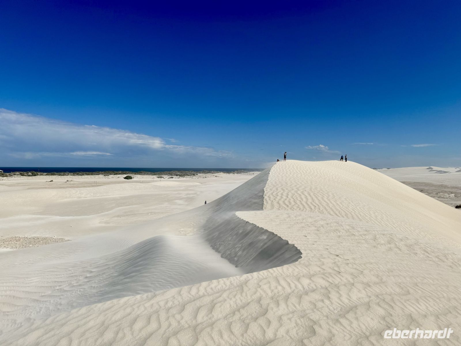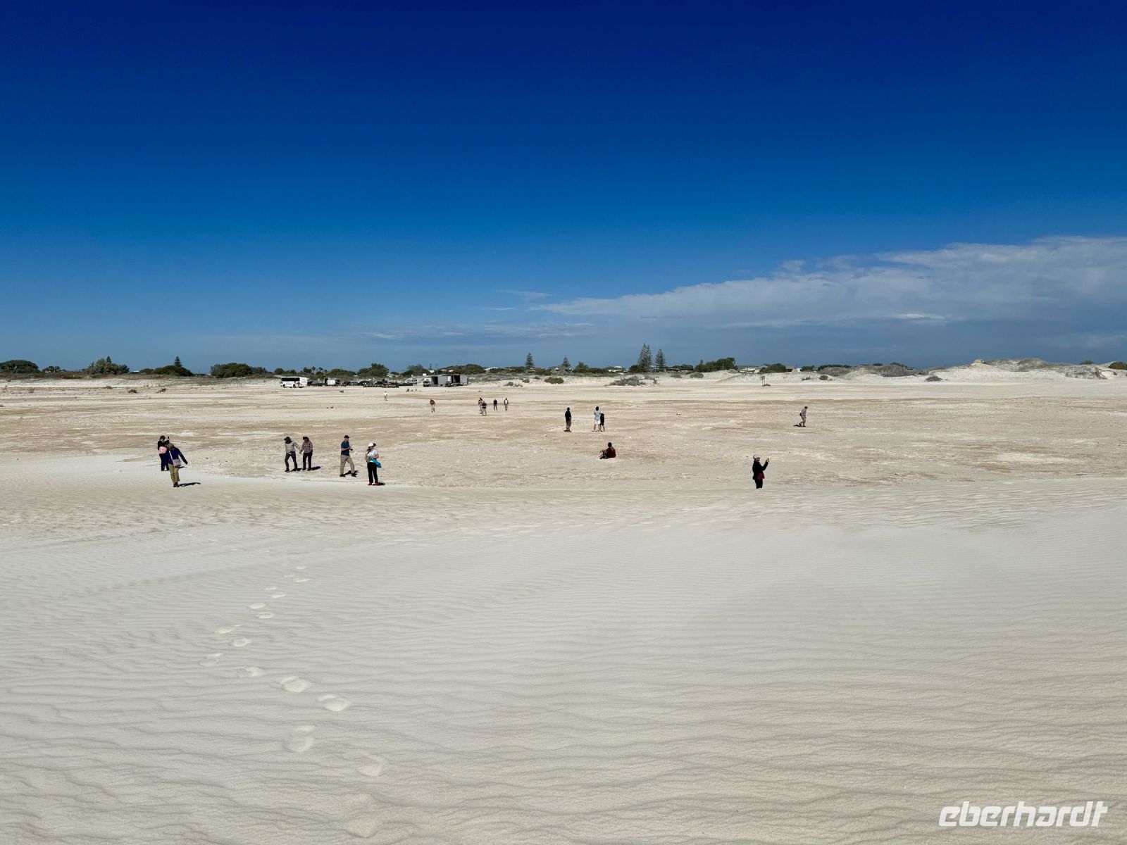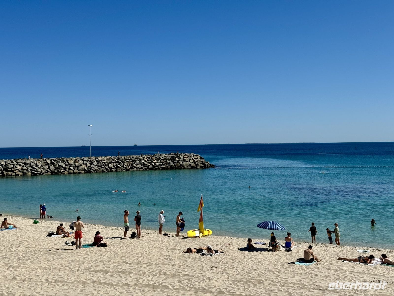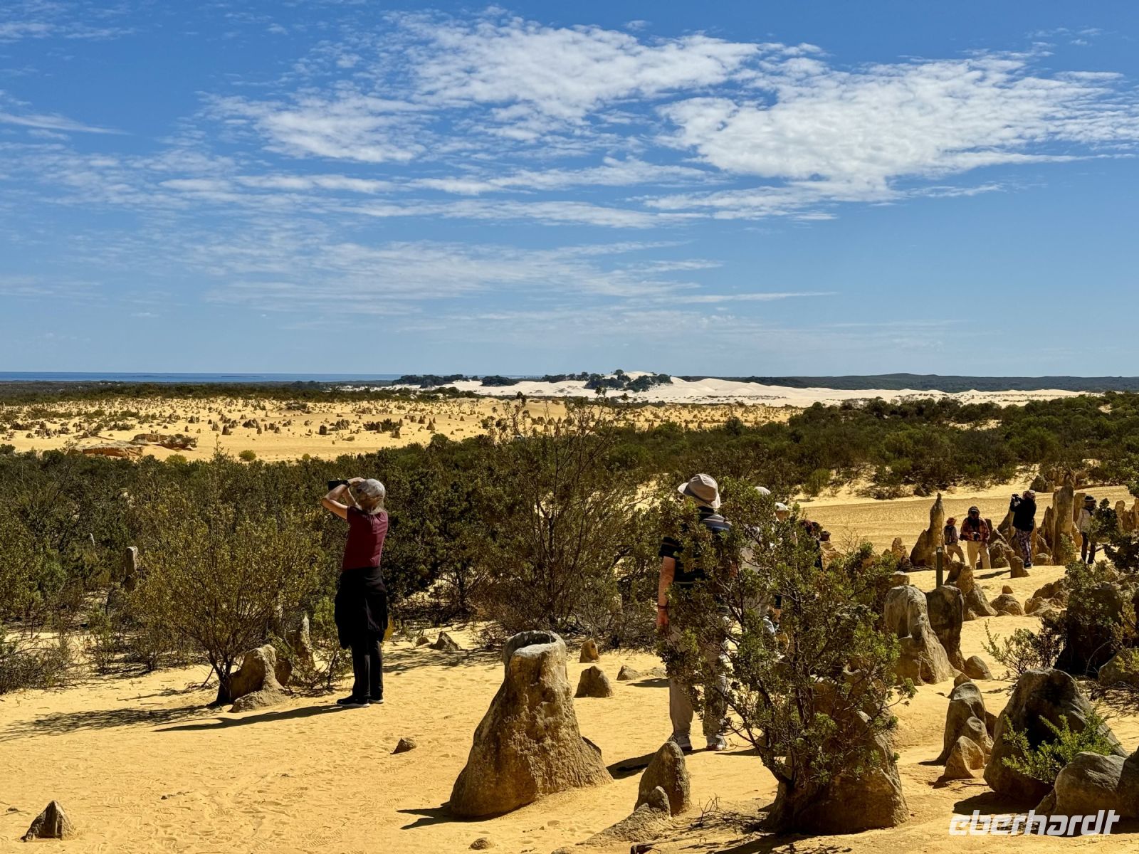 Mit unserem Busfahrer Peter, der uns auch gestern schon durch Perth gefahren hat, brechen wir heute in Richtung Norden auf, um auch ein bisschen die Natur von Westaustralien kennenzulernen. Höhepunkt sollen die Pinnacles im Nambung-Nationalpark sein, doch bis dahin fahren wir ein paar Stunden auf dem Highway durch die Vororte von Perth und später durch flaches buschiges Weideland. In Lancelin machen wir eine erste technische Pause und nutzen die Gelegenheit für einen Fotostopp am Strand. Das Wasser glitzert in verschiedenen Blautönen und der Sand hat eine helle weiße Färbung. Aus jenem herrlichen Sand bestehen auch die Dünen ein kleines Stück weiter nördlich, die wir nun besuchen. Wir stapfen gegen den kräftigen Wind einige Meter hinauf auf eine der Dünen, um eine bessere Aussicht zu haben. Der Wind peitscht gegen die wellenförmigen Hügel und lässt eine schnelle Abfolge von sich bewegenden Mustern und Linien entstehen, als ob Schlangen blitzschnell durch den Sand gleiten würden. Wir kommen uns ein bisschen vor wie auf einem anderen Planeten. Dieser Eindruck setzt sich im Nambung-Nationalpark beim Spaziergang durch die Pinnacles fort: Säulen aus Kalkstein, die aus der diesmal gelben Sandwüste ragen. Hitze und Fliegen machen uns auf dem Rundweg etwas zu schaffen, doch meine Gäste sind vorbildlich mit Wasser, Sonnenschutz und Fliegennetzen ausgestattet. Das Mittagessen in Cervantes haben wir uns danach alle verdient, auch Peter, der einen großartigen Job macht. Er schlägt uns nach der Pause einen kurzen Abstecher zur Hangover Bay vor, wo wir noch einmal ein paar Minuten am Strand verbringen. Hier ist es angenehm, hier könnten wir gern noch eine Weile bleiben, von mir aus auch bis zum Sonnenuntergang. Dann würden wir allerdings die Kängurus und Koalas im Yanchep-Nationalpark verpassen! Denn das ist nun wiederum meine Überraschung auf der Rückfahrt. Die Koalas hängen leider diesmal ziemlich weit oben in den Bäumen und drehen uns schlafend den Rücken zu. An die Kängurus kommen wir hingegen ganz nah heran, ja stolpern fast noch über sie, denn sie lassen sich von uns beim Grasen und Dösen nicht stören. Manchmal schauen sie neugierig auf und fragen sich vielleicht, woher nun wieder diese Touristen stammen mögen. Einen Kookaburra – auf Deutsch: Lachender Hans – sehen wir ebenfalls, was uns sehr erfreut. Nach so vielen tollen Eindrücken und Tierbegegnungen können wir uns im Parkhotel erstmal ein Bierchen gönnen, bevor wir die endgültige Rückfahrt zum Hotel in Perth antreten müssen. Dort erwartet uns eine kurze Nacht, denn morgen fliegen wir schon weiter nach Melbourne.