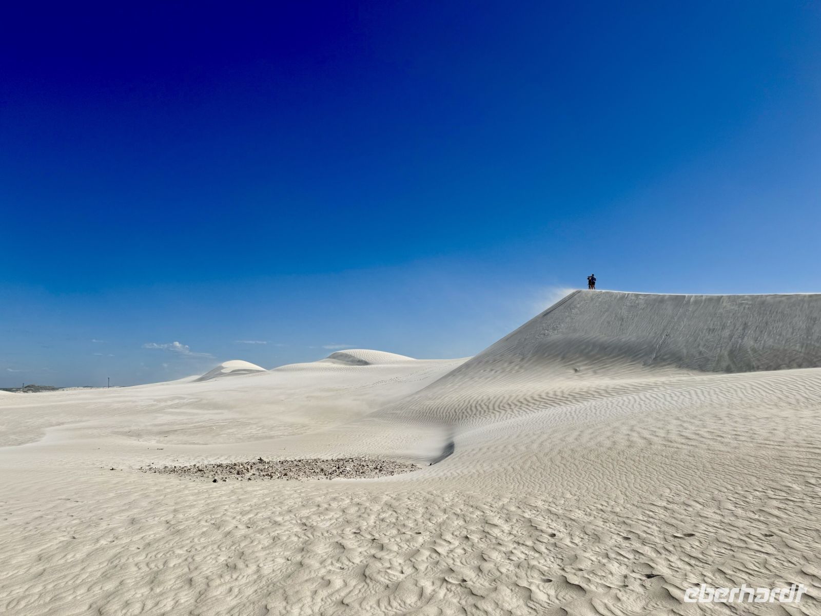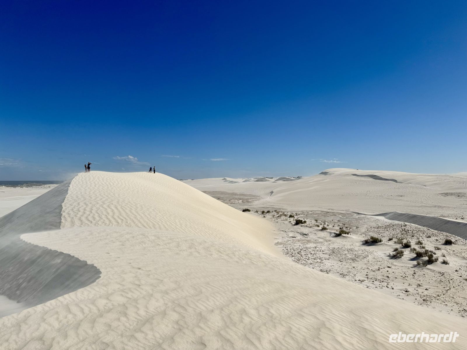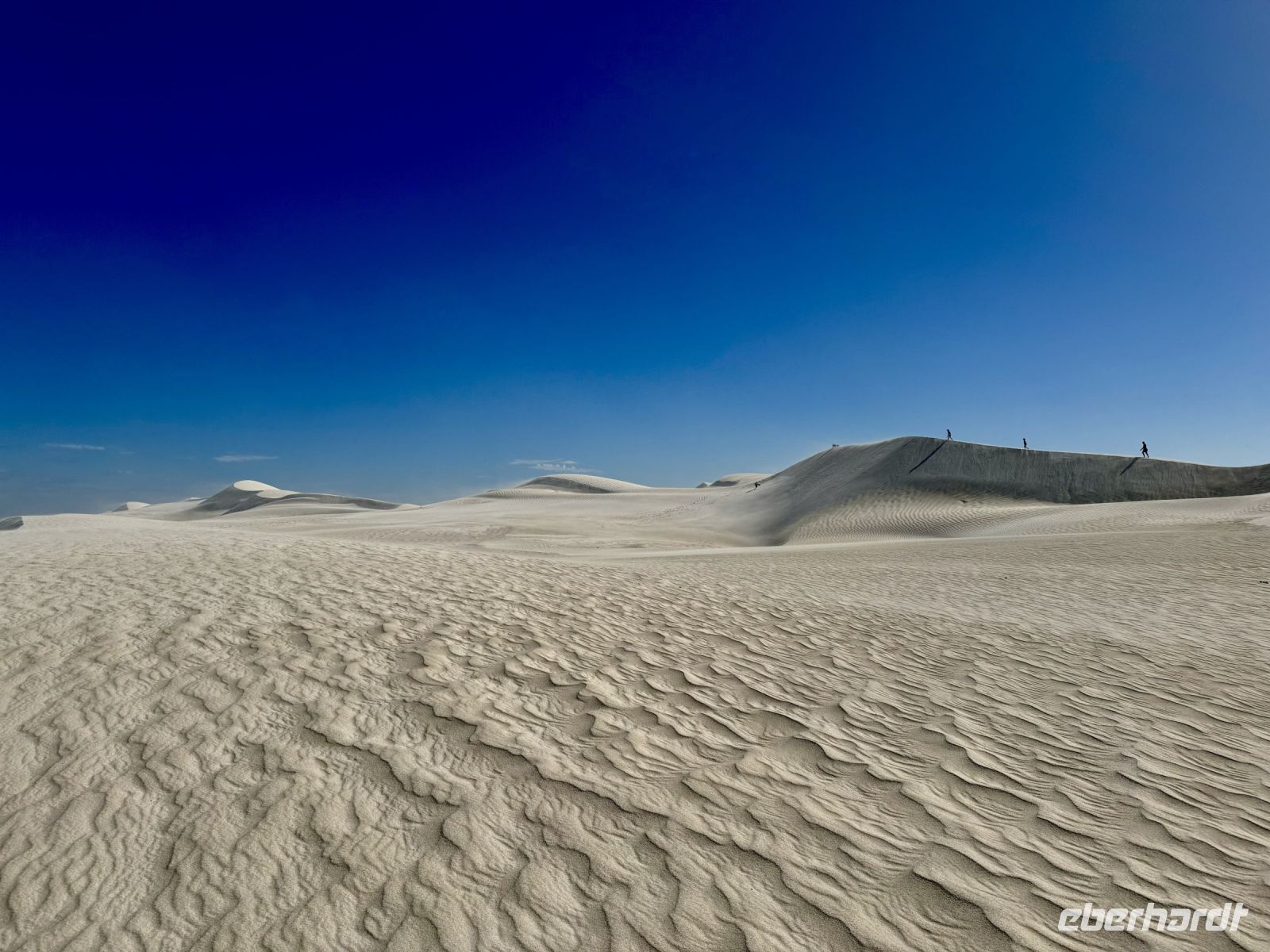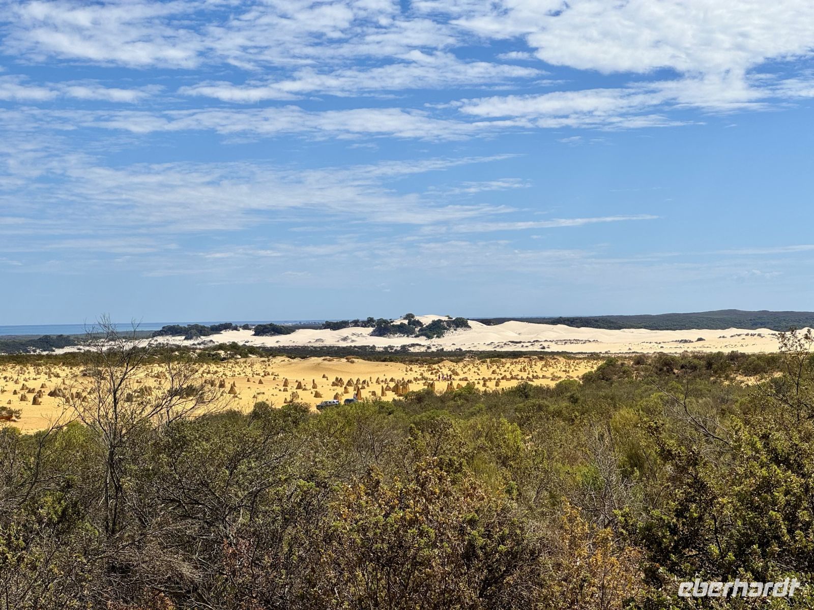 Mit unserem Busfahrer Peter, der uns auch gestern schon durch Perth gefahren hat, brechen wir heute in Richtung Norden auf, um auch ein bisschen die Natur von Westaustralien kennenzulernen. Höhepunkt sollen die Pinnacles im Nambung-Nationalpark sein, doch bis dahin fahren wir ein paar Stunden auf dem Highway durch die Vororte von Perth und später durch flaches buschiges Weideland. In Lancelin machen wir eine erste technische Pause und nutzen die Gelegenheit für einen Fotostopp am Strand. Das Wasser glitzert in verschiedenen Blautönen und der Sand hat eine helle weiße Färbung. Aus jenem herrlichen Sand bestehen auch die Dünen ein kleines Stück weiter nördlich, die wir nun besuchen. Wir stapfen gegen den kräftigen Wind einige Meter hinauf auf eine der Dünen, um eine bessere Aussicht zu haben. Der Wind peitscht gegen die wellenförmigen Hügel und lässt eine schnelle Abfolge von sich bewegenden Mustern und Linien entstehen, als ob Schlangen blitzschnell durch den Sand gleiten würden. Wir kommen uns ein bisschen vor wie auf einem anderen Planeten. Dieser Eindruck setzt sich im Nambung-Nationalpark beim Spaziergang durch die Pinnacles fort: Säulen aus Kalkstein, die aus der diesmal gelben Sandwüste ragen. Hitze und Fliegen machen uns auf dem Rundweg etwas zu schaffen, doch meine Gäste sind vorbildlich mit Wasser, Sonnenschutz und Fliegennetzen ausgestattet. Das Mittagessen in Cervantes haben wir uns danach alle verdient, auch Peter, der einen großartigen Job macht. Er schlägt uns nach der Pause einen kurzen Abstecher zur Hangover Bay vor, wo wir noch einmal ein paar Minuten am Strand verbringen. Hier ist es angenehm, hier könnten wir gern noch eine Weile bleiben, von mir aus auch bis zum Sonnenuntergang. Dann würden wir allerdings die Kängurus und Koalas im Yanchep-Nationalpark verpassen! Denn das ist nun wiederum meine Überraschung auf der Rückfahrt. Die Koalas hängen leider diesmal ziemlich weit oben in den Bäumen und drehen uns schlafend den Rücken zu. An die Kängurus kommen wir hingegen ganz nah heran, ja stolpern fast noch über sie, denn sie lassen sich von uns beim Grasen und Dösen nicht stören. Manchmal schauen sie neugierig auf und fragen sich vielleicht, woher nun wieder diese Touristen stammen mögen. Einen Kookaburra – auf Deutsch: Lachender Hans – sehen wir ebenfalls, was uns sehr erfreut. Nach so vielen tollen Eindrücken und Tierbegegnungen können wir uns im Parkhotel erstmal ein Bierchen gönnen, bevor wir die endgültige Rückfahrt zum Hotel in Perth antreten müssen. Dort erwartet uns eine kurze Nacht, denn morgen fliegen wir schon weiter nach Melbourne.