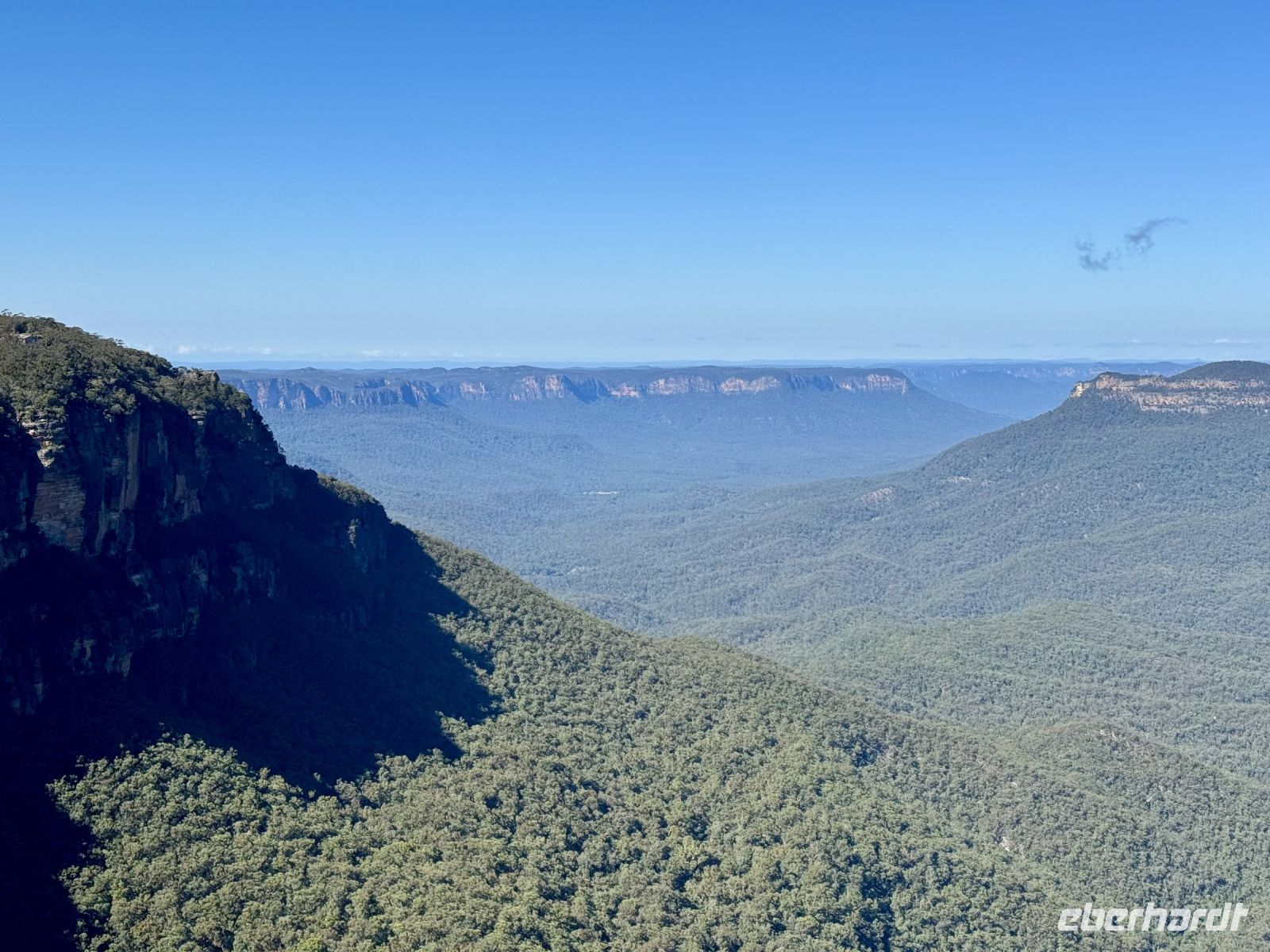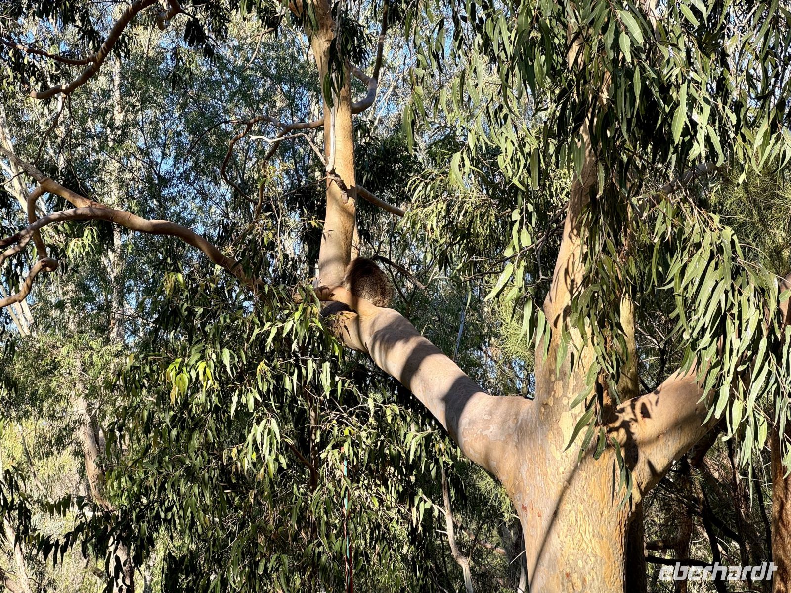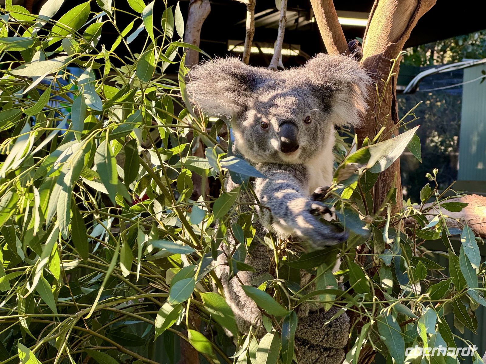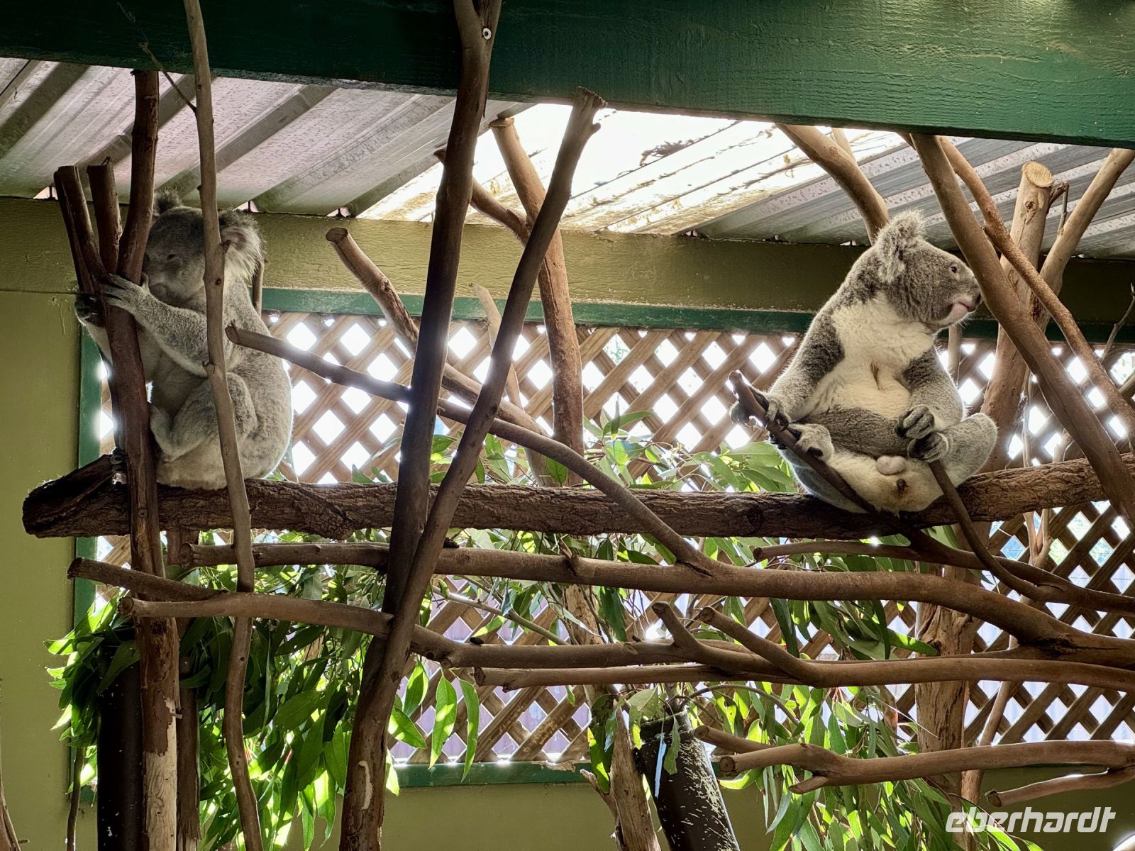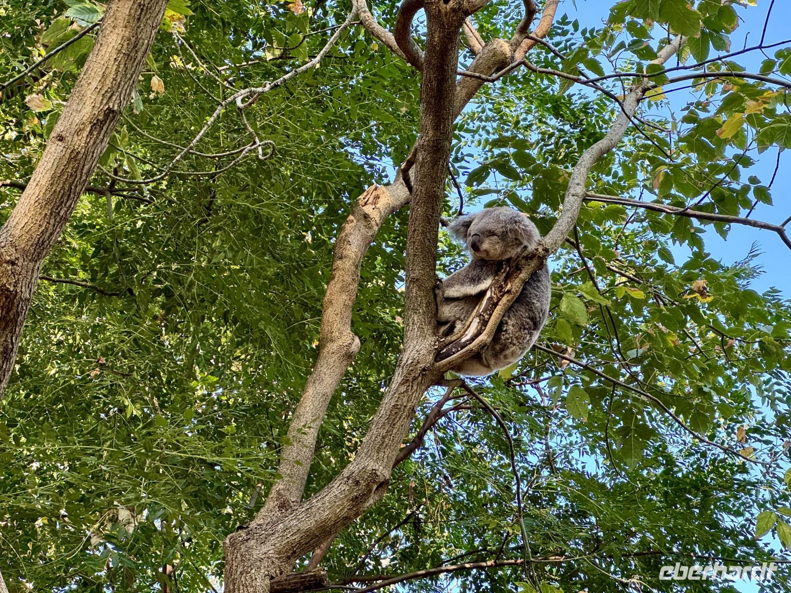 Mit unserem Tagesausflug in die Blue Mountains entfliehen wir ein letztes Mal dem Trubel der Großstadt in die Natur, in einen der vielen, vielen australischen Nationalparks. Schon die Fahrt hinaus aus der Innenstadt über die Harbour Bridge ist ein Ereignis! Bald danach kommen wir auch an den olympischen Sportstätten vorbei, die tatsächlich ein gutes Stück außerhalb des Stadtzentrums liegen. Gestern war ja ANZAC Day in Australien, weshalb uns Uli mit einer großen Packung ANZAC Biscuits die Fahrt in die „Blauen Berge“ versüßt. Nach einem kurzen Stopp in Glenbrook erreichen wir das Örtchen Leura, die „Perle der Blue Mountains“, wie es Uli so schön poetisch ausdrückt. Hier wartet der erste kurze Spaziergang auf uns, der uns zum Elysian Rock Lookout führt. Vor uns öffnet sich ein riesiges Tal, bedeckt vom blauen Dunst der Eukalyptusbäume, in dessen Mitte sich mehrere Kilometer von uns entfernt der Mount Solitary erhebt. Eine Wahnsinnsaussicht. Auch das Wetter spielt wieder mit. Die berühmten Felsen der Three Sisters sehen wir von hier aus bereits von hinten, kommen ihnen aber dann beim zweiten Spaziergang, nun schon in Katoomba, ganz nahe. Das reichhaltige Mittagessen im Restaurant „The Lookout“ stellt gleichzeitig unser gemeinsames Abschiedsessen dar, weshalb ich im Namen von Eberhardt TRAVEL drei Flaschen Sekt für meine Gäste spendiere, um auf die gelungene Reise anzustoßen. Was ich noch nie in meinem Reiseleiterleben erlebt habe, ist ein „Indian Summer” in Australien. In Katoomba und Leura hat der Herbst in Australien schon Einzug gehalten und die angepflanzten (nicht-einheimischen) Bäume erstrahlen in den schönsten Gold- und Rottönen – für mich ein kleiner Vorgeschmack auf meine jährliche Kanadareise im Oktober zum echten „Indian Summer“. Nach dem Mittagsschmaus kehren wir für einen Bummel entlang der Hauptstraße mit ihren vielen kleinen Geschäften nach Leura zurück, bevor wir uns auf den Weg zurück nach Sydney machen. Allerdings steht noch ein Besuch im Featherdale Wildlife Park an. Er stellt für uns die letzte Möglichkeit auf dieser Reise dar, die australische Tierwelt zu bestaunen. Zwar hatten wir schon Begegnungen mit Koalas und Kängurus, doch Wombats, Quokkas und Dingos haben wir noch gar nicht bzw. nicht aus dieser Nähe sehen können. Die meiste Zeit verbringen wir jedoch bei den putzigen Koalas, die mal nicht alle schlafen, sondern sich tatsächlich bewegen und/oder gerade fressen. Wir sehen sogar ein Jungtier mit seiner Mutter und ich nutze die Gelegenheit für mein erstes eigenes Koala-Foto mit der süßen kleinen Calliope. Ein schönes Erlebnis, das uns strahlend nach Hause trägt. Am Hotel in Sydney endet Ulis Einsatz auf dieser Reise. Wir danken ihr sehr und ich freue mich schon auf die nächste Begegnung mit ihr. Vorfreude ist ein gutes Stichwort: Mit ca. der Hälfte der Gruppe besuche ich am Abend tatsächlich ein Konzert im weltberühmten Opernhaus – Sibelius, klassische Musik! Wie schön, dass sich diese Möglichkeit für uns geboten hat, vielleicht einmal im Leben ein Konzert in diesem schönen Saal, an diesem speziellen Ort zu erleben. Ein richtiges Highlight zum Abschluss dieser großartigen Reise!