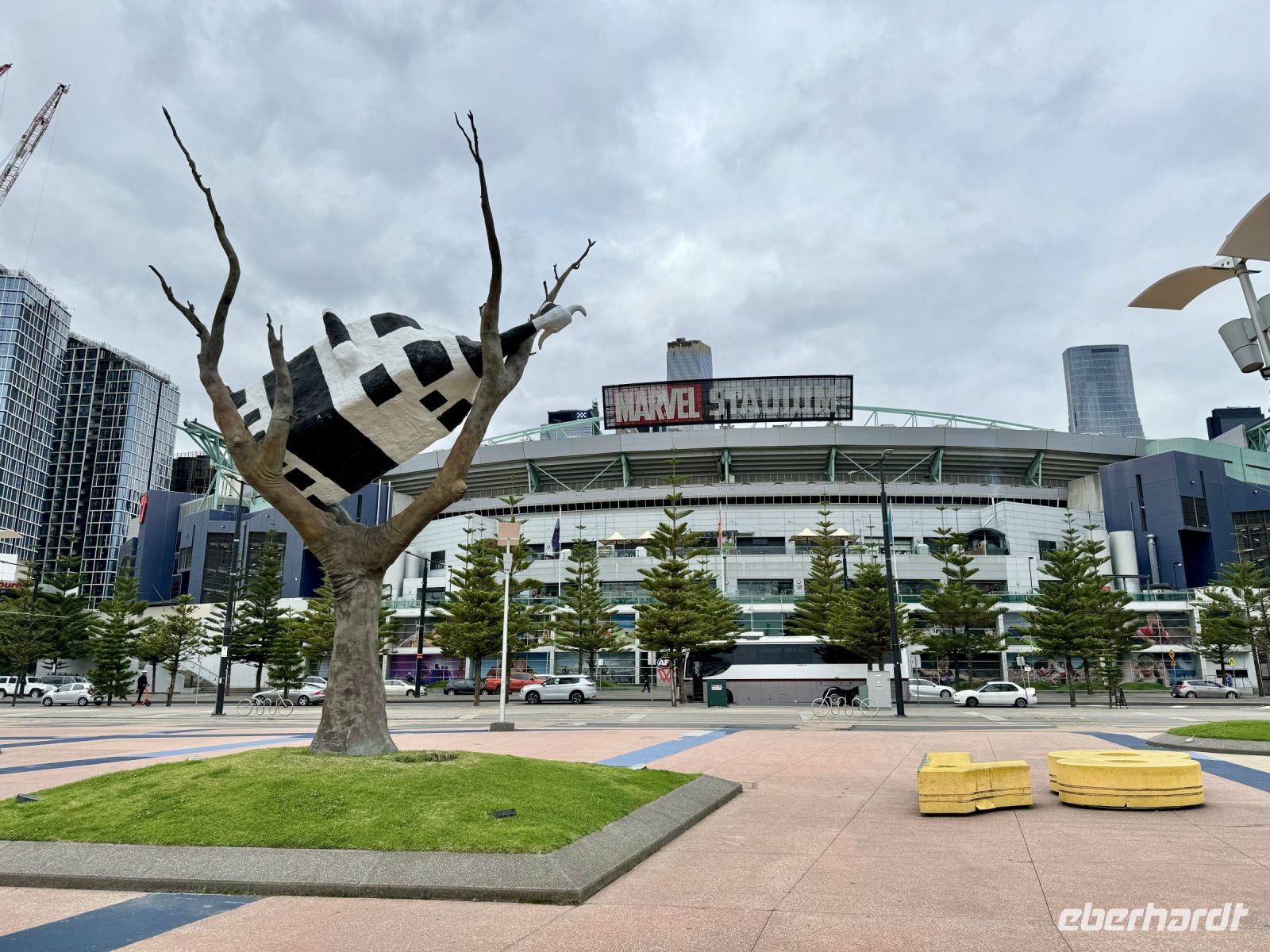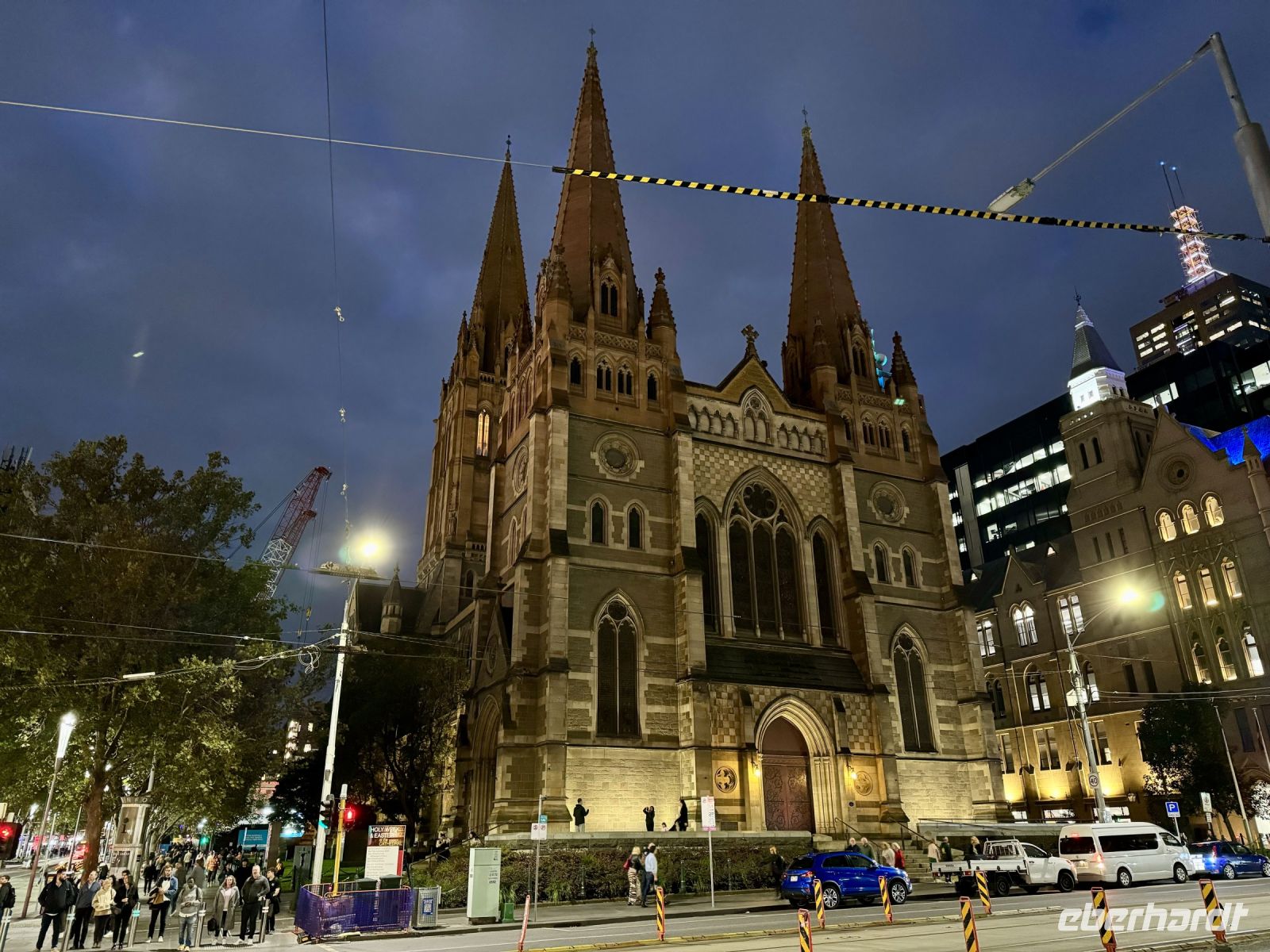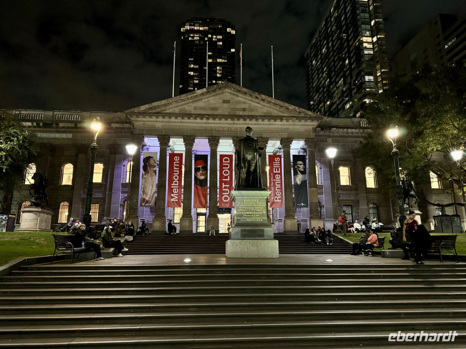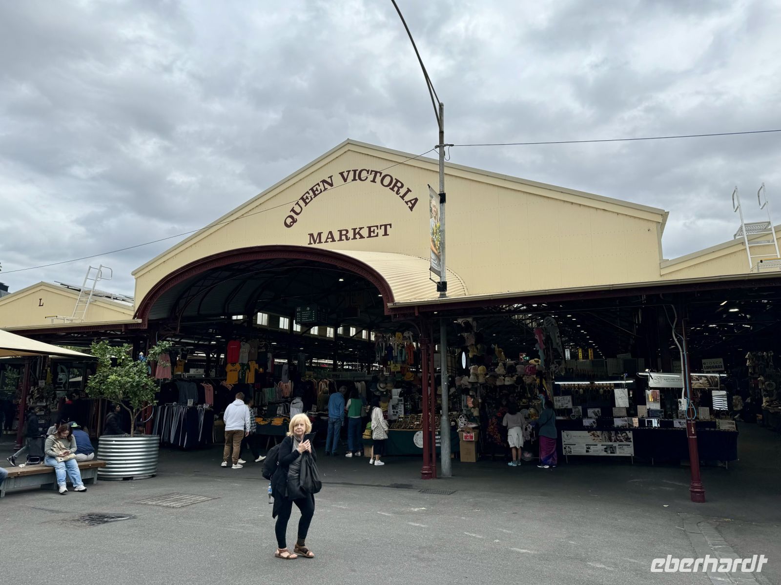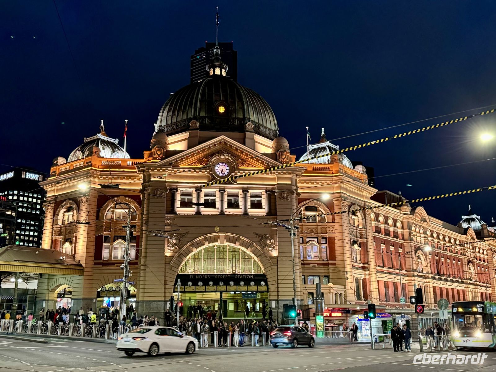 Der flächenmäßig kleinste Bundesstaat auf dem Festland, Victoria, ist unser nächstes Ziel in Australien. Dazu müssen wir fast einmal quer über den Kontinent fliegen – über die Wüste, über die Große Australische Bucht und über Adelaide. Wir nutzen die Flugzeit auch zum Schlafen und landen einigermaßen ausgeruht in Melbourne. Hat vor und während des Flugs noch alles geklappt, müssen wir nach der Landung ganz schön lange auf unsere Koffer warten. So bleibt uns nur noch eine halbe Stunde, bevor die Stände auf dem Queen Victoria Market schließen. Die historischen Markthallen steuern wir nämlich auf der Stadtrundfahrt als unser erstes Ziel an. An den Docklands mit dem Marvel Stadium für Australian Football („Footie“) machen wir den nächsten Stopp, bevor wir quer durch die Innenstadt zum Royal Exhibition Building weiterfahren. Die vielen Baustellen und der dichte Feierabendverkehr setzen uns zeitlich ganz schön unter Druck, sodass wir am Parlament, an der St Patrick’s Cathedral, an den Fitzroy Gardens mit dem Captain Cooks Cottage und dem Sportkomplex (Melbourne Cricket Grounds und Australien-Open-Gelände) nur noch vorbei- bzw. durchfahren können. Denn unser Fahrer Dave muss uns gegen 17 Uhr am Hotel im Stadtteil Southbank absetzen, wo wir erstmal unsere Zimmer beziehen. Unsere Erkundungstour durch Melbourne setzen wir nach einer kleinen Pause zu Fuß fort. Unser Hotel liegt dafür sehr günstig. Eine Brücke über den Yarra River bringt uns direkt zum Federation Square, zur St Paul’s Cathedral und zum ikonischen Bahnhof Flinders Street Station, der fast schon symbolisch als Wahrzeichen für Melbourne und Victoria steht. Es ist Freitagabend, die ganze Stadt scheint auf den Beinen zu sein, viele junge Leute, Studenten vermutlich. Wir lassen uns treiben, biegen hier und dort von der Hauptstraße ab, z. B. um uns die Graffiti-Kunst in der Hosier Lane anzuschauen oder die Royal Arcade zu fotografieren, landen am Ende jedoch immer wieder auf der Swanston Street und schließlich vor der State Library of Victoria. Hier trennen sich für eine gute Stunde unsere Wege, dann treffen wir uns zum HP-Abendessen unten am Yarra River wieder. Bevor wir uns allerdings unserem leckeren Steak oder Riesenbratspieß widmen, entführe ich meine Gäste noch zu einem Abstecher ins Crown Hotel und zum größten Casino der Südhalbkugel. Dort wird unsere Ankunft sogar mit mächtigen Feuerbällen gefeiert, die in den Nachthimmel über Melbourne aufsteigen.
