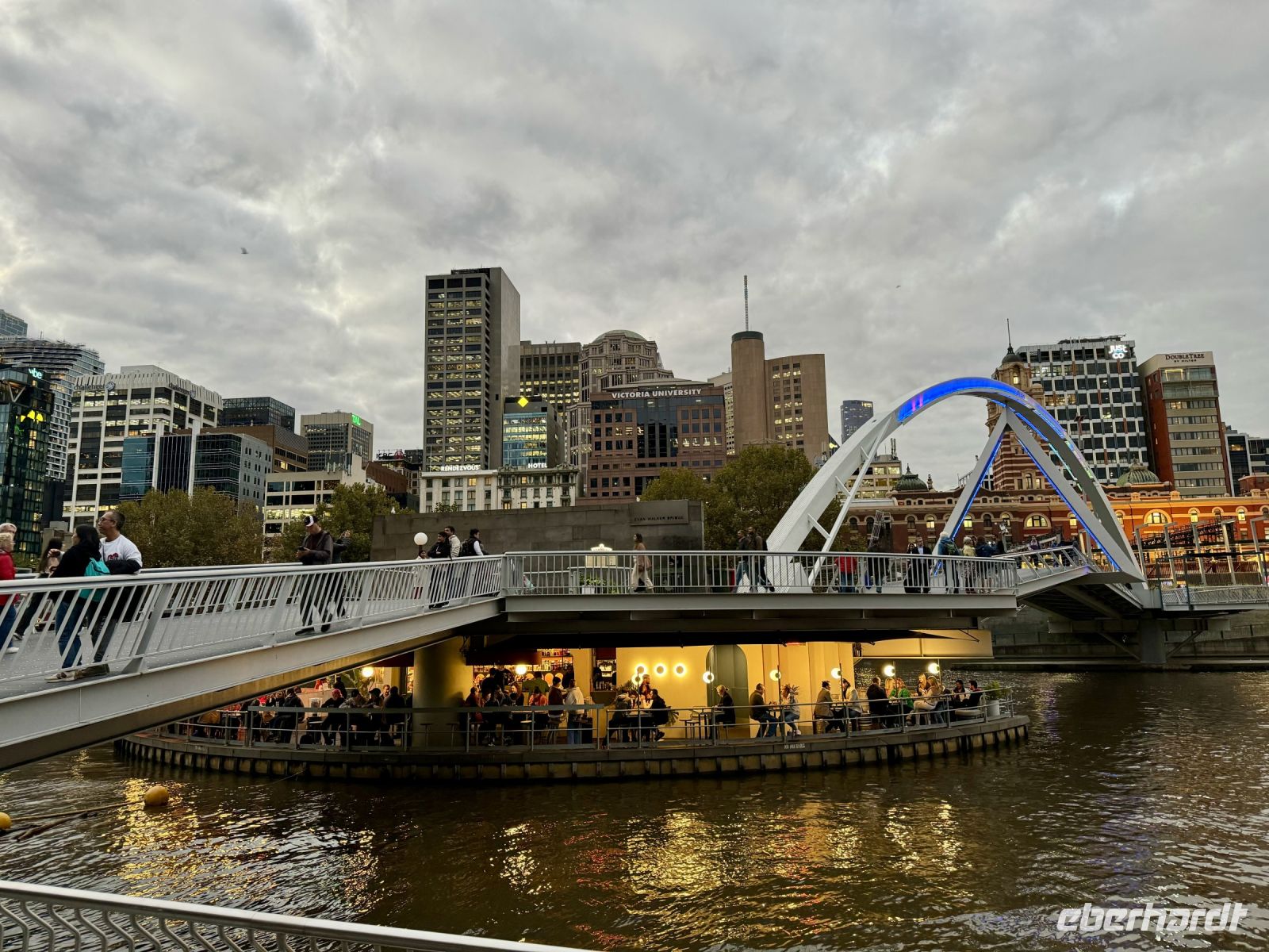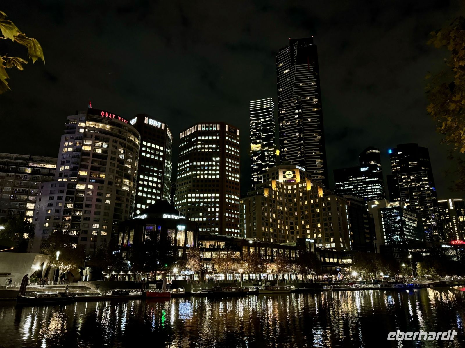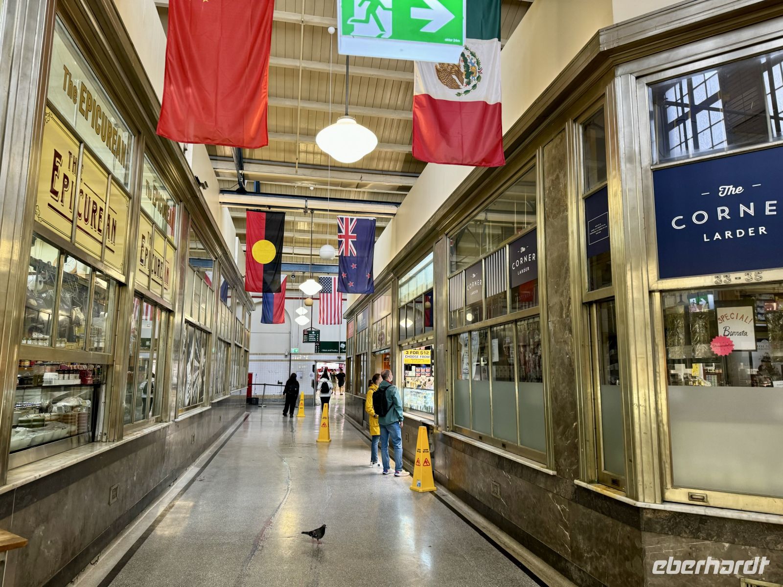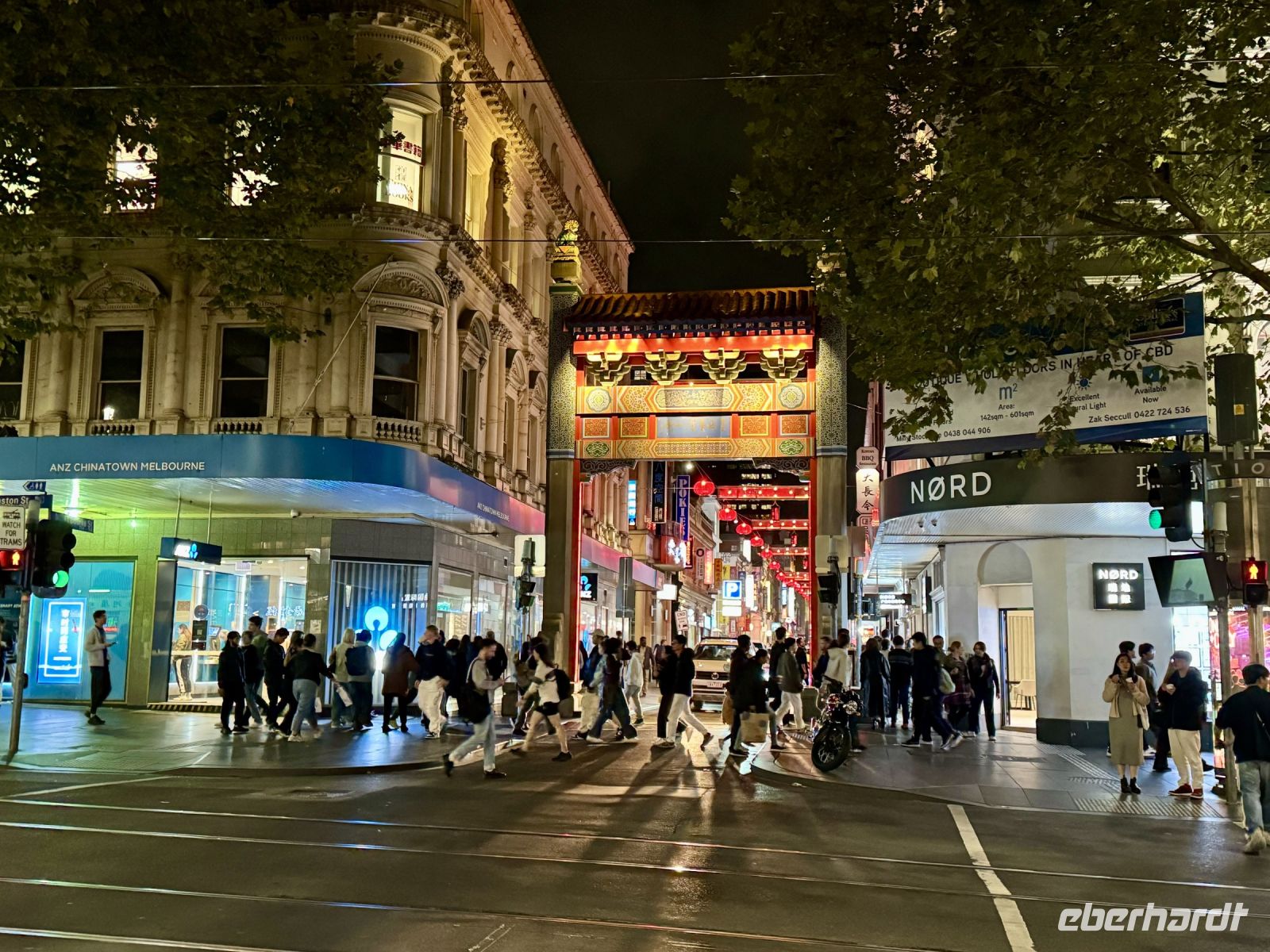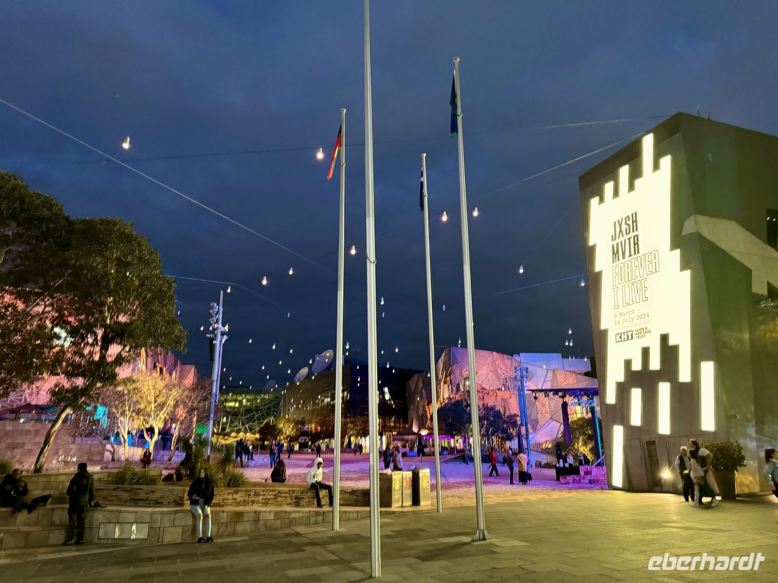 Der flächenmäßig kleinste Bundesstaat auf dem Festland, Victoria, ist unser nächstes Ziel in Australien. Dazu müssen wir fast einmal quer über den Kontinent fliegen – über die Wüste, über die Große Australische Bucht und über Adelaide. Wir nutzen die Flugzeit auch zum Schlafen und landen einigermaßen ausgeruht in Melbourne. Hat vor und während des Flugs noch alles geklappt, müssen wir nach der Landung ganz schön lange auf unsere Koffer warten. So bleibt uns nur noch eine halbe Stunde, bevor die Stände auf dem Queen Victoria Market schließen. Die historischen Markthallen steuern wir nämlich auf der Stadtrundfahrt als unser erstes Ziel an. An den Docklands mit dem Marvel Stadium für Australian Football („Footie“) machen wir den nächsten Stopp, bevor wir quer durch die Innenstadt zum Royal Exhibition Building weiterfahren. Die vielen Baustellen und der dichte Feierabendverkehr setzen uns zeitlich ganz schön unter Druck, sodass wir am Parlament, an der St Patrick’s Cathedral, an den Fitzroy Gardens mit dem Captain Cooks Cottage und dem Sportkomplex (Melbourne Cricket Grounds und Australien-Open-Gelände) nur noch vorbei- bzw. durchfahren können. Denn unser Fahrer Dave muss uns gegen 17 Uhr am Hotel im Stadtteil Southbank absetzen, wo wir erstmal unsere Zimmer beziehen. Unsere Erkundungstour durch Melbourne setzen wir nach einer kleinen Pause zu Fuß fort. Unser Hotel liegt dafür sehr günstig. Eine Brücke über den Yarra River bringt uns direkt zum Federation Square, zur St Paul’s Cathedral und zum ikonischen Bahnhof Flinders Street Station, der fast schon symbolisch als Wahrzeichen für Melbourne und Victoria steht. Es ist Freitagabend, die ganze Stadt scheint auf den Beinen zu sein, viele junge Leute, Studenten vermutlich. Wir lassen uns treiben, biegen hier und dort von der Hauptstraße ab, z. B. um uns die Graffiti-Kunst in der Hosier Lane anzuschauen oder die Royal Arcade zu fotografieren, landen am Ende jedoch immer wieder auf der Swanston Street und schließlich vor der State Library of Victoria. Hier trennen sich für eine gute Stunde unsere Wege, dann treffen wir uns zum HP-Abendessen unten am Yarra River wieder. Bevor wir uns allerdings unserem leckeren Steak oder Riesenbratspieß widmen, entführe ich meine Gäste noch zu einem Abstecher ins Crown Hotel und zum größten Casino der Südhalbkugel. Dort wird unsere Ankunft sogar mit mächtigen Feuerbällen gefeiert, die in den Nachthimmel über Melbourne aufsteigen.