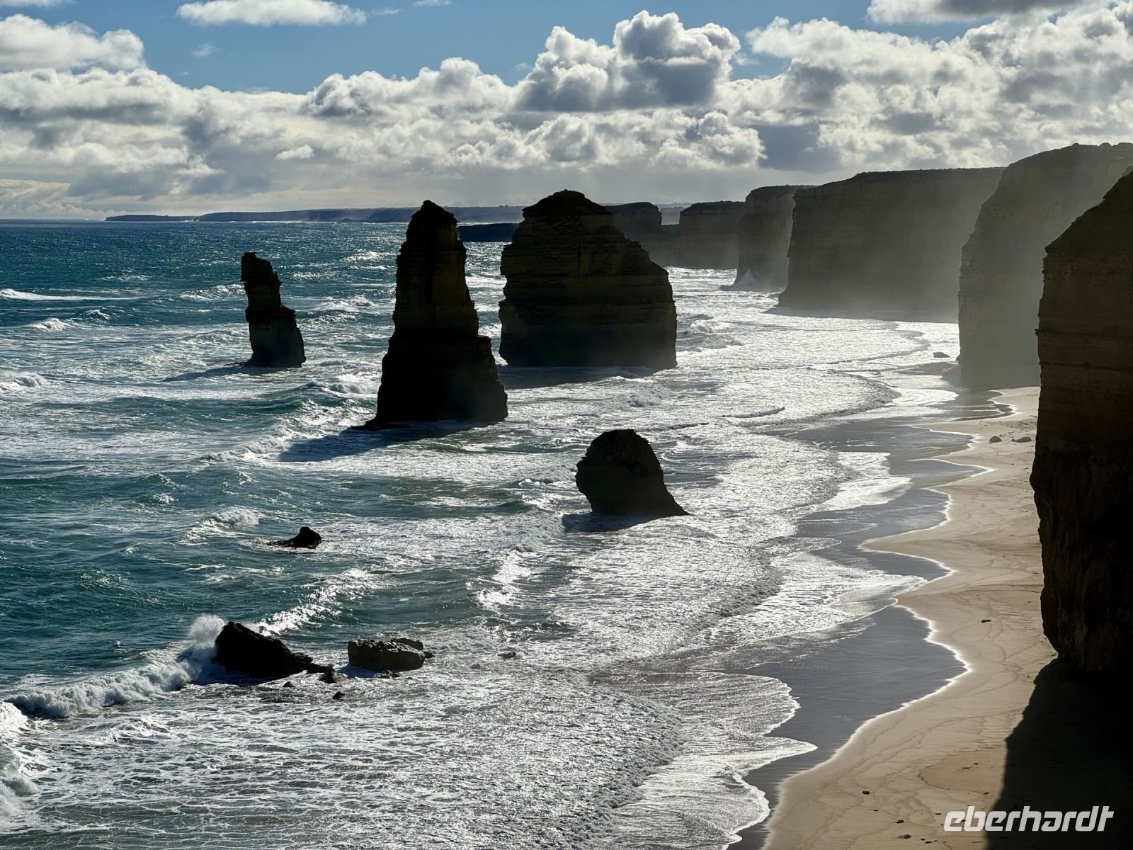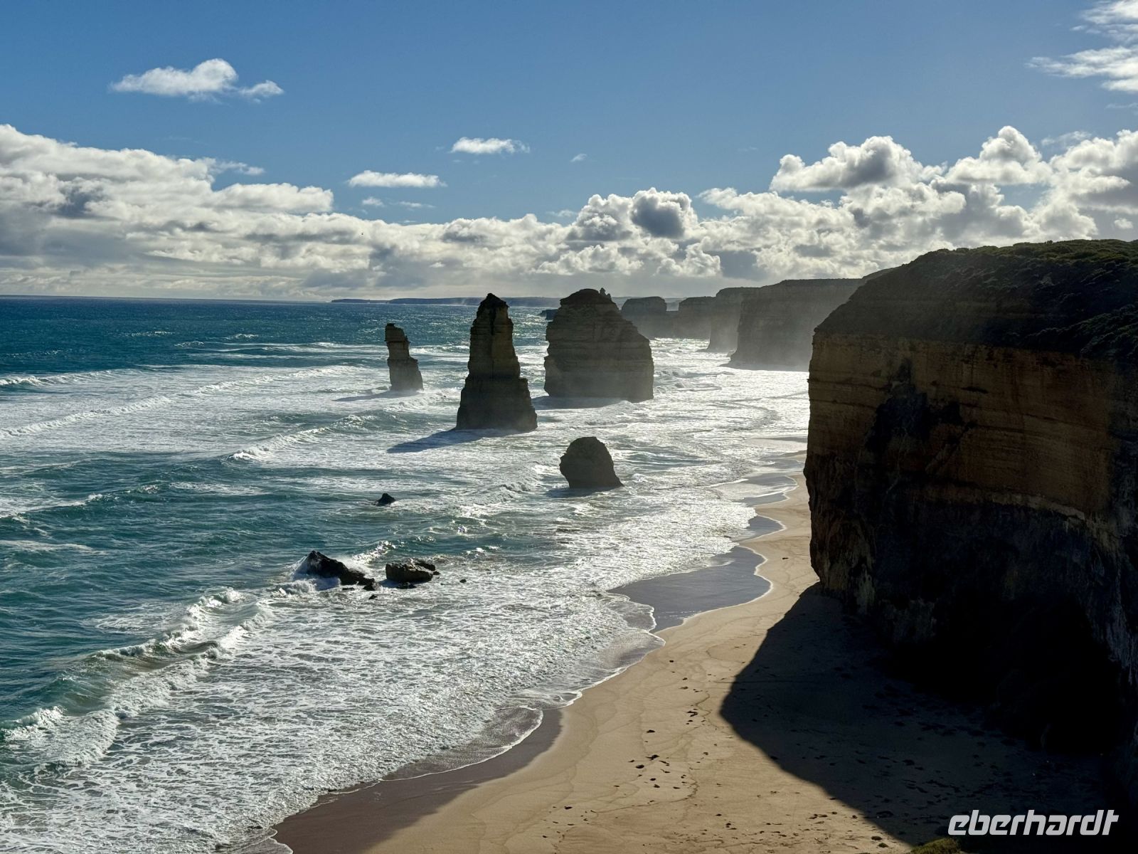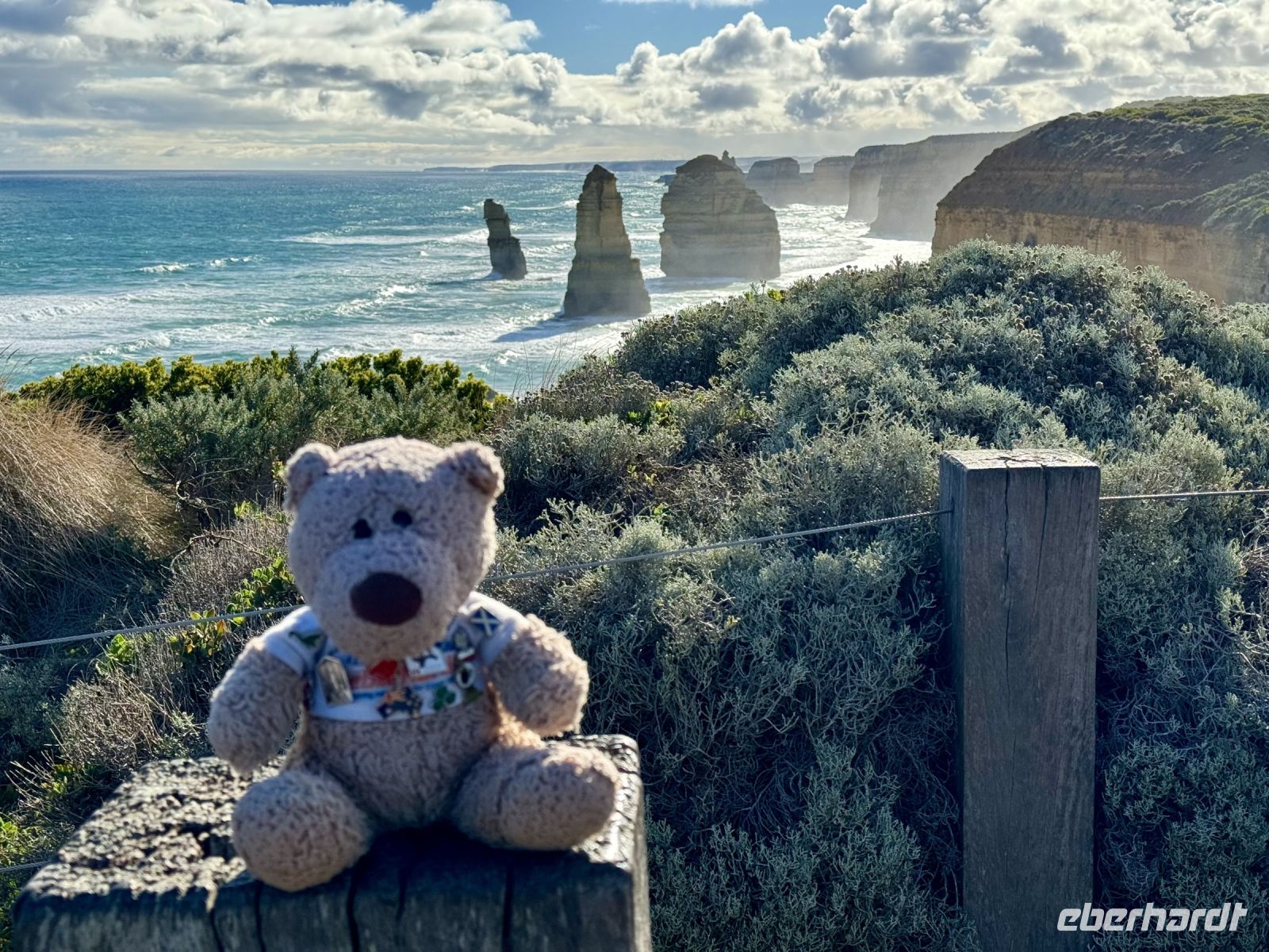 Great Ocean Road! Allein der Name der berühmtesten Panoramastraße Australiens lässt Bilder von traumhaften Stränden und steilen Klippen und Felsen vor dem geistigen Auge entstehen. Kann es wirklich so schön sein? Auf einem zwölfstündigen Tagesausflug wollen wir es mit unserem heutigen Fahrer Ivan herausfinden. Wir starten früh um 8 Uhr, sind schnell auf dem Highway und aus der Stadt heraus. Die Great Ocean Road beginnt offiziell in Torquay, und das ist zwei Fahrstunden entfernt, noch hinter Geelong, der zweitgrößten Stadt Victorias. Schlagartig werden uns die riesigen Entfernungen in Australien wieder bewusst. Der erste Halt ist eine Überraschung und hat mit der Great Ocean Road erstmal (außer dem Namen nach) nichts zu tun: eine Schokoladenfabrik! Wenn schon ein Toilettenstopp, dann bitte so: mit leckerem Eis, leckerer Hot Chocolate, und Kaffee gibt es auch. Gestärkt ziehen wir weiter und treffen hinter dem Ferienort Anglesea dann erstmals auf den Ozean, genauer: die Bass Strait zwischen Australien und Tasmanien. Bei einem Fotostopp an einem Aussichtspunkt blicken wir auf den ersten schönen Strand entlang der Küste und saugen die frische Meeresluft gierig in uns auf. Auch am Memorial Arch, der an die Veteranen des Ersten Weltkriegs erinnert, die einst die Küstenstraße erbauten, gibt es einen schönen Strand, an dem wir uns kurz aufhalten. Ein weiterer Zwischenstopp erfolgt in Lorne, wo wir ein paar Kakadus beobachten. Bis Apollo Bay folgen wir weitestgehend dem Verlauf der Küste und werden dort im Apollo Bay Hotel zum Mittagessen erwartet. Dann entfernt sich die Great Ocean Road vom Meer und führt durch die Regenwälder des Great-Otway-Nationalparks. Und tatsächlich setzt genau jetzt der Regen ein, was uns aber nicht abhält, aus dem Bus auszusteigen und nach wilden Koalas zu suchen, die unser Fahrer Ivan gestern hier gesehen hat. Dort hoch oben im Baum ist auch ein zusammengekauertes, schlafendes Fellknäuel zu sehen, leider zu weit weg für schöne Fotos. Aber er soll auch in Ruhe schlafen; Eukalyptus ist schließlich schwer verdauliche Kost. Ein bisschen hatte ich Angst, dass es auch noch bei den Twelve Apostles regnet. Doch meine Wetterengel scheinen das Glück gepachtet zu haben und können die nur noch acht (!) Säulen aus Kalkstein bei schönstem Sonnenschein bewundern. Auch Reisebär Max ist ganz begeistert und möchte sein persönliches Erinnerungsfoto. Obgleich die Twelve Apostles als absoluter Höhepunkt der Great Ocean Road vermarktet werden, finde ich persönlich die Klippen und engen Buchten an der Loch Ard Gorge ein Stück weiter die Küste hinauf ebenso schön, wenn nicht sogar abwechslungsreicher. Durch das Landesinnere fahren wir über Colac, Winchelsea und Geelong zurück nach Melbourne, das wir planmäßig kurz vor 20 Uhr, also bereits nach Sonnenuntergang, erreichen.