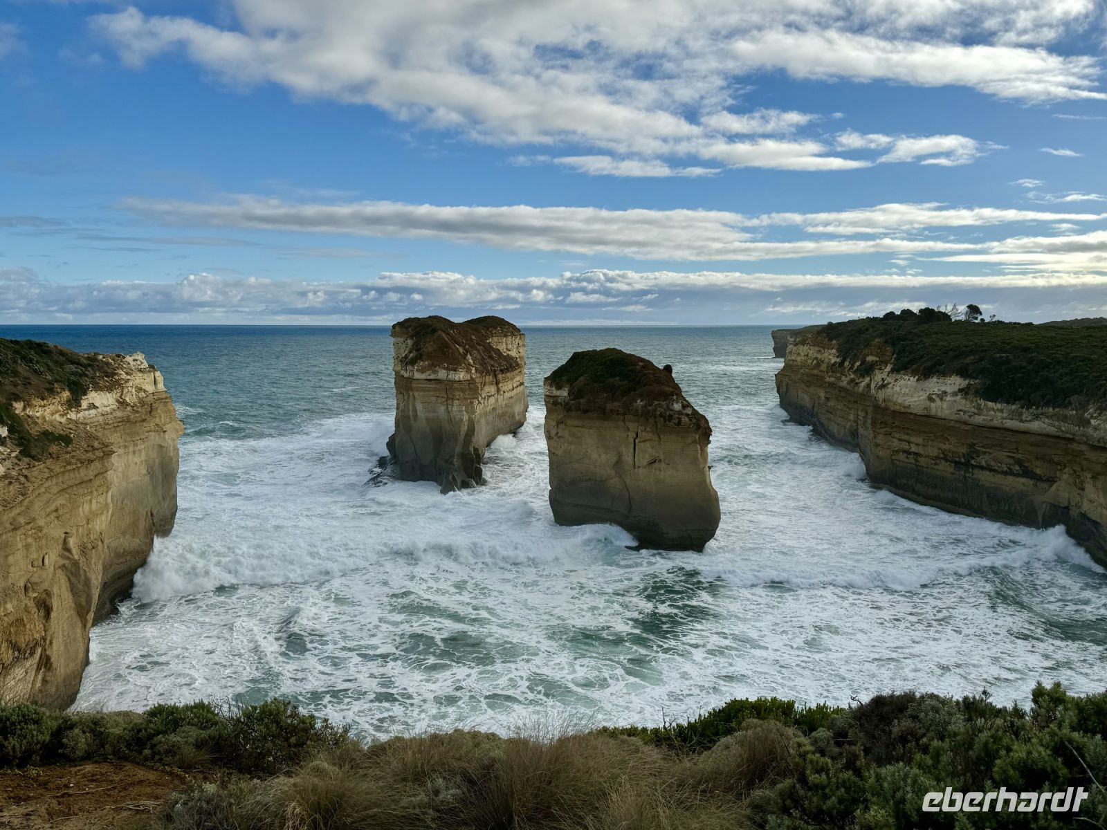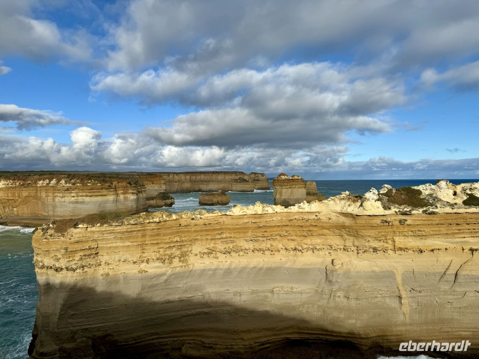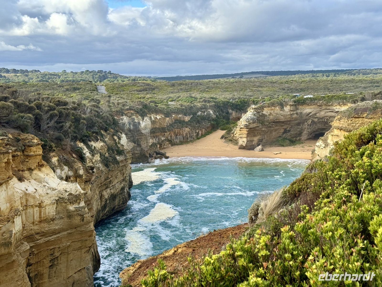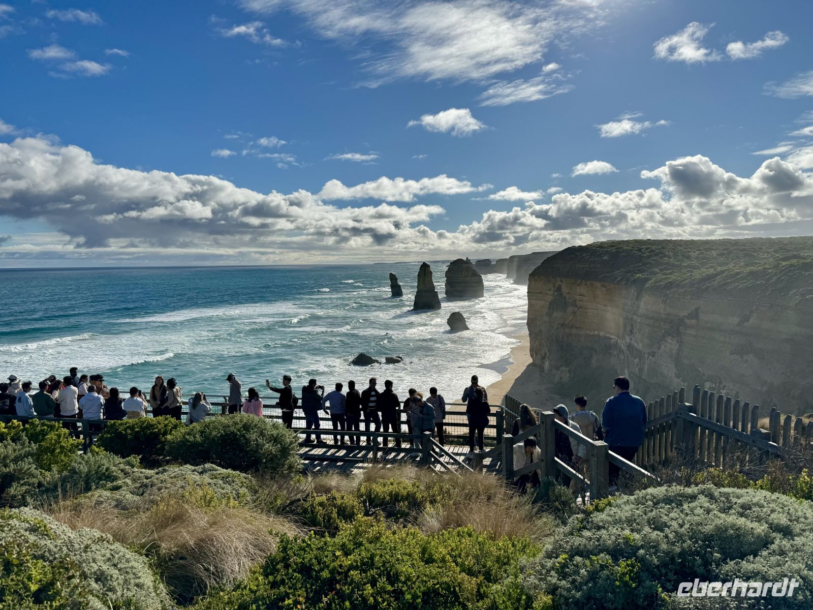 Great Ocean Road! Allein der Name der berühmtesten Panoramastraße Australiens lässt Bilder von traumhaften Stränden und steilen Klippen und Felsen vor dem geistigen Auge entstehen. Kann es wirklich so schön sein? Auf einem zwölfstündigen Tagesausflug wollen wir es mit unserem heutigen Fahrer Ivan herausfinden. Wir starten früh um 8 Uhr, sind schnell auf dem Highway und aus der Stadt heraus. Die Great Ocean Road beginnt offiziell in Torquay, und das ist zwei Fahrstunden entfernt, noch hinter Geelong, der zweitgrößten Stadt Victorias. Schlagartig werden uns die riesigen Entfernungen in Australien wieder bewusst. Der erste Halt ist eine Überraschung und hat mit der Great Ocean Road erstmal (außer dem Namen nach) nichts zu tun: eine Schokoladenfabrik! Wenn schon ein Toilettenstopp, dann bitte so: mit leckerem Eis, leckerer Hot Chocolate, und Kaffee gibt es auch. Gestärkt ziehen wir weiter und treffen hinter dem Ferienort Anglesea dann erstmals auf den Ozean, genauer: die Bass Strait zwischen Australien und Tasmanien. Bei einem Fotostopp an einem Aussichtspunkt blicken wir auf den ersten schönen Strand entlang der Küste und saugen die frische Meeresluft gierig in uns auf. Auch am Memorial Arch, der an die Veteranen des Ersten Weltkriegs erinnert, die einst die Küstenstraße erbauten, gibt es einen schönen Strand, an dem wir uns kurz aufhalten. Ein weiterer Zwischenstopp erfolgt in Lorne, wo wir ein paar Kakadus beobachten. Bis Apollo Bay folgen wir weitestgehend dem Verlauf der Küste und werden dort im Apollo Bay Hotel zum Mittagessen erwartet. Dann entfernt sich die Great Ocean Road vom Meer und führt durch die Regenwälder des Great-Otway-Nationalparks. Und tatsächlich setzt genau jetzt der Regen ein, was uns aber nicht abhält, aus dem Bus auszusteigen und nach wilden Koalas zu suchen, die unser Fahrer Ivan gestern hier gesehen hat. Dort hoch oben im Baum ist auch ein zusammengekauertes, schlafendes Fellknäuel zu sehen, leider zu weit weg für schöne Fotos. Aber er soll auch in Ruhe schlafen; Eukalyptus ist schließlich schwer verdauliche Kost. Ein bisschen hatte ich Angst, dass es auch noch bei den Twelve Apostles regnet. Doch meine Wetterengel scheinen das Glück gepachtet zu haben und können die nur noch acht (!) Säulen aus Kalkstein bei schönstem Sonnenschein bewundern. Auch Reisebär Max ist ganz begeistert und möchte sein persönliches Erinnerungsfoto. Obgleich die Twelve Apostles als absoluter Höhepunkt der Great Ocean Road vermarktet werden, finde ich persönlich die Klippen und engen Buchten an der Loch Ard Gorge ein Stück weiter die Küste hinauf ebenso schön, wenn nicht sogar abwechslungsreicher. Durch das Landesinnere fahren wir über Colac, Winchelsea und Geelong zurück nach Melbourne, das wir planmäßig kurz vor 20 Uhr, also bereits nach Sonnenuntergang, erreichen.