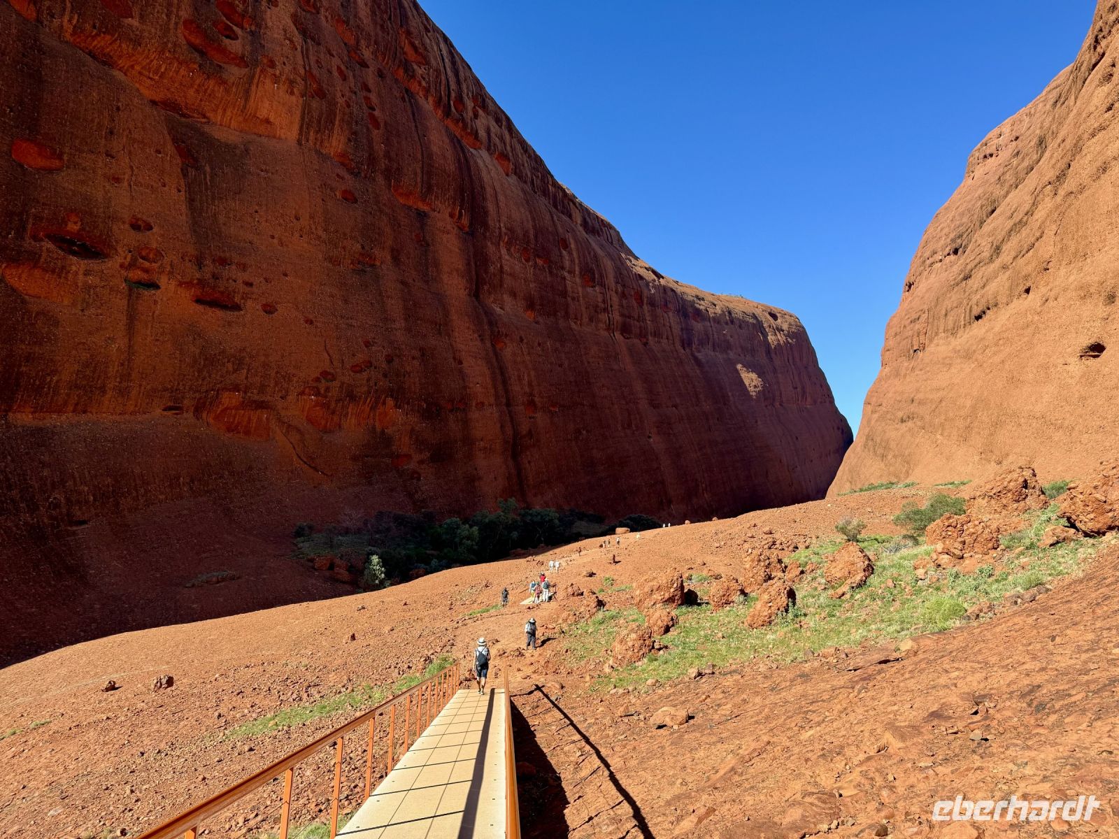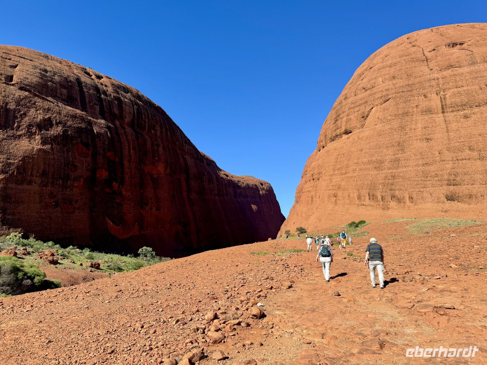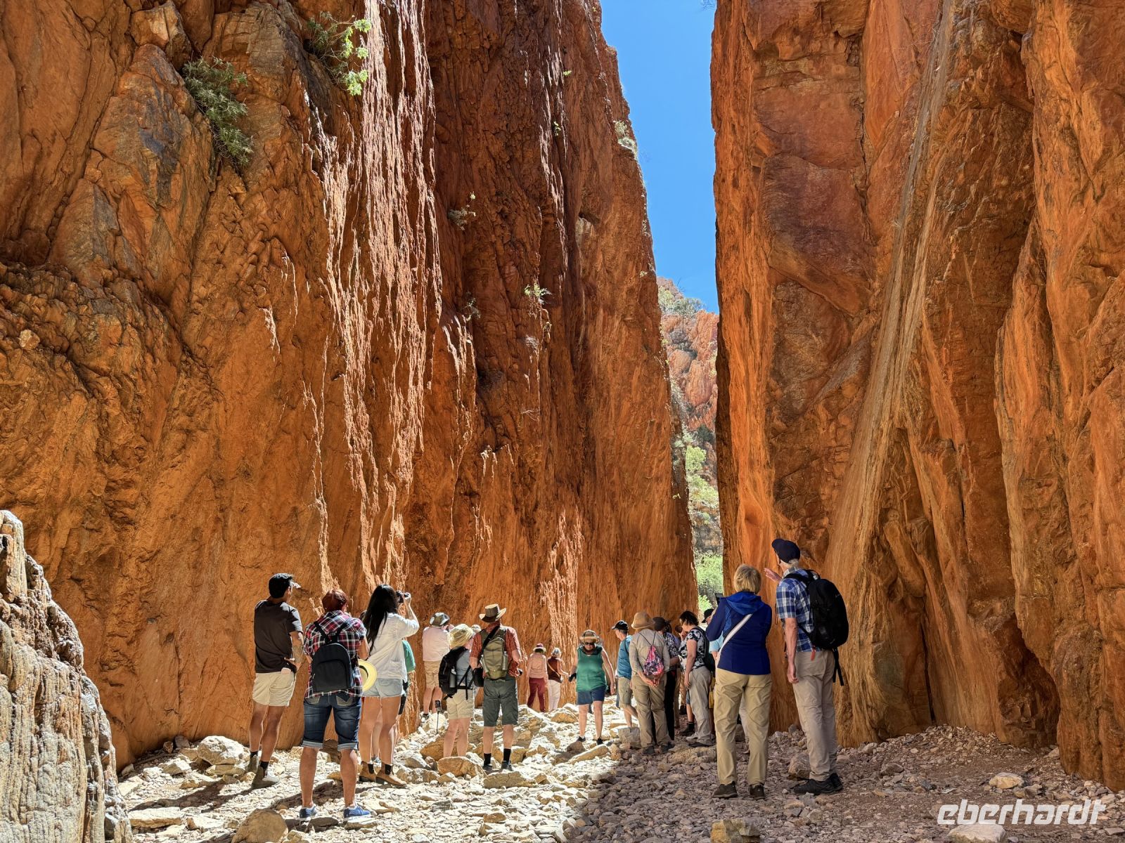 Noch einmal müssen wir zeitig aufstehen, um zum Flughafen zu fahren. Freundlicherweise schaltet das Hotel für uns die Kaffeemaschinen an und stellt zusätzlich zu unseren Frühstücksboxen eine Schüssel Obst und Croissants bereit. Unsere Fahrerin Benny steht pünktlich bereit und bringt uns zum Airport. Damit endet unser Besuch des schönen Bundesstaates Victoria, meiner Wahlheimat 2013/2014. Die Fluggesellschaft für unseren Flug ins Northern Territory ist diesmal Jetstar und wir haben ein kleines Guthaben an Bord, das wir für Snacks und Getränke ausgeben können. Im roten Zentrum erwarten uns unsere örtliche Reiseleiterin Eve und unser Fahrer Andrew. Beide werden uns zum Uluru und bis nach Alice Springs begleiten. Doch zuerst fahren wir zu unserem Hotel in Yulara, wo wir bereits einchecken und uns am Kiosk mit einem Salat oder Pommes stärken können. Für unser Nachmittags- und Abendprogramm brauchen wir noch viel Kraft. Wir fahren in den Nationalpark und schauen uns als thematischen Einstieg das Kulturzentrum an, welches uns die Bedeutung des Uluru und seiner Umgebung für die lokalen Aborigines vermittelt. Im Anschluss ist unsere Konstitution gefragt. Andrew fährt uns zur Felsformation Kata Tjuta, den vielen Köpfen, und wir machen einen Spaziergang in die Walpa Gorge. Wir haben Glück, dass die Temperaturen bei unserem Aufenthalt im Roten Zentrum mit 28 bis 30 Grad vergleichsweise mild sind. Trotzdem brennt die Sonne unbarmherzig auf uns herab und wir werden von vielen neugierigen Fliegen verfolgt. Zum Glück sind wir vorbildlich mit Hüten und Fliegennetzen ausgestattet. In der Schlucht selbst ist es dank des Schattens und leichten Windes sehr angenehm. Interessiert studieren wir das rote Konglomerat aus Sandstein, Granit und Basalt, aus dem Kata Tjuta besteht. Auf dem Rückweg Richtung Uluru halten wir an einem Aussichtspunkt, der uns einen herrlichen Panoramablick auf Kata Tjuta gewährt. Höhepunkt des Tages ist dann aber der Sonnenuntergang am Uluru. Sekt und Snacks stehen für uns bereits bereit. Wir knipsen schnell ein paar Erinnerungsfotos, bevor das beeindruckende Farbenspiel so richtig losgeht. Es liegt nicht nur am Sekt, den Eve fleißig nachschenkt, dass wir auf der Rückfahrt nach Yulara regelrecht aufgeputscht sind. Das Naturspektakel hat uns alle begeistert. Und überhaupt: Wir sind im Outback, im Zentrum Australiens, am Uluru! Für meine Gäste geht damit ein großer Traum in Erfüllung. Beim BBQ-Abendessen im Hotel ist der Sonnenuntergang natürlich Gesprächsthema Nummer Eins. Als i-Tüpfelchen haben wir die einmalige Chance, den Sternenhimmel der Südhalbkugel zu bewundern. Wir sehen deutlich das Band der Milchstraße und auch das Kreuz des Südens!