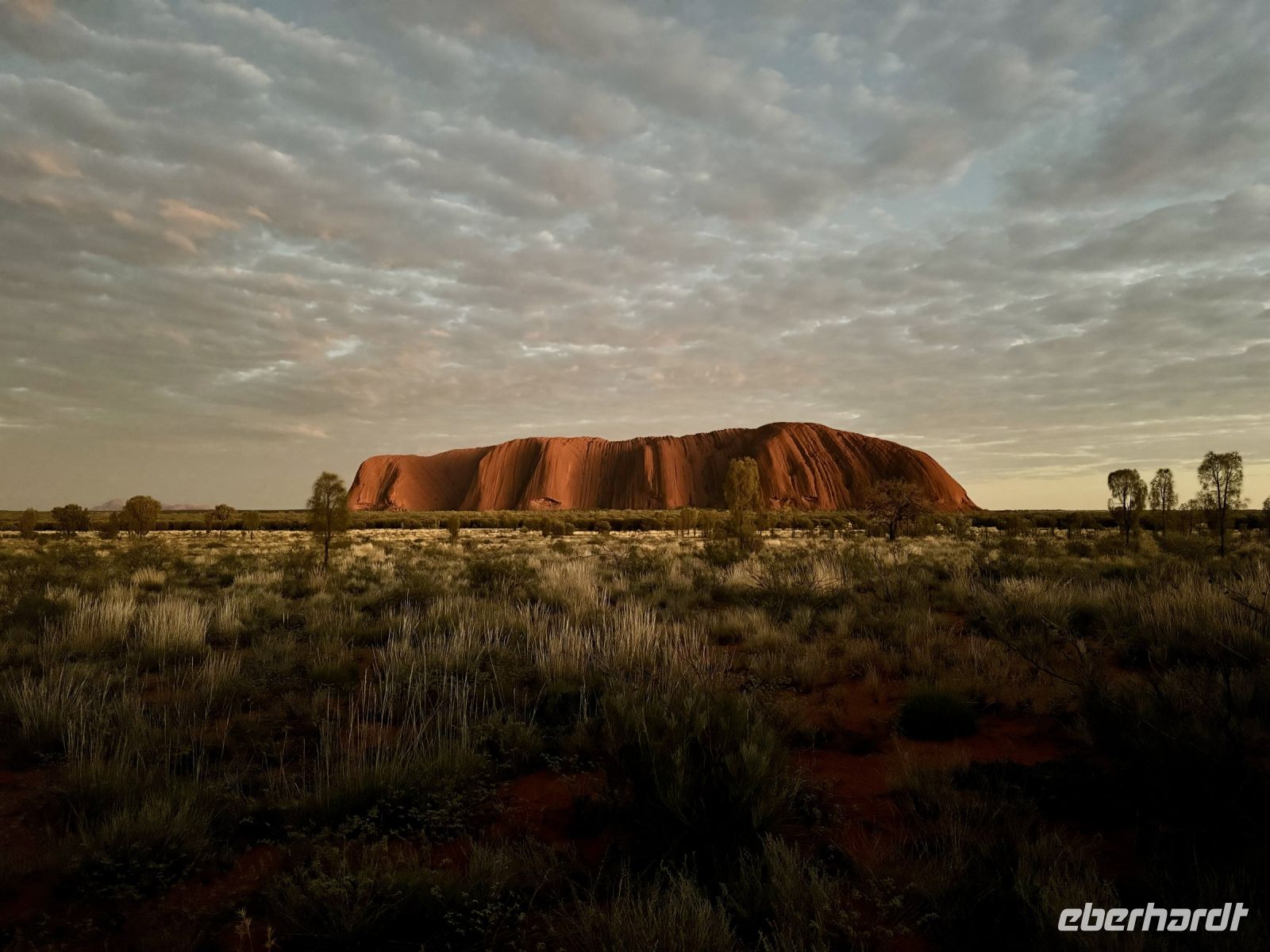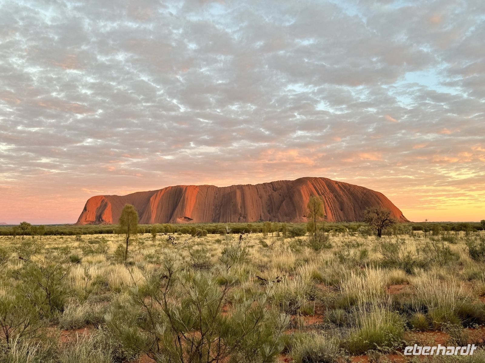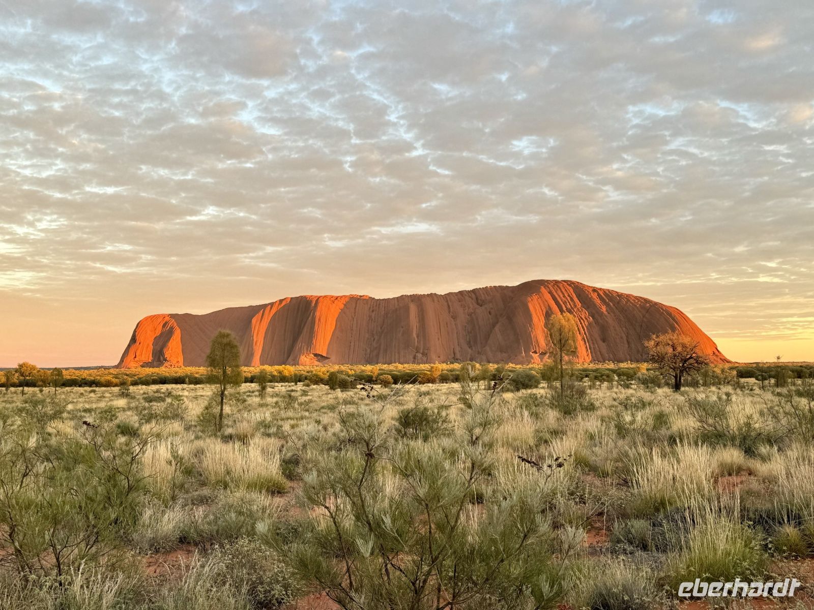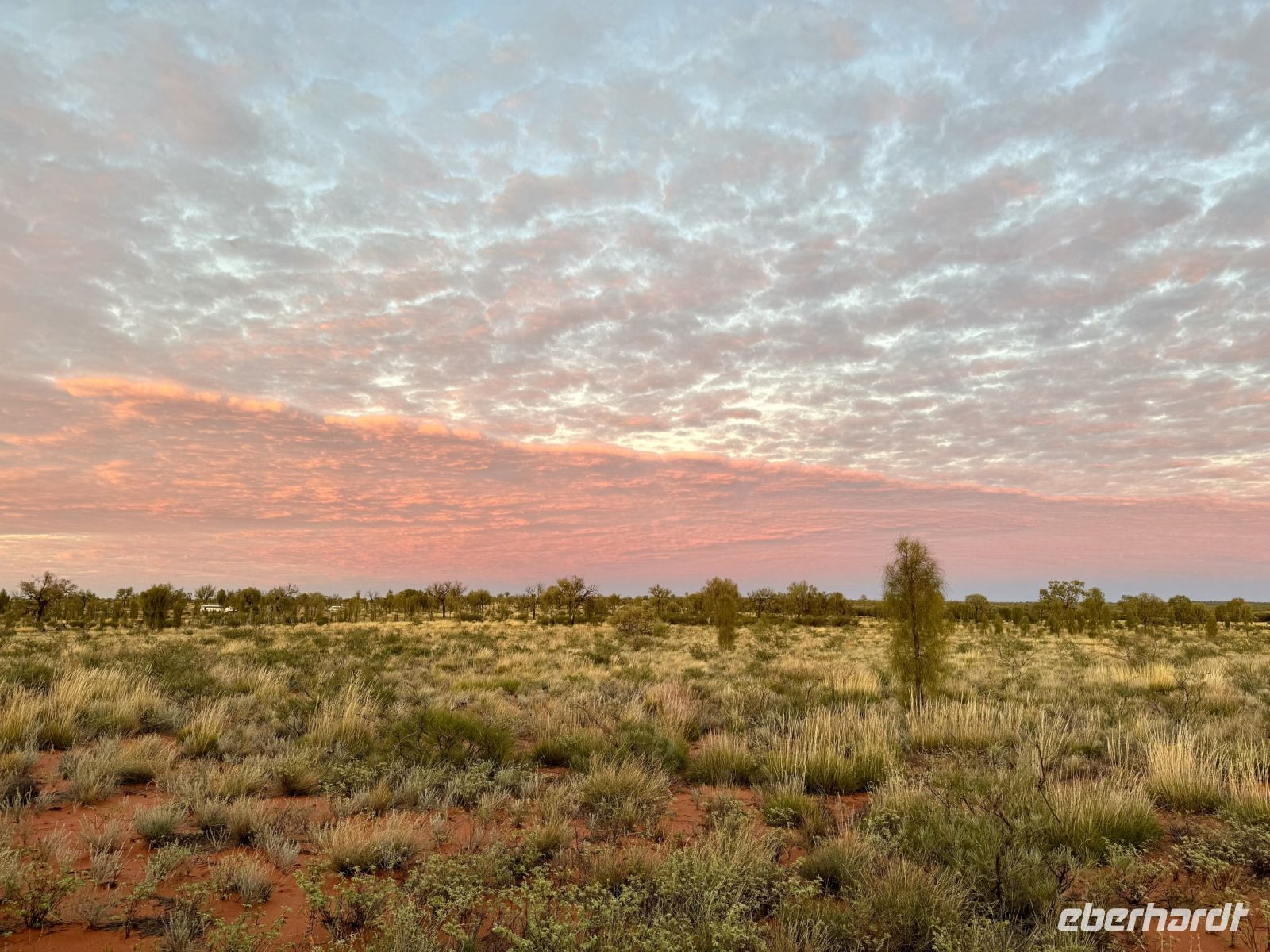 Heute ist wohl der einzige Tag auf der Reise, an dem wir freiwillig und mit großer Vorfreude und Begeisterung ganz zeitig aufstehen, denn wir wollen uns den Sonnenaufgang am Uluru anschauen! Schon allein für die Farbenspiele am Himmel hat sich das frühe Aufstehen gelohnt. Dann treffen die Strahlen der Morgensonne auf den Uluru und lassen ihn rot-orange aufleuchten. Herrlich! Warum der Uluru für die Aborigines ein heiliger Ort ist, können wir nach diesem Morgen gut verstehen. Eve entführt uns beim nachfolgenden Spaziergang zum Wasserloch auch in die Traumzeit und lässt die alten Sagen und Legenden, z. B. die Geschichte der Kunja-Schlange, auferstehen. Doch der Uluru war und ist nicht nur ein Heiligtum, sondern auch ein ritueller Ort, an dem Menschen wirklich lebten und ihren Glauben praktizierten. Die wellenförmige „Höhle“ der Frauen dürfen wir betreten; andere Stätten sind nur den Einheimischen vorbehalten. Und den Aufstieg können wir zwar noch erkennen, aber er ist seit einigen Jahren endgültig verboten, nachdem höfliches Bitten nicht geholfen hat. Inzwischen macht sich aber doch ein leichtes Hungergefühl im Bauch bemerkbar, weshalb wir zum Frühstück in unser Hotel zurückkehren. Dann starten wir auf die lange Fahrt nach Alice Springs, erst auf dem Lasseter Highway nach Westen, dann auf dem Stuart Highway nach Norden. Am Mount Conner Lookout machen wir unterwegs den ersten kleinen Fotostopp, gefolgt von einer Mittagspause am Erldunda Roadhouse, wo es auch ein paar Emus zu fotografieren gibt. In Alice Springs angekommen, besuchen wir gleich den Geburtsort der größten Stadt im Outback, die historische Telegrafenstation mit ihrer ambivalenten Geschichte. Heute ein sehr friedliches Fleckchen Erde, das uns Einblicke in das Leben der weißen Siedler/Pioniere von vor rund 150 Jahren gewährt. Vom Anzac Hill haben wir dann eine schöne Aussicht auf Alice Springs. Heute ist der Luxuszug „The Ghan“ im Ort; wir können die lange silberne Linie am Bahnhof von hier oben deutlich sehen. Schließlich beziehen wir für die nächsten beiden Nächte unsere Zimmer im Hotel und lassen den zweiten Abend im „Roten Zentrum“ ganz gemütlich ausklingen – morgen dürfen wir mal wieder etwas länger schlafen!