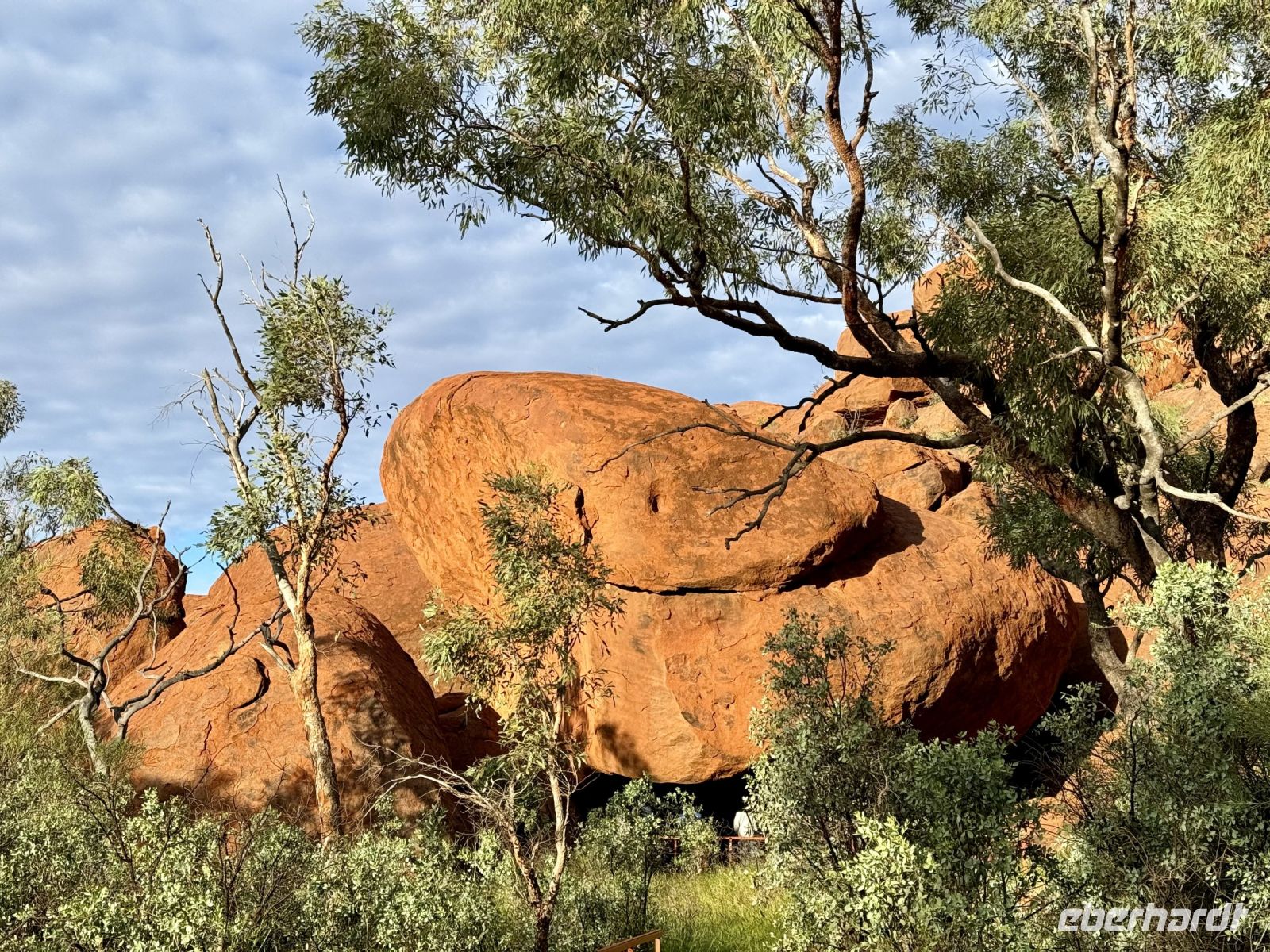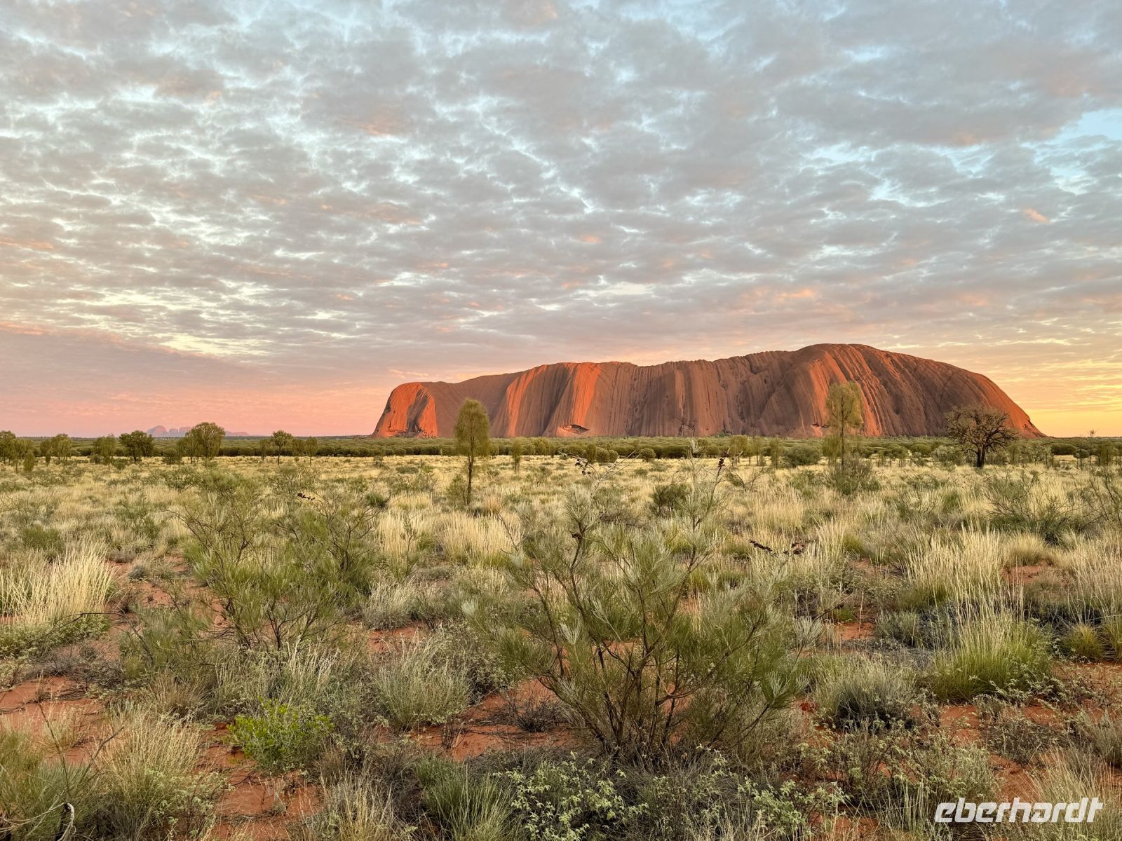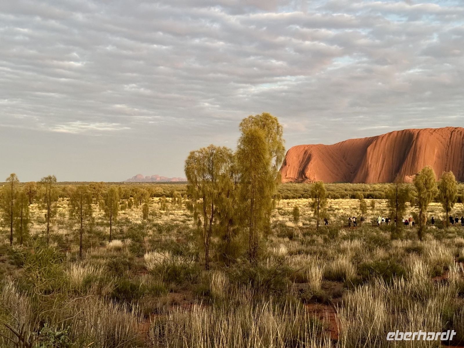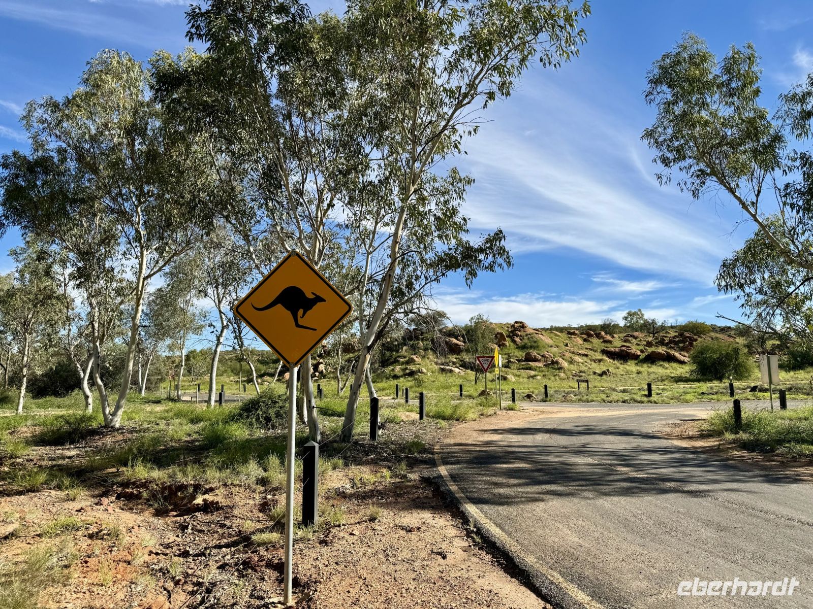 Heute ist wohl der einzige Tag auf der Reise, an dem wir freiwillig und mit großer Vorfreude und Begeisterung ganz zeitig aufstehen, denn wir wollen uns den Sonnenaufgang am Uluru anschauen! Schon allein für die Farbenspiele am Himmel hat sich das frühe Aufstehen gelohnt. Dann treffen die Strahlen der Morgensonne auf den Uluru und lassen ihn rot-orange aufleuchten. Herrlich! Warum der Uluru für die Aborigines ein heiliger Ort ist, können wir nach diesem Morgen gut verstehen. Eve entführt uns beim nachfolgenden Spaziergang zum Wasserloch auch in die Traumzeit und lässt die alten Sagen und Legenden, z. B. die Geschichte der Kunja-Schlange, auferstehen. Doch der Uluru war und ist nicht nur ein Heiligtum, sondern auch ein ritueller Ort, an dem Menschen wirklich lebten und ihren Glauben praktizierten. Die wellenförmige „Höhle“ der Frauen dürfen wir betreten; andere Stätten sind nur den Einheimischen vorbehalten. Und den Aufstieg können wir zwar noch erkennen, aber er ist seit einigen Jahren endgültig verboten, nachdem höfliches Bitten nicht geholfen hat. Inzwischen macht sich aber doch ein leichtes Hungergefühl im Bauch bemerkbar, weshalb wir zum Frühstück in unser Hotel zurückkehren. Dann starten wir auf die lange Fahrt nach Alice Springs, erst auf dem Lasseter Highway nach Westen, dann auf dem Stuart Highway nach Norden. Am Mount Conner Lookout machen wir unterwegs den ersten kleinen Fotostopp, gefolgt von einer Mittagspause am Erldunda Roadhouse, wo es auch ein paar Emus zu fotografieren gibt. In Alice Springs angekommen, besuchen wir gleich den Geburtsort der größten Stadt im Outback, die historische Telegrafenstation mit ihrer ambivalenten Geschichte. Heute ein sehr friedliches Fleckchen Erde, das uns Einblicke in das Leben der weißen Siedler/Pioniere von vor rund 150 Jahren gewährt. Vom Anzac Hill haben wir dann eine schöne Aussicht auf Alice Springs. Heute ist der Luxuszug „The Ghan“ im Ort; wir können die lange silberne Linie am Bahnhof von hier oben deutlich sehen. Schließlich beziehen wir für die nächsten beiden Nächte unsere Zimmer im Hotel und lassen den zweiten Abend im „Roten Zentrum“ ganz gemütlich ausklingen – morgen dürfen wir mal wieder etwas länger schlafen!